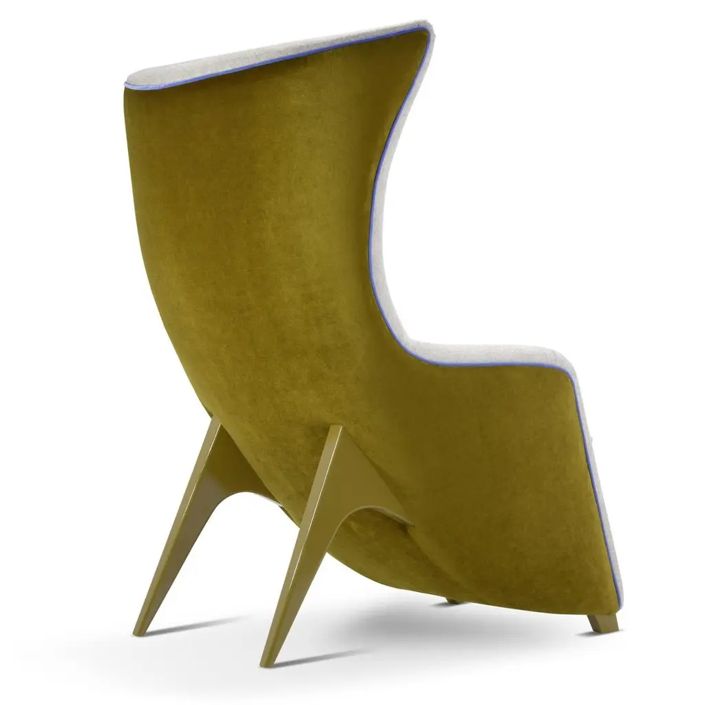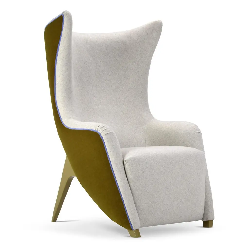 The armchair with wings returns with a futuristic look and cabriole legs, available in various types of wood. With a slender and enveloping form, the color is customizable with a choice of white, yellow, orange, red, purple, pink, gray, pale blue, blue, green, brown and black.