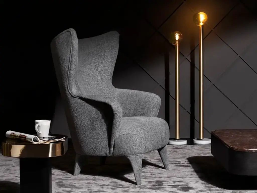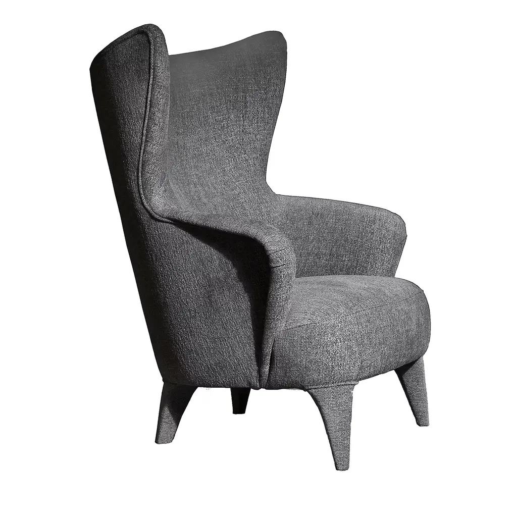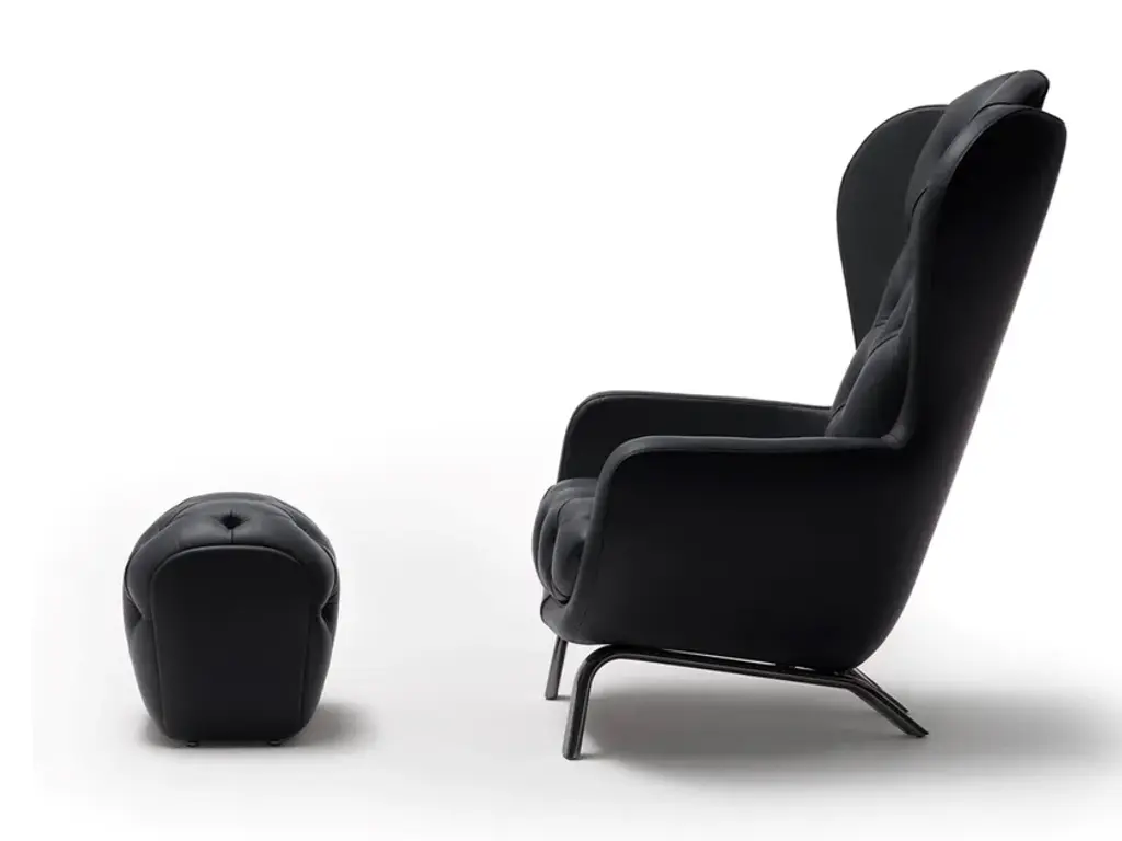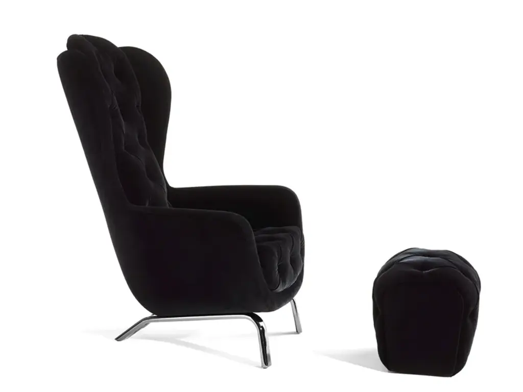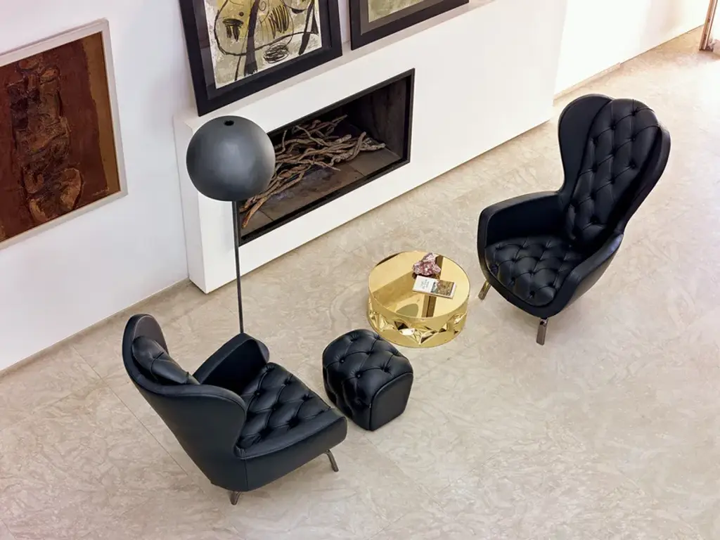 A cozy and comfortable bucket seat, a reassuring form with absolutely contemporary details: these are the main features of Guelfo, the wingback designed by Lapo Ciatti. Guelfo wingback and footstool were launched in 2015 with the aim to give a new, refined and innovative (sometimes ironic) style to the 18th century French archetype and like all the other pieces presented that year, they find source of inspiration in the Middle Ages and in the process of overcoming common knowledge.So we can find on the one hand the name Guelfo as an homage to one of the two opposite factions which during the Medieval times built the culture and history of the city of Florence, while on the other hand the ironic use of aesthetic standard of the past, here contaminated and updated with very contemporary details. A very sharp (and post modern) way of playing with uncommon combinations as the idea of using together a mixture of seemingly heterogeneous details and materials such as the capitonné work for the upholstery and black nickel for the structure.The wingback, as well as the footstool, can be upholstered in various types of fabric or leather. Guelfo, featuring great visual impact and scenic power, is the ideal choice to give a touch of personality to the most exclusive contract environment as well as to the finest residential areas. Perfect for those who want pieces of furniture ever protagonists, ever ordinary.Upholstered wingback with black nickel structure. Capitonné work. Non-removable upholstery. Upholsteries: various types of fabric and leather, customer fabric.