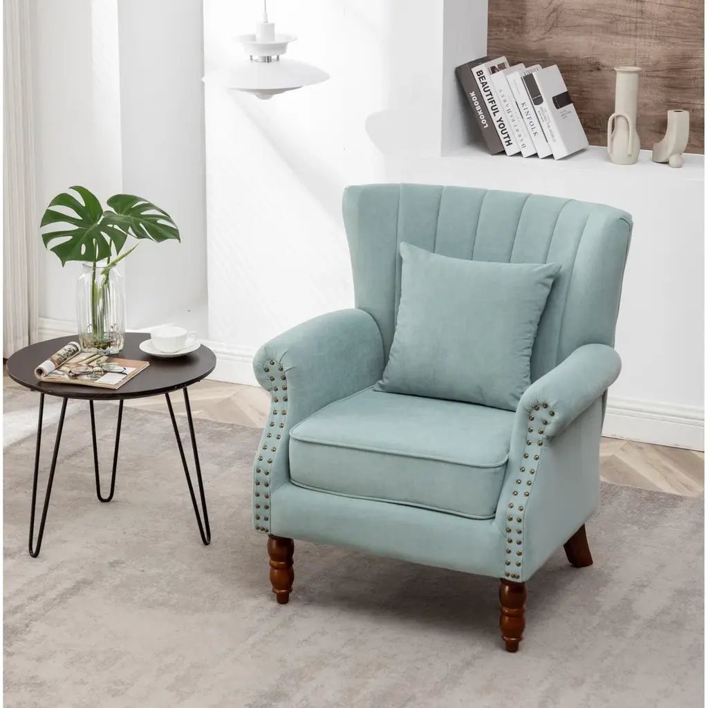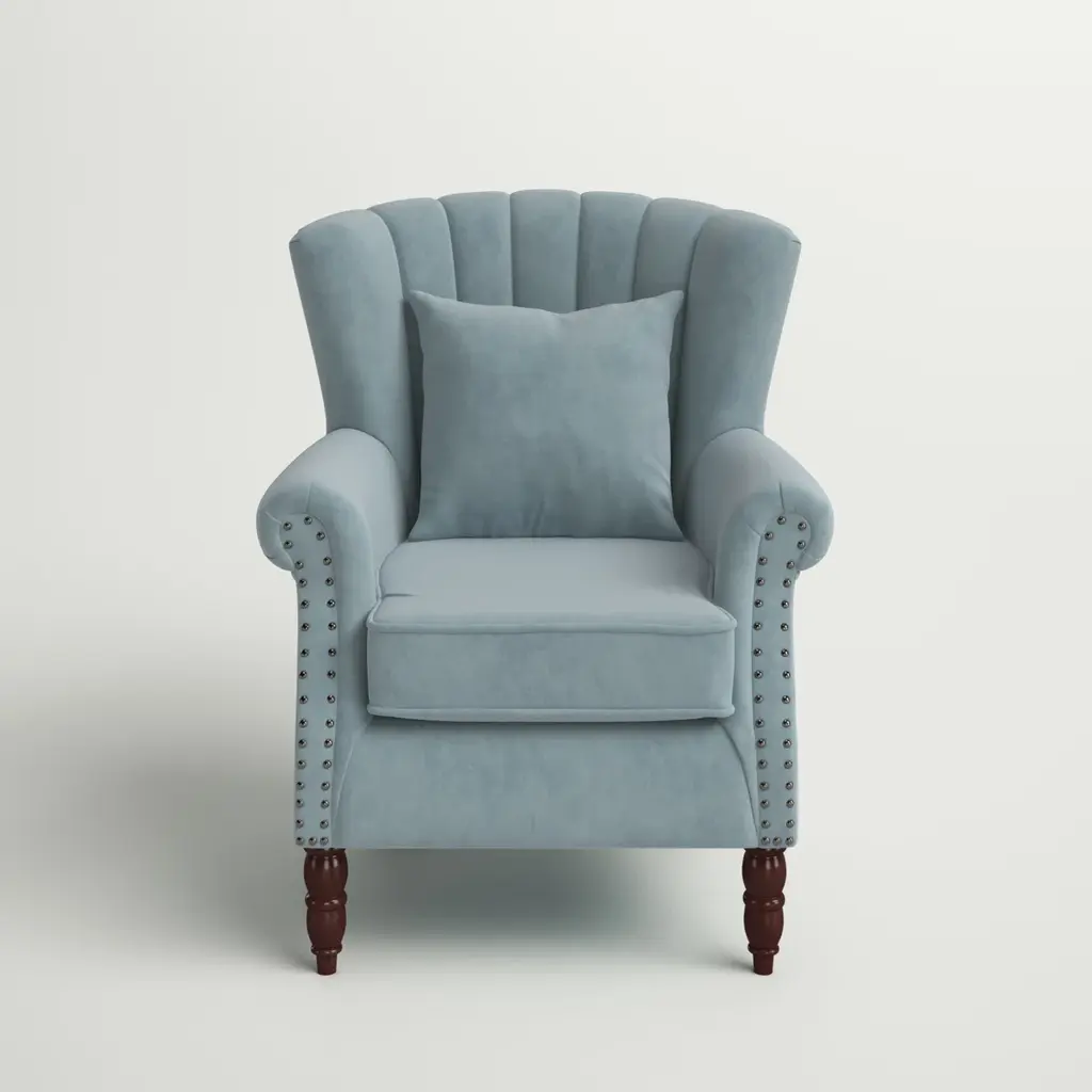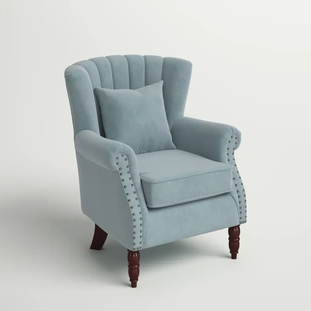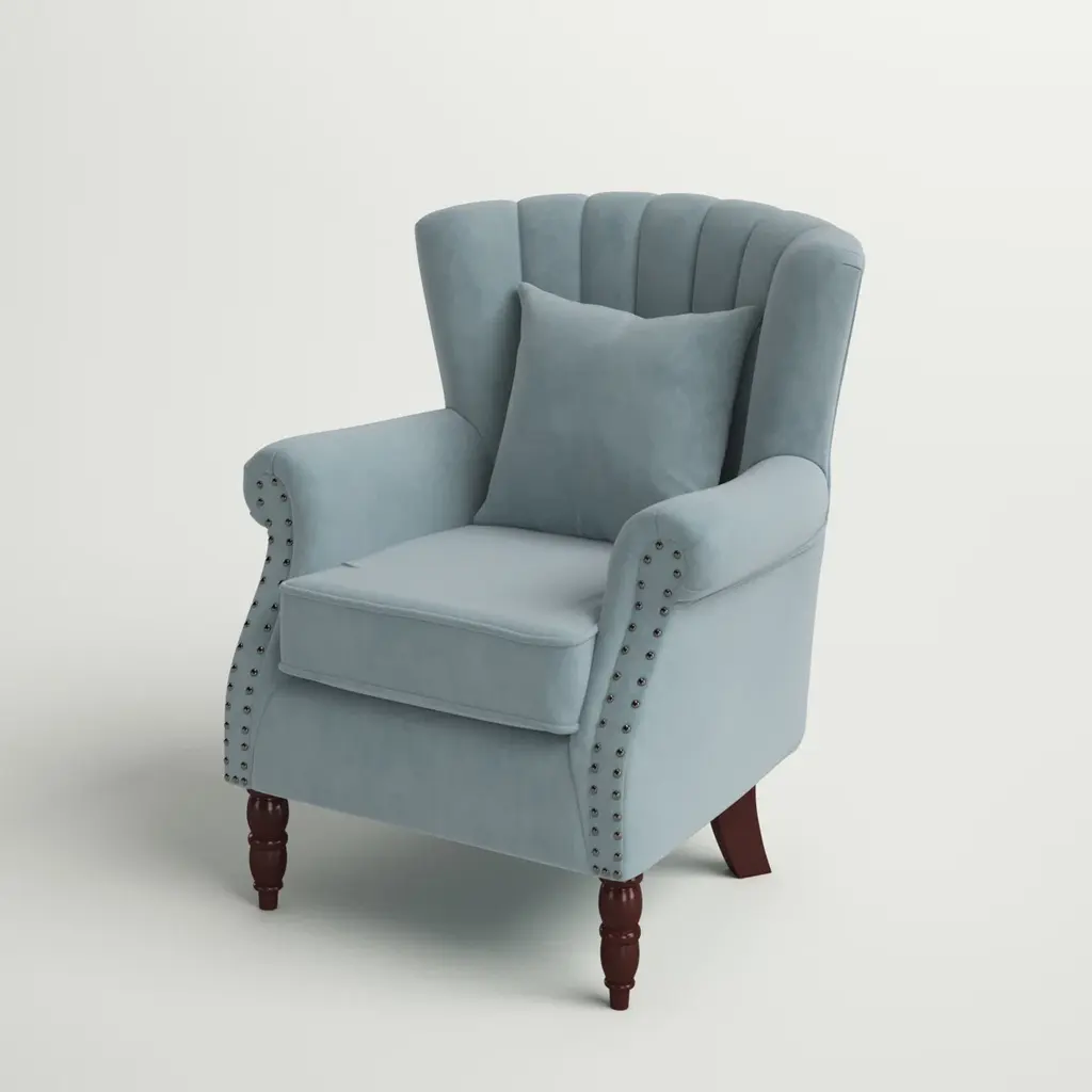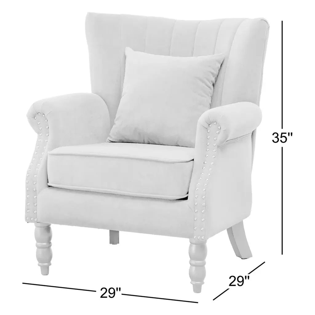 About This Product This wingback chair brings a traditional, elegant style to your space. It's built with a kiln-dried solid rubberwood wood frame that rests on classic turned legs in a rich finish. This chair is upholstered in luxe velvet, the seat is filled with fiber-wrapped foam, and sinuous springs support you as you relax. The channel tufting and nailhead trim add a tailored touch. Plus, its seat cushions are removable, so it's a breeze to clean. This chair comes with an extra toss pillow for a layer of texture. It has a weight capacity of 300 pounds. What's Included? Accent Pillows Not Included: Ottoman Features The tall curved backrest will supply seating in an upright position to encourage good posture. Moisture-repellent, stain-resistant, and heavy-duty wear live smart fabric cover.