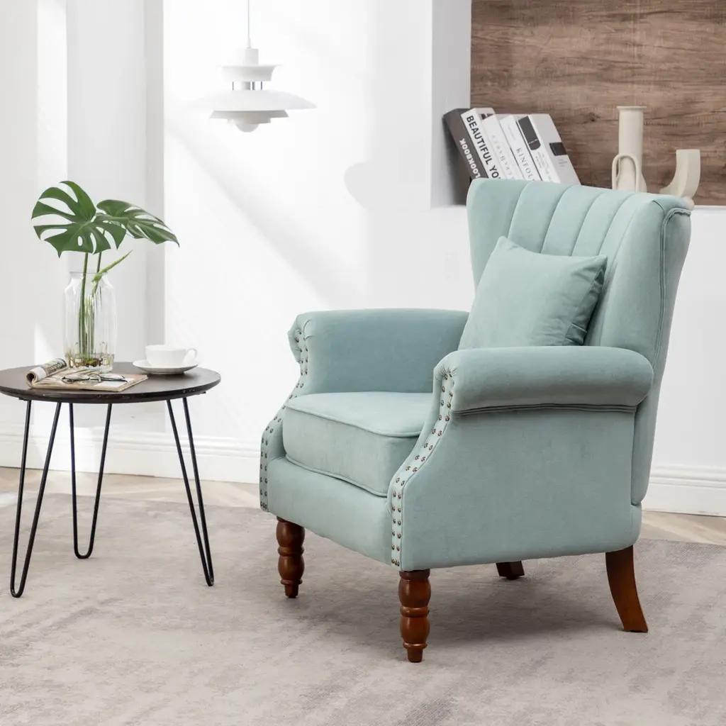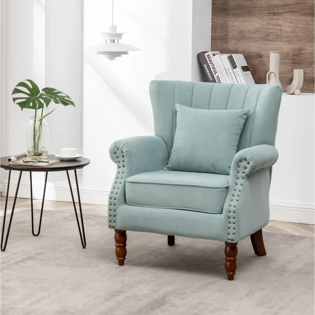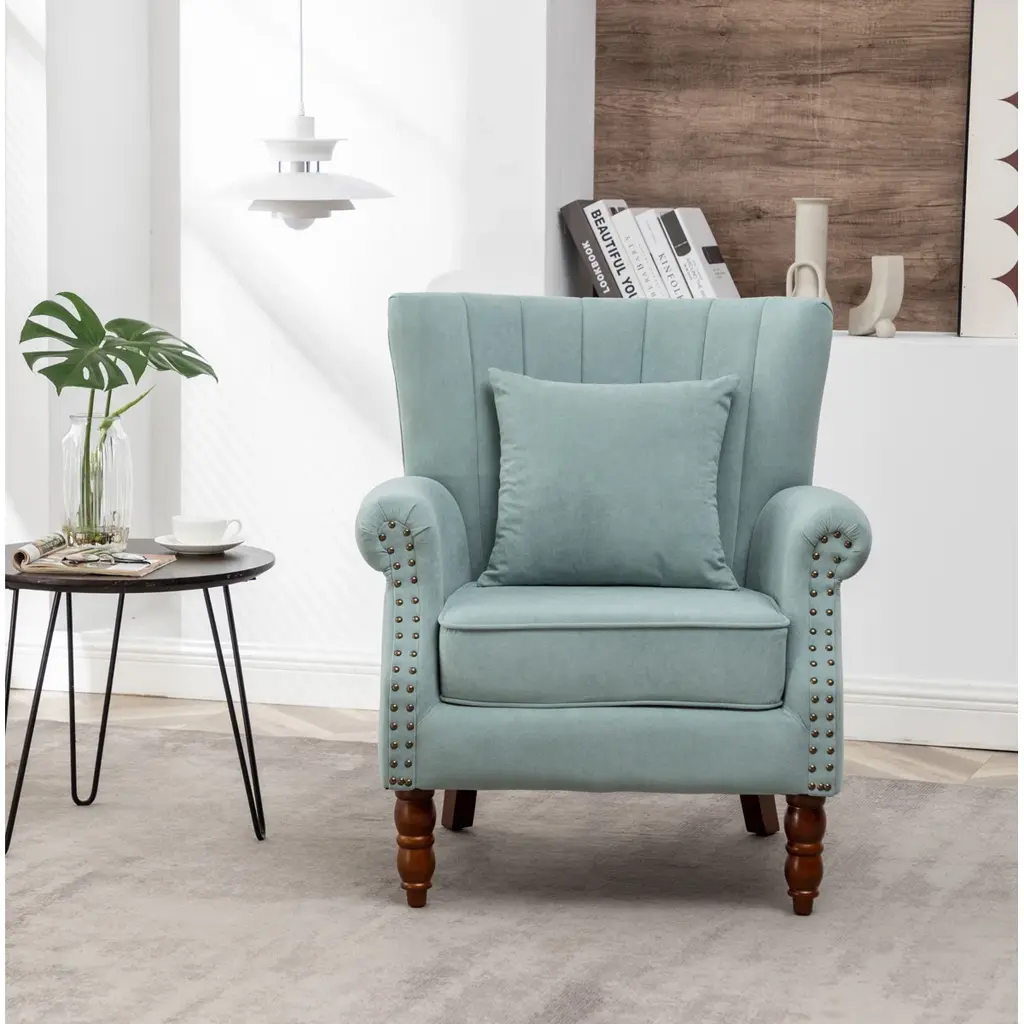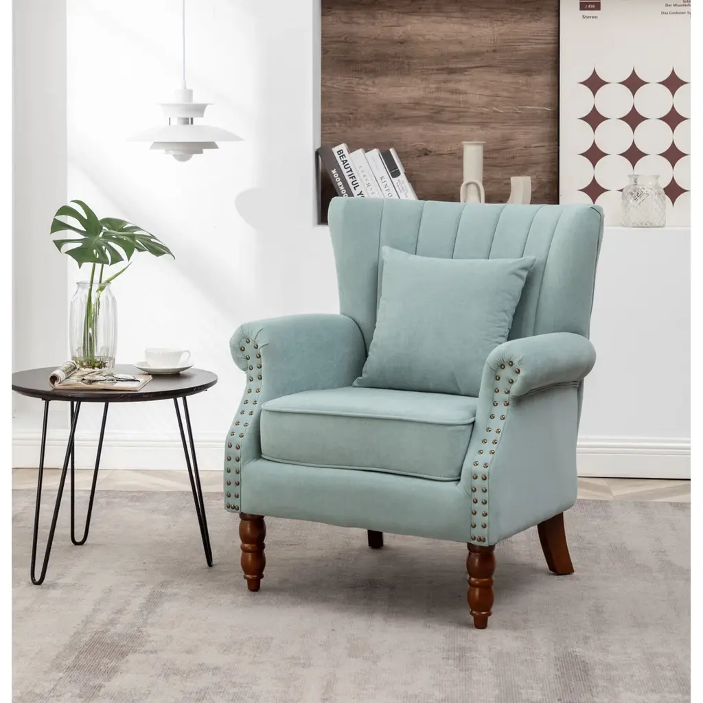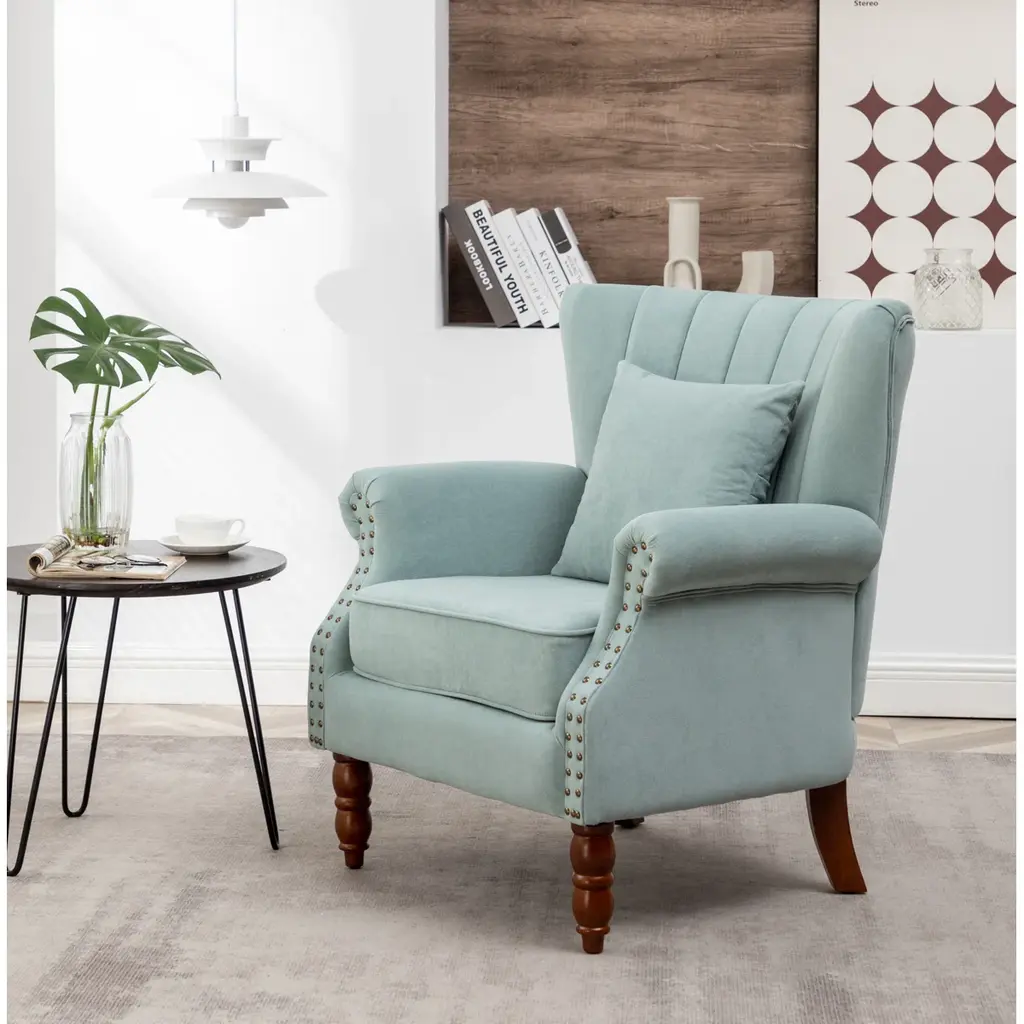 About This Product This wingback chair brings a traditional, elegant style to your space. It's built with a kiln-dried solid rubberwood wood frame that rests on classic turned legs in a rich finish. This chair is upholstered in luxe velvet, the seat is filled with fiber-wrapped foam, and sinuous springs support you as you relax. The channel tufting and nailhead trim add a tailored touch. Plus, its seat cushions are removable, so it's a breeze to clean. This chair comes with an extra toss pillow for a layer of texture. It has a weight capacity of 300 pounds. What's Included? Accent Pillows Not Included: Ottoman Features The tall curved backrest will supply seating in an upright position to encourage good posture. Moisture-repellent, stain-resistant, and heavy-duty wear live smart fabric cover.