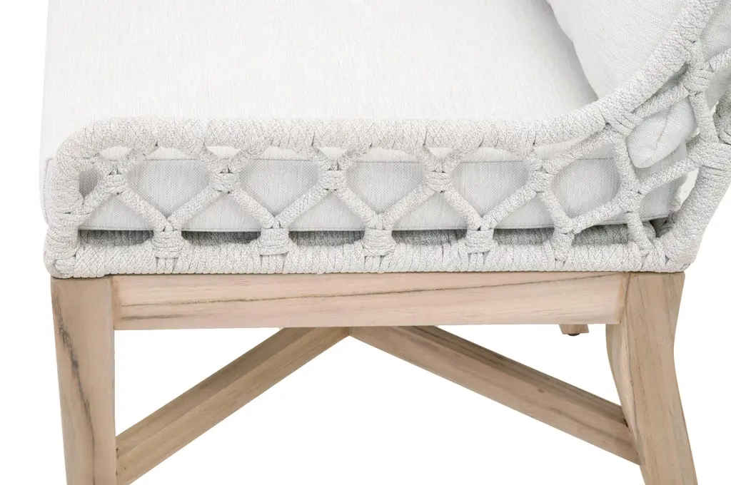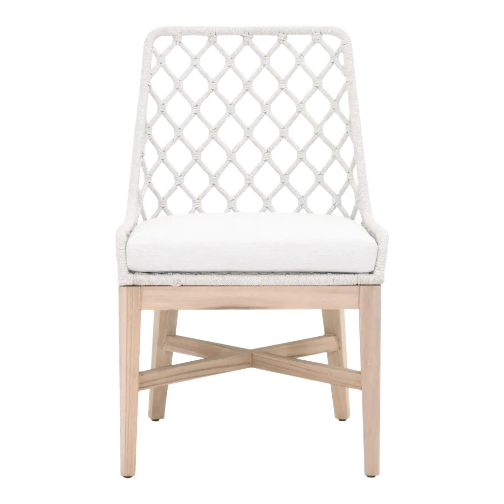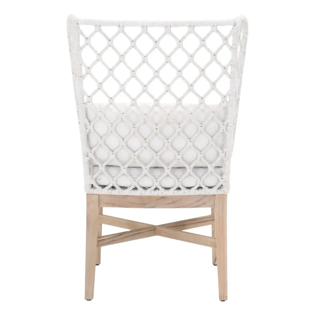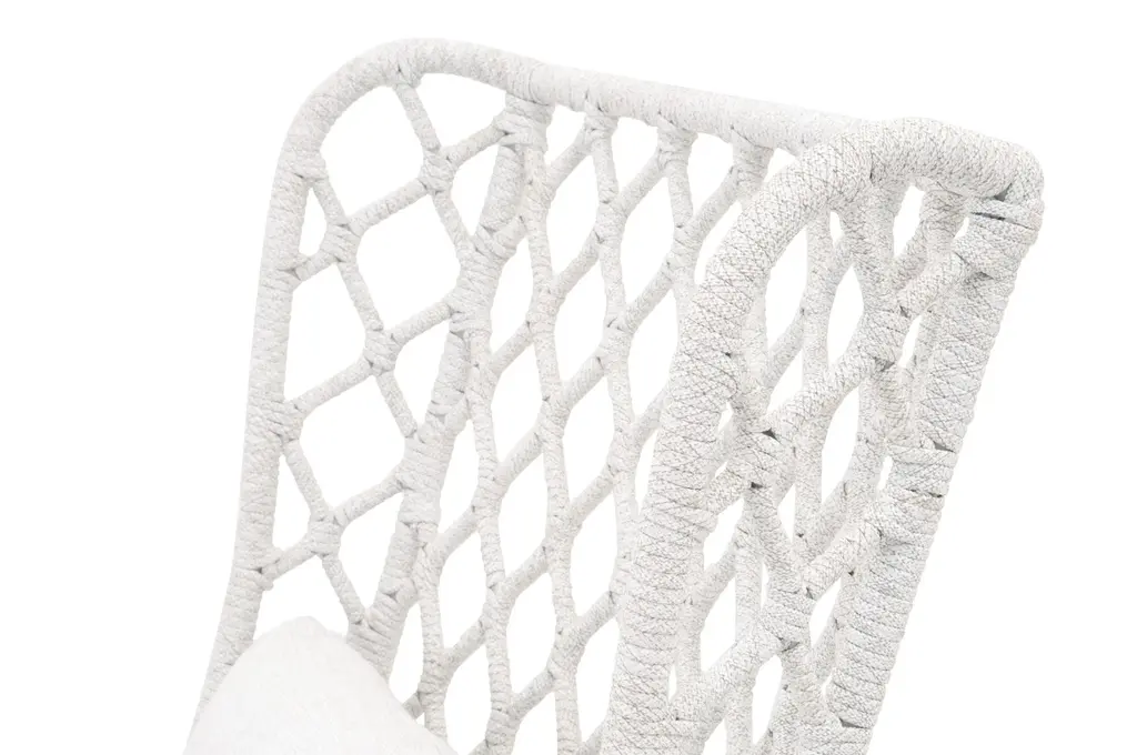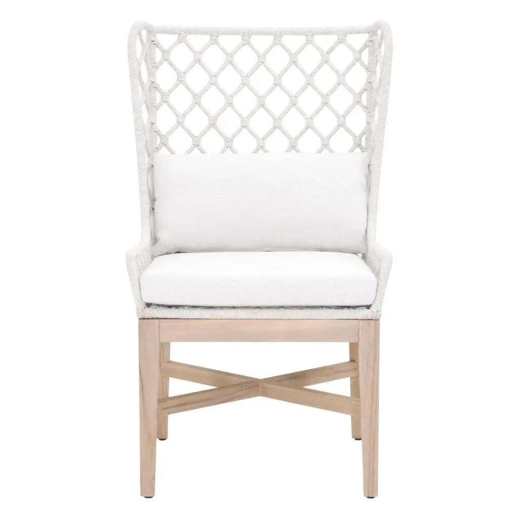 Set the tone of a casual beachy atmosphere with this rope outdoor wingback chair. This dining chair is carefully crafted with an aluminum frame in a lattice-like pattern covered with an intricately woven white rope material. It is constructed with solid gray teak legs that are suitable for outdoor or indoor use. Its removable seat cushion and lumbar pillow are made of an olefin fabric that is weather resistant and can sustain through light weather conditions (the cushion and pillow should be stored away in extreme weather conditions and heavy rain). Furnish your dining room or outdoor dining set with this coastal-inspired wingback dining chairs.