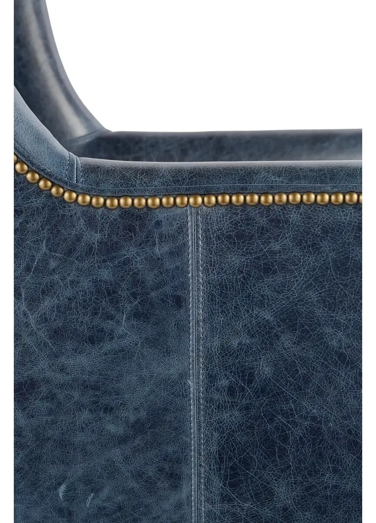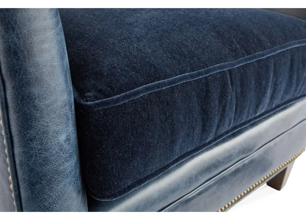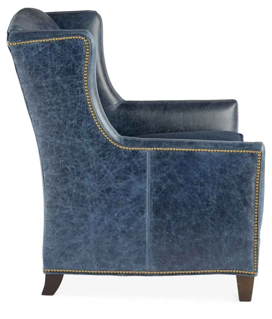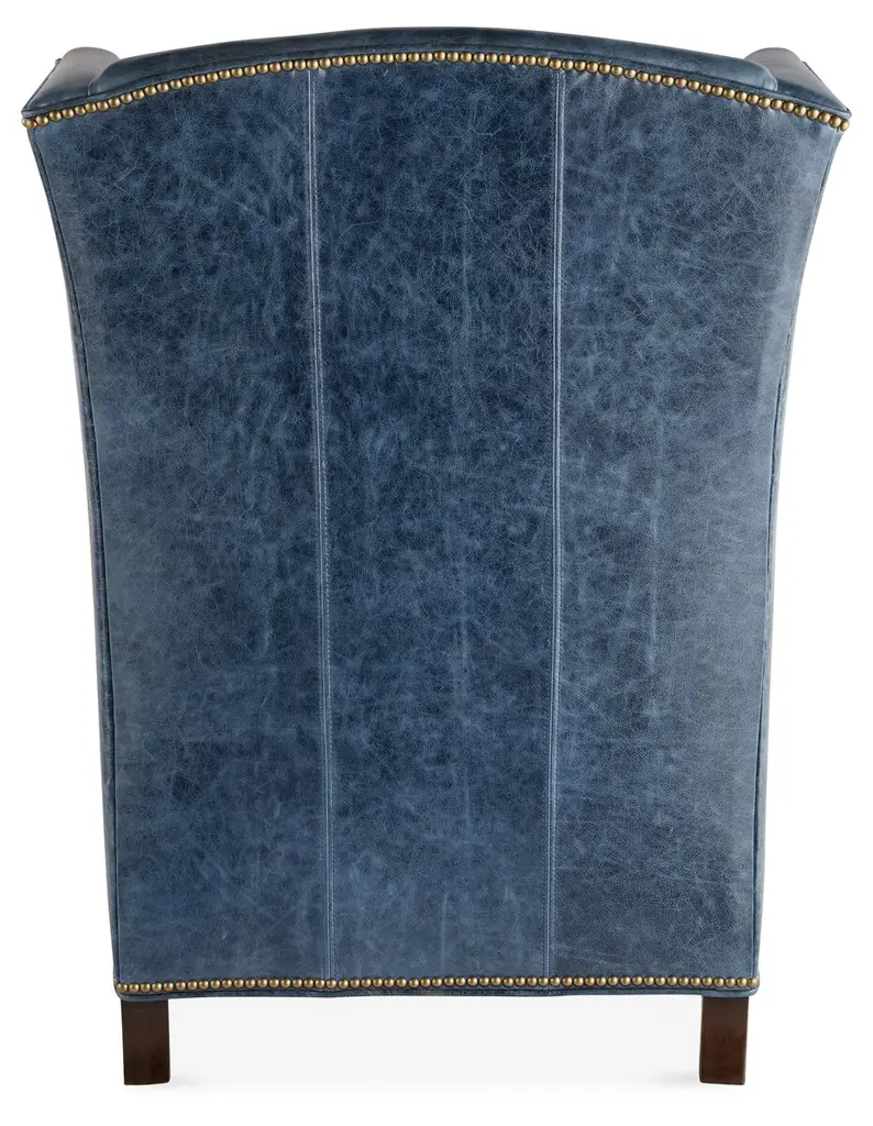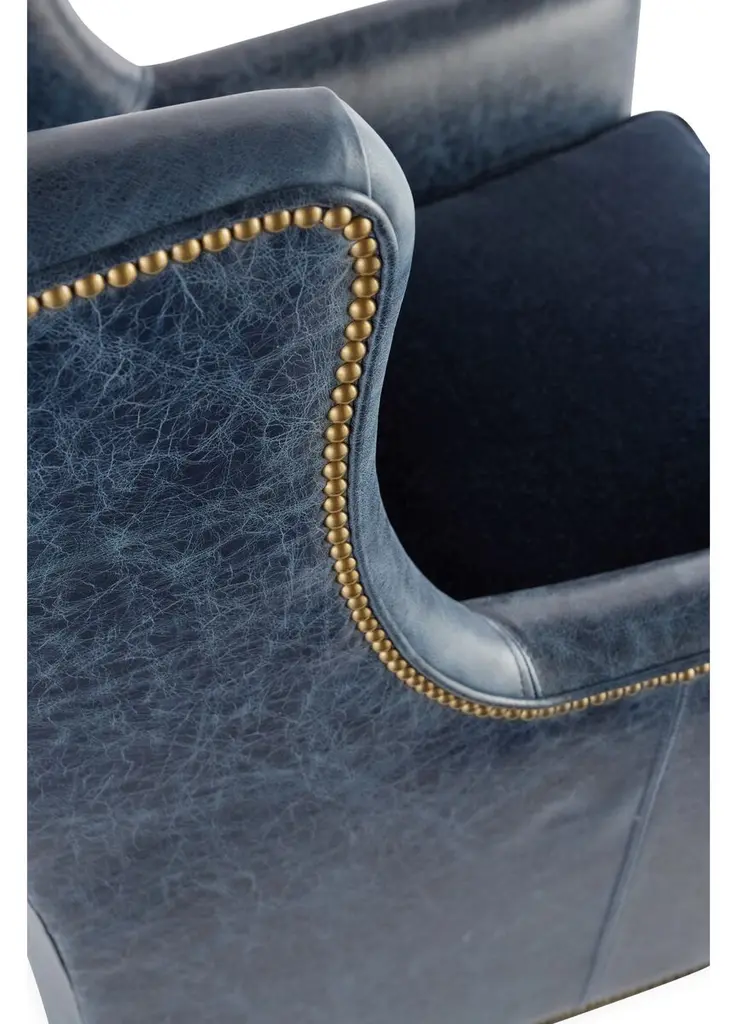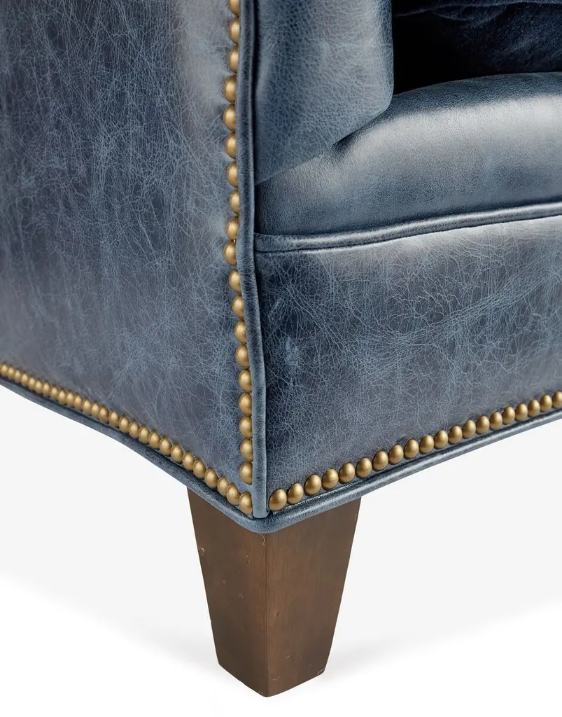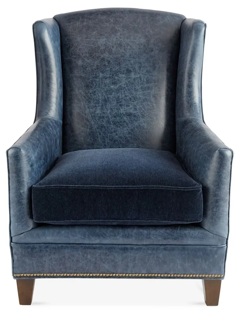 Pierced with brass nailheads, this cozy club chair feels timelessly elegant with its wingback silhouette and tapered hardwood legs. Dressed in supple leather upholstery and a velvet cushion with foam padding enveloped in down with a cotton duck core, it ensures outstanding comfort and support.