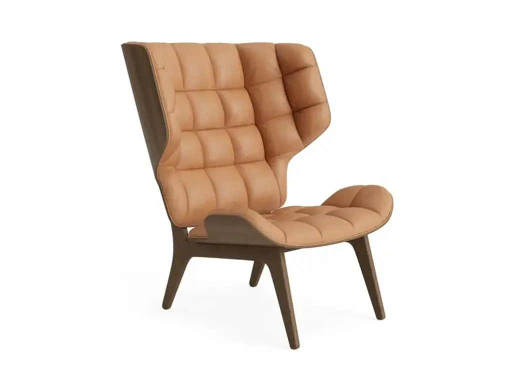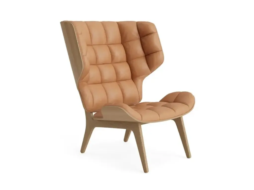 Mammoth is an armchair with oak structure and leather padding.The Mammoth chair is designed by the Danish designer Rune Krøjgaard and Norwegian designer Knut Bendik Humlevik, the Mammoth Chair is a welcoming modern wing chair. The wings extend outwards from the back of the seat, creating a pleasant homelike feeling. Rune’s passion for shapes and specific manufacturing techniques coupled with Knut’s pursuit to create stylish yet functional furniture manifest themselves in the Mammoth Chair. The seat and back are formed from the same compression mold, giving the chair its signature clean minimalistic look. The high back, hugging wings and fluffy upholstery provide superior comfort and sense of privacy, whether relaxing at home or lounging with others. The Mammoth Chair is hand-crafted, using solid oak wood for its frame and oak veneer for the seat and back. The frame comes in multiple colorways; natural, smoked, dark stained and black, upholstered in enormous variations of fabrics and leathers.“For me functionality is a key factor, and can never be ignored, so if I can achieve pure style and functionality in a product, I'm glad.” - Knut Bendik HumlevikFRAME: Solid oak frame, seat and back of laminated oak veneer.FRAME VARIATIONS: Natural, Black, Dark Stained, Smoked Oak