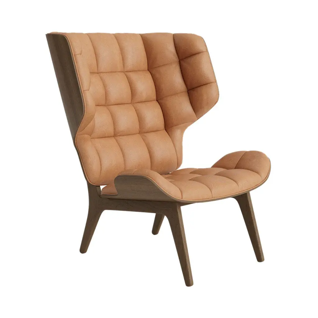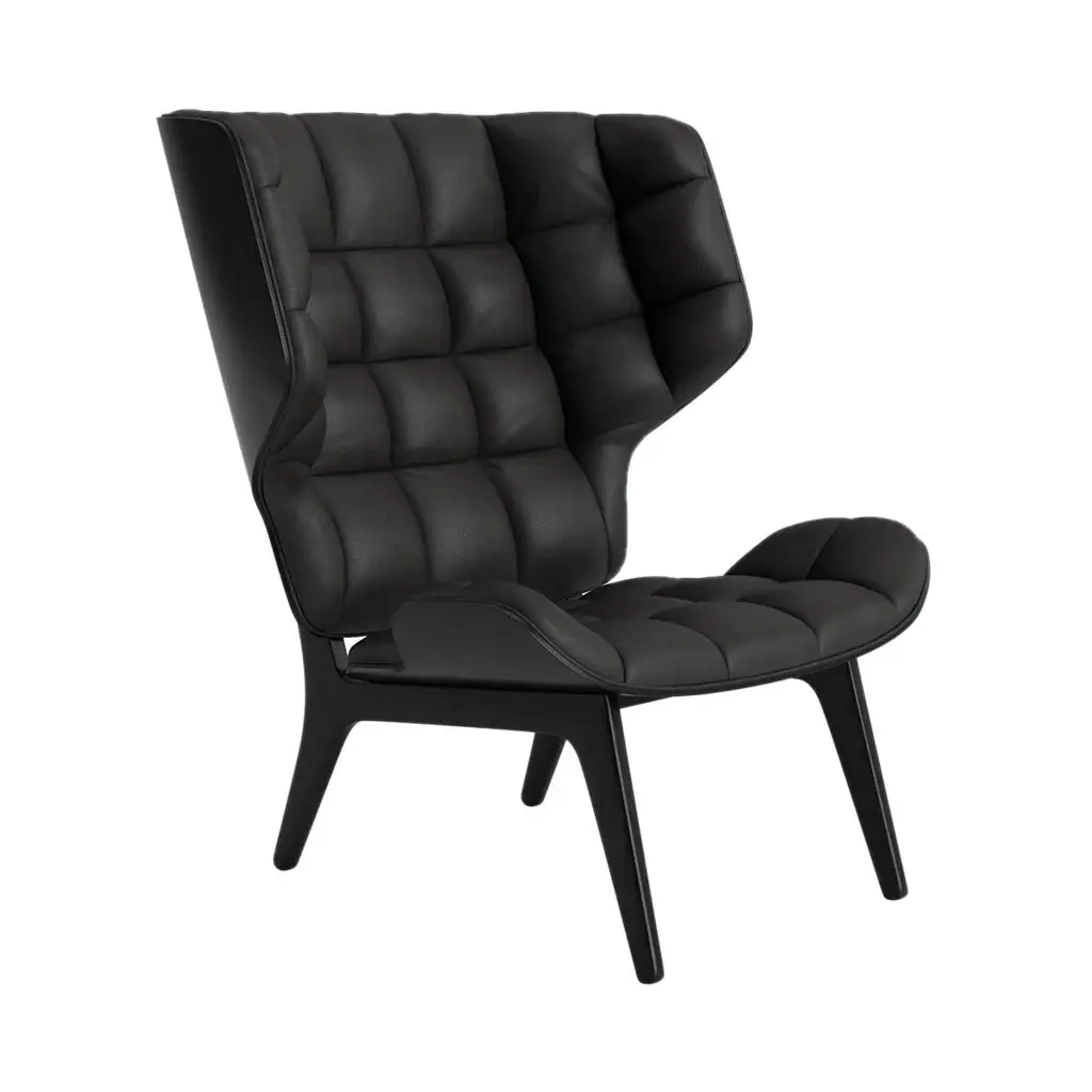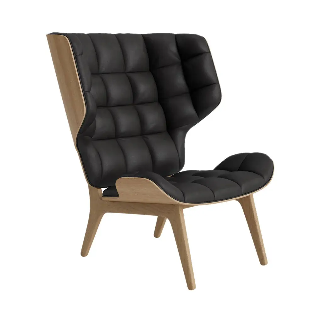 The Mammoth Lounge Chair features a high back and winged design, offering comfort and a sense of privacy that makes it ideal for hotel lobbies, offices, or homes. Its seat and back are made using a single compression mold blending modern design with traditional wingback chair elements. The front upholstered version is available in a wide range of luxurious fabric and leather. The Mammoth Chair is crafted with solid oak wood for its frame and laminated oak veneer for the seat and back. Available in 4 oak finishes.