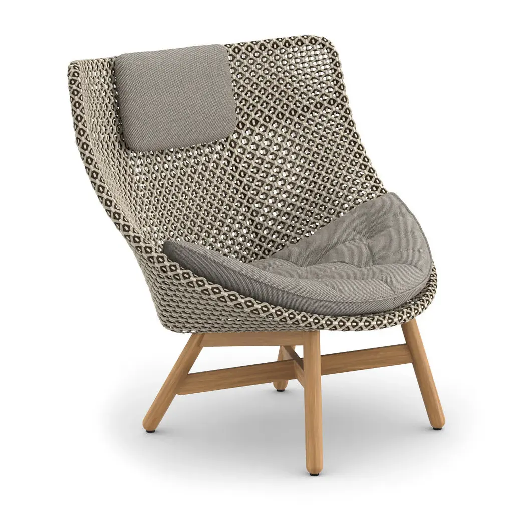 Enjoy total relaxation in the MBRACE Wing Chair from Dedon. An exceptionally comfortable lounge chair design, this wingback-style seat features a solid teak wood base topped with a woven fiber silhouette. Elevated with a plush seat and headrest cushion, this chair is ideal for relaxing on a front porch or engaging in conversation with friends and family on the back deck.Highlights