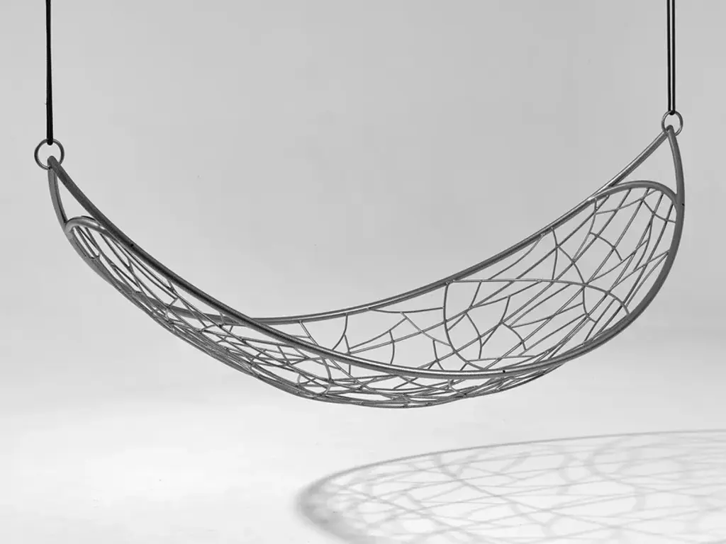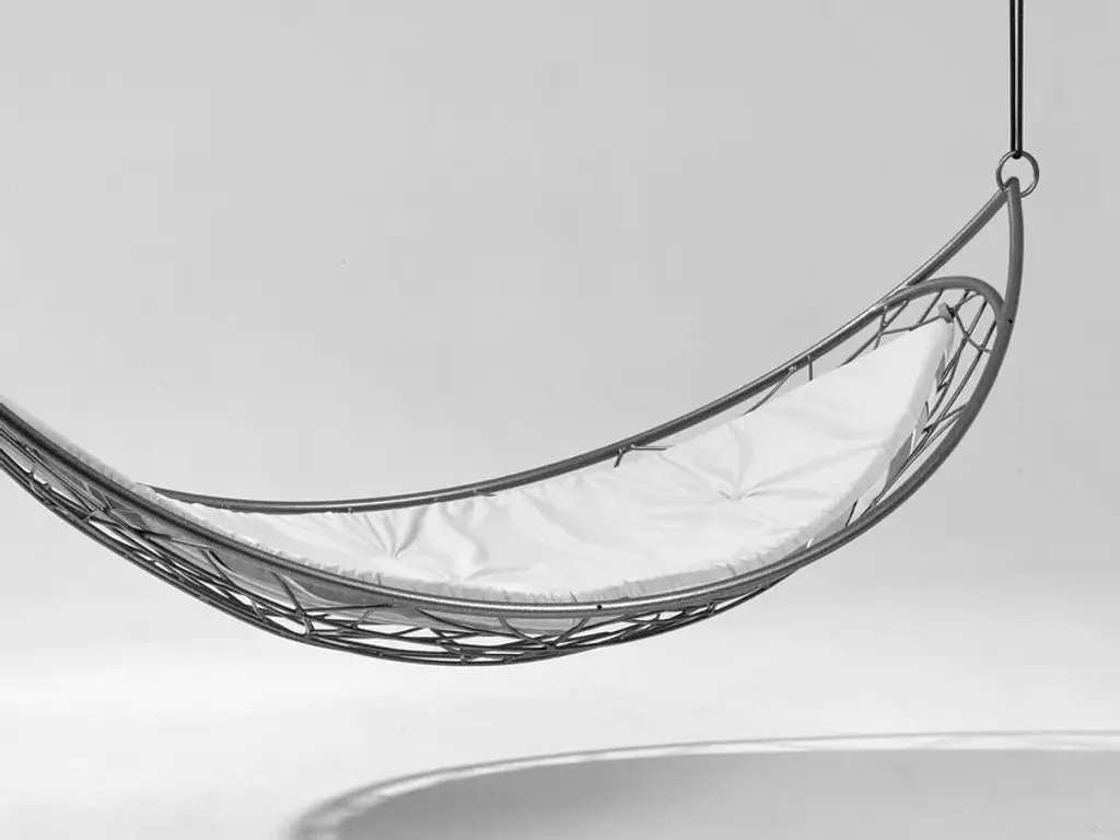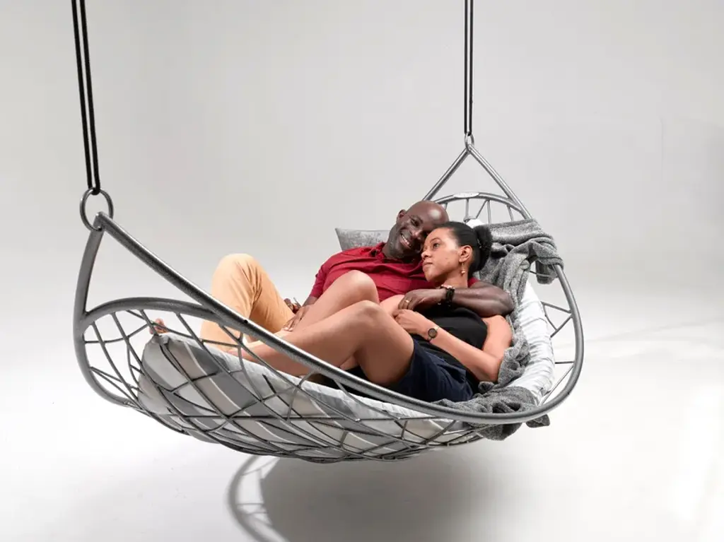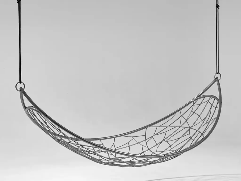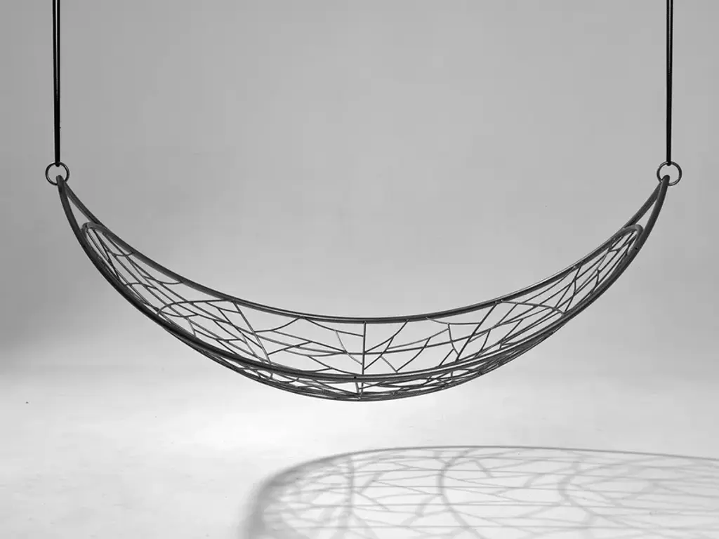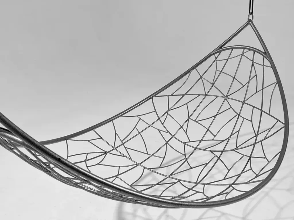 The MELON hanging lounger's organic shape is reminiscent of a slice of fruit like a melon. It is inspired by a hammock – but with its structured hard frame it will not fold in and is thus hugely comfortable. It is comfortable with ample room to relax. They are spacious with room for two people. The melon allows you to face each other, which is great for conversation, or cuddle up next to each other.The pattern detail is inspired by the texture on melon skin, but also by natural textures like the patterns of the veins in leaves, tree branches intersecting, the patterns in dragonfly wings and cracked soil. The chair has been designed to be very comfortable and relaxing. Ideal for ‘chilling’, reading a book or just hanging out.MELON is also available on a base stand / with legs for the more grounded person. Each one is made by hand. The core frame is standard to ensure consistency in shape and comfort. Due to the variance of craftsmanship going into each chair, every piece has individualism and uniqueness in some of the pattern detailing. Stainless Steel recommended for humid, salty, high moisture, coastal regions – on request and at an additional charge Hanging mechanisms are supplied in standard lengths, ready for installation.Available on request:- colour options- information on hanging options and stands- cushion options, sold separatelyVery Durable | Beautiful | Modern | Minimal | Contemporary and unique | Made By Hand | Indoor & Outdoor | Maximum capacity 240 kgs / 530 lbs | Powder Coated | Made from Rust Treated Mild Steel | Made in South Africa1 Year Warranty-Products to be free from defects in material and workmanship for a period of one year from date of sale. Any product found to be defective within this time period may be returned to our factory, freight prepaid, with prior return authorization for repair or replacement.