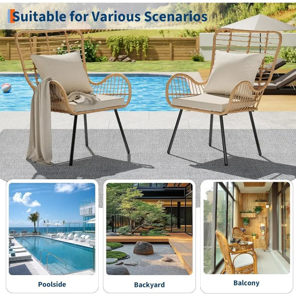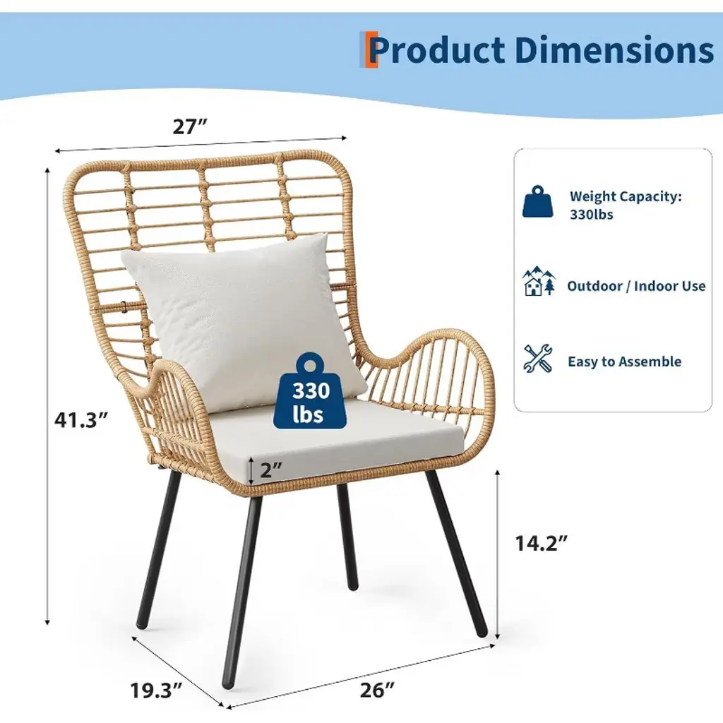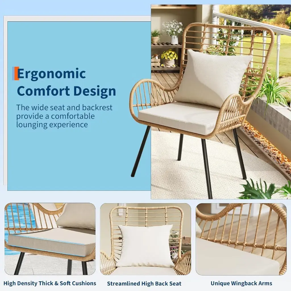 Elevate your outdoor space with the Nasitip Boho Patio Chair Set! This 2-piece wicker collection features oversized wingback chairs (41.3"H) with weather-resistant PE rattan woven around a rust-proof iron frame. Each chair includes high-density foam cushions with fade-resistant fabric for all-day comfort. The ergonomic curved back and wide armrests provide superior support, while the boho-chic design adds eclectic flair to patios, balconies, or gardens. Quick to assemble (10 minutes) and weighing just 43 lbs total, these durable chairs withstand sun and rain—perfect for creating a cozy conversation area in small spaces!