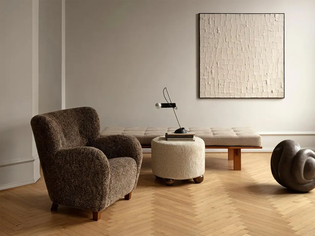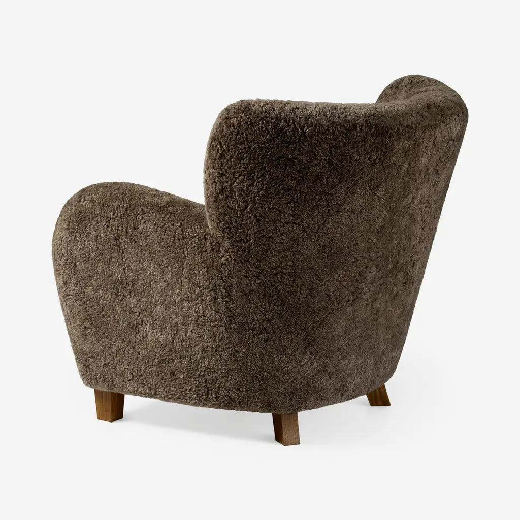Dagmar Design - Karu lounge chairThe Karu chair is a contemporary update of a classic design first produced in Finland by the Haimi Oy company in the early 1950s. The inviting curved arms and subtle winged back are the epitome of the post-war Nordic aesthetic. Karu offers perfect proportions for a bedroom or living room chair. The chair legs are available in oak or beechwood in a range of finishes. The frames are made from solid beechwood with a fully sprung seat. The chairs are available to be upholstered in a range of luxurious fabrics and shearlings. Examples shown are upholstered in Sahara brown sheepskin with oiled oak legs. Each chairs measures:Height of back 85 cmWidth at arms 84 cmTotal depth 90 cmSeat height 43cm.