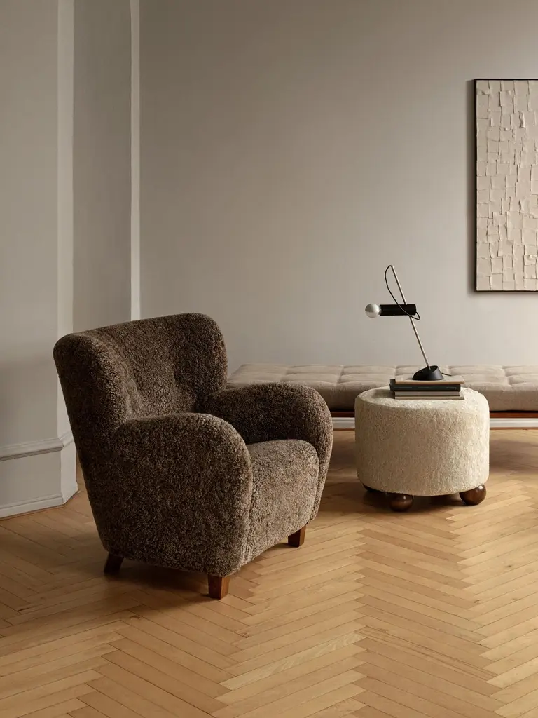 A pair of reproduction armchairs in the 1940s Danish modern style.The Karu chair is a contemporary update of a classic design first produced in Finland by the HAIMI OY company in the early 1950s. The inviting curved arms and subtle winged back are the epitome of the post-war Nordic aesthetic. Karu offers perfect proportions for a bedroom or living room chair. The chair legs are available in oiled oak, fumed oak, or walnut. The chairs are upholstered in luxurious Australian sheepskin available in a range of colours. Other fabric options are also available by request. Example shown in Sahara sheepskin with fumed oak legs. Each chair measures:Height of back 85 cmWidth at arms 84 cmTotal depth 90 cmSeat height 43cm.