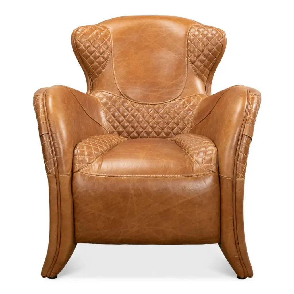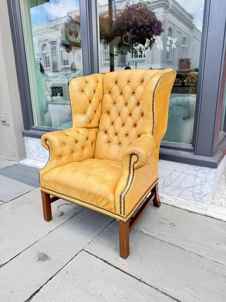 Tufted leather wingback chairs with mahogany legs. Leather has a warm buttery color.