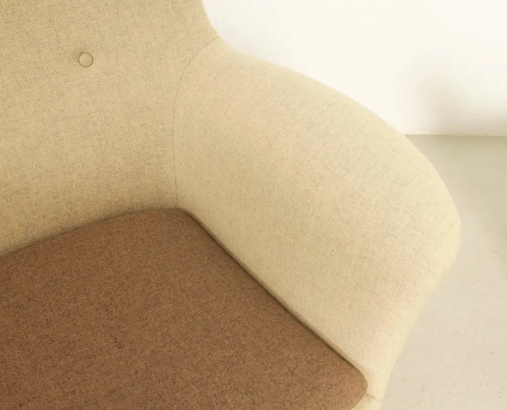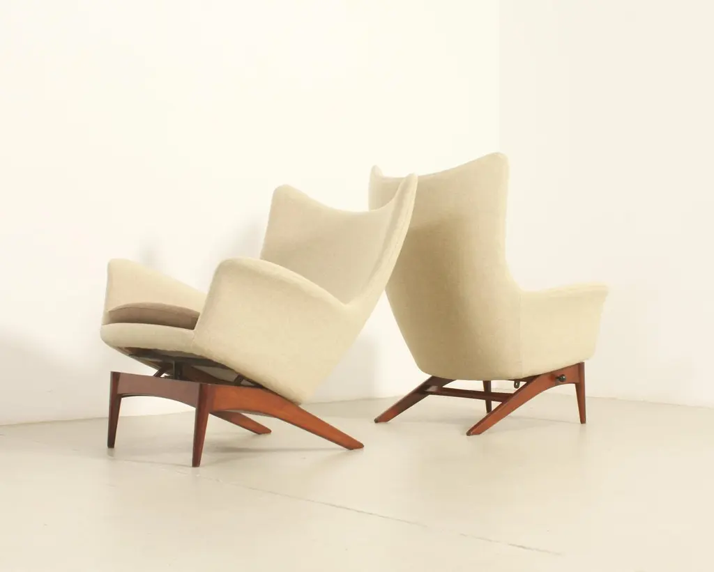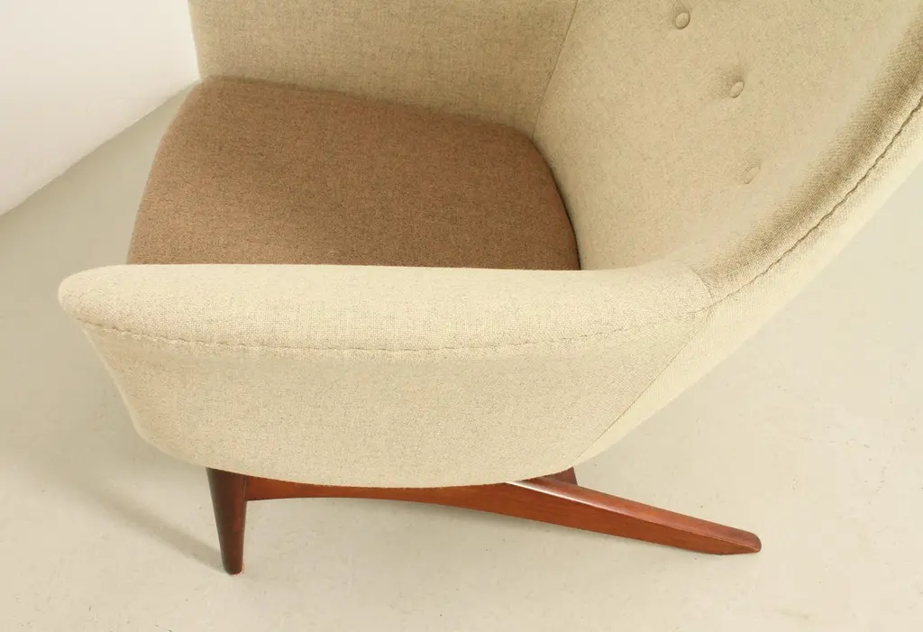 Reclining wing chair designed in 1950's by Henry Walter Klein for Bramin Møbler, Denmark. Teak base with tilt mechanism and new Kvadrat fabric upholstery and foam. The chair can be tilted in four different positions regulated by a knob on the right side.