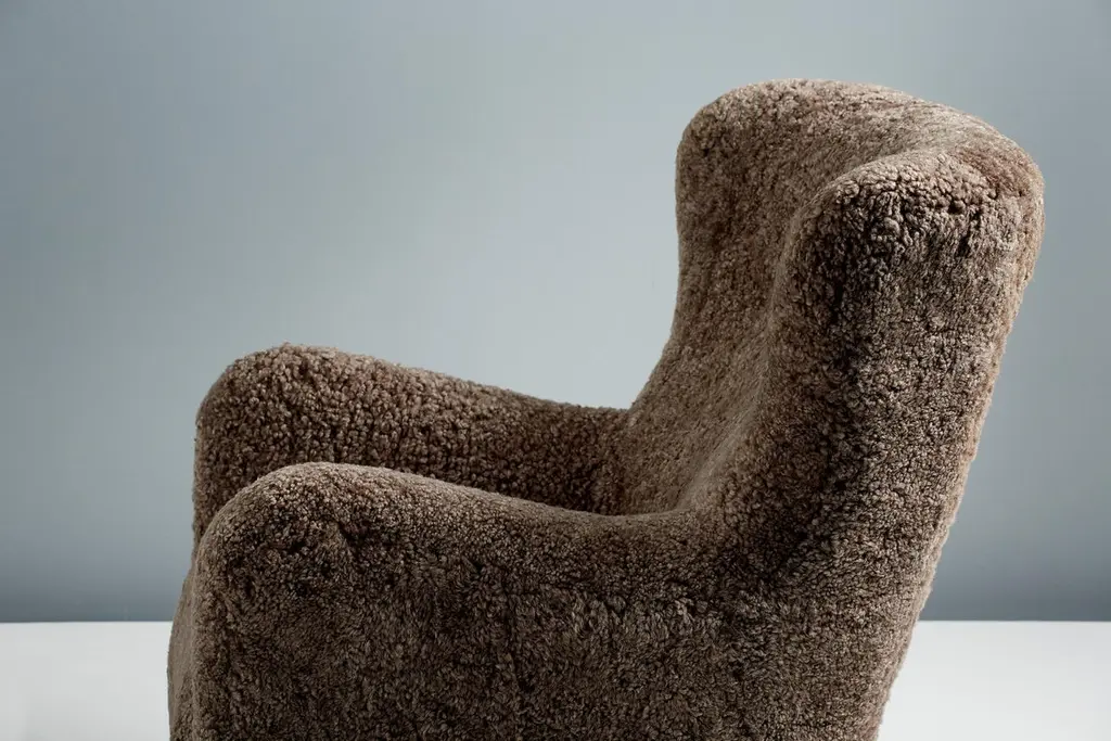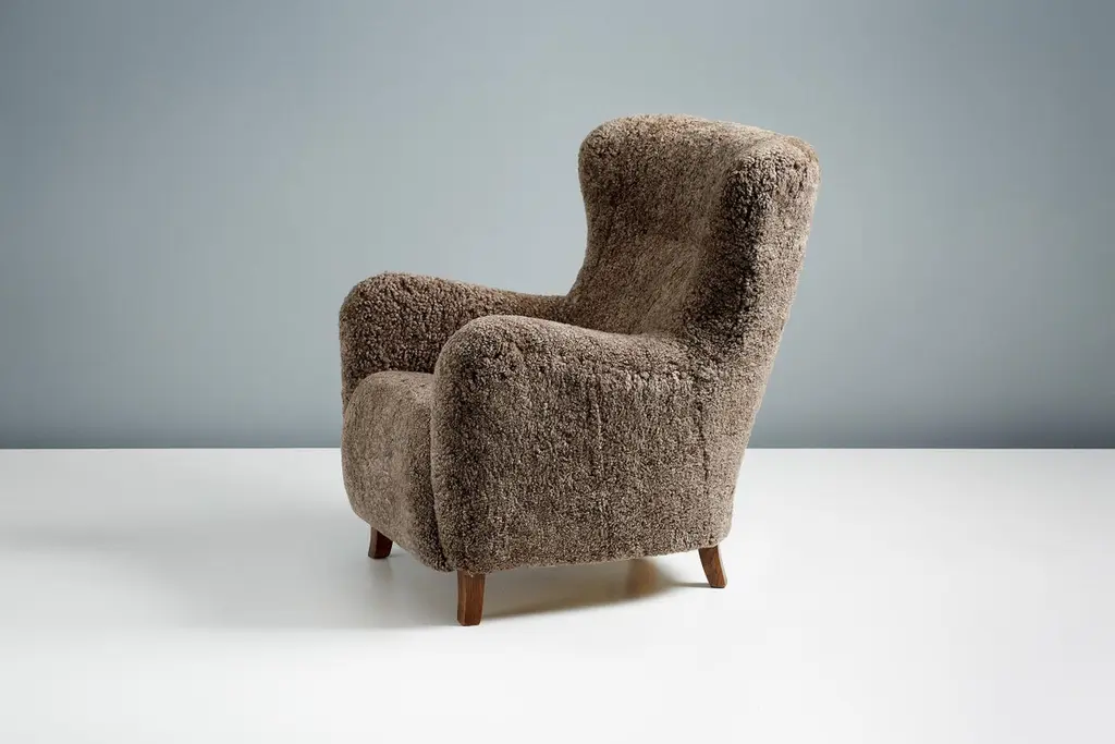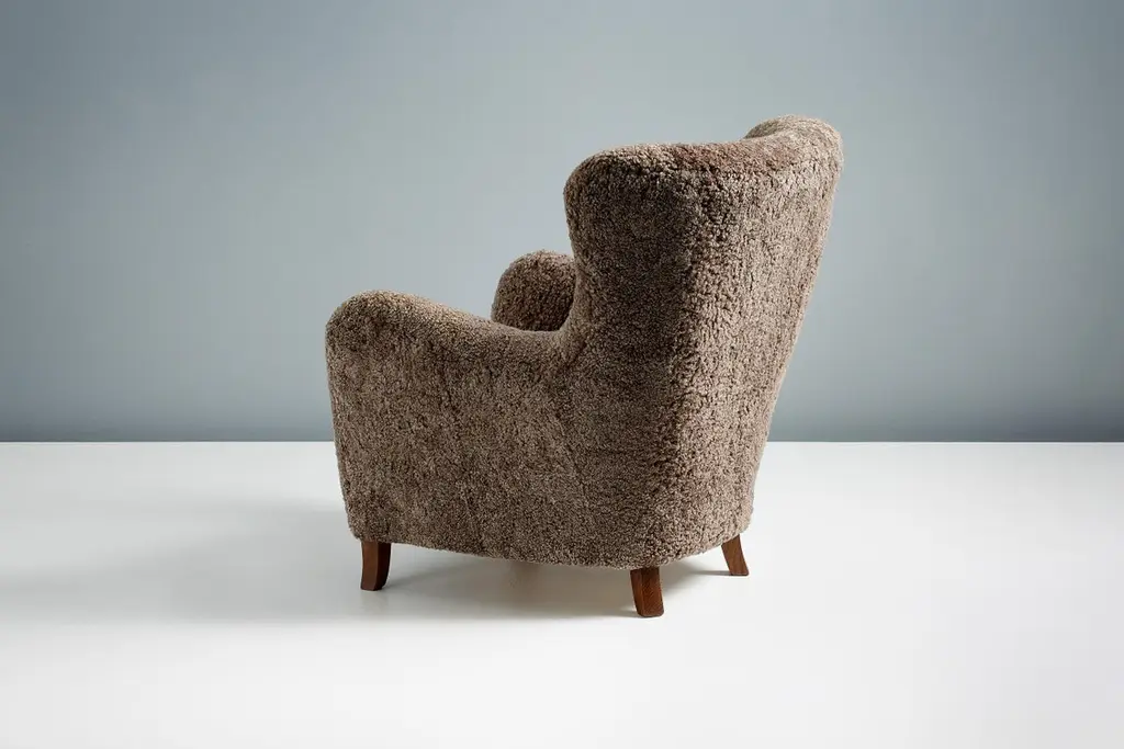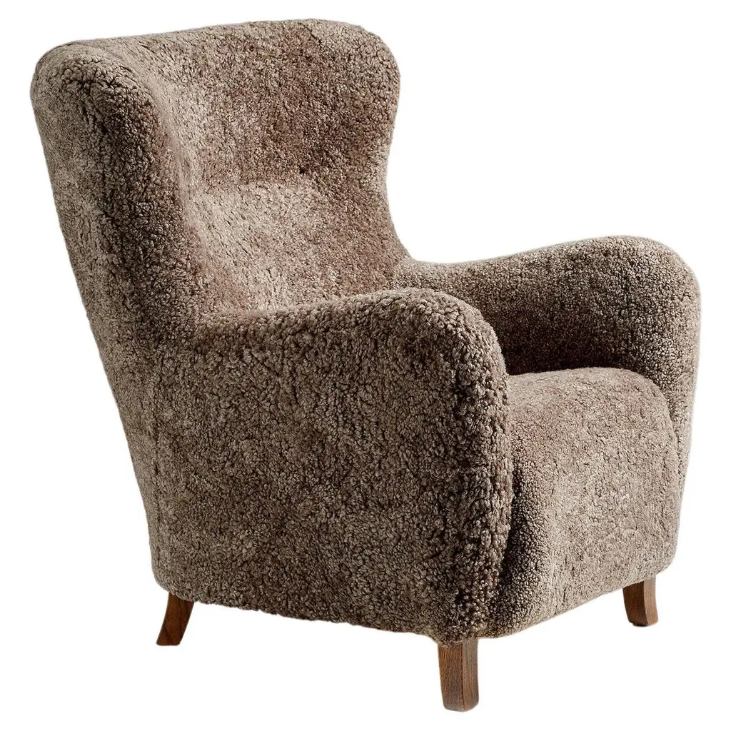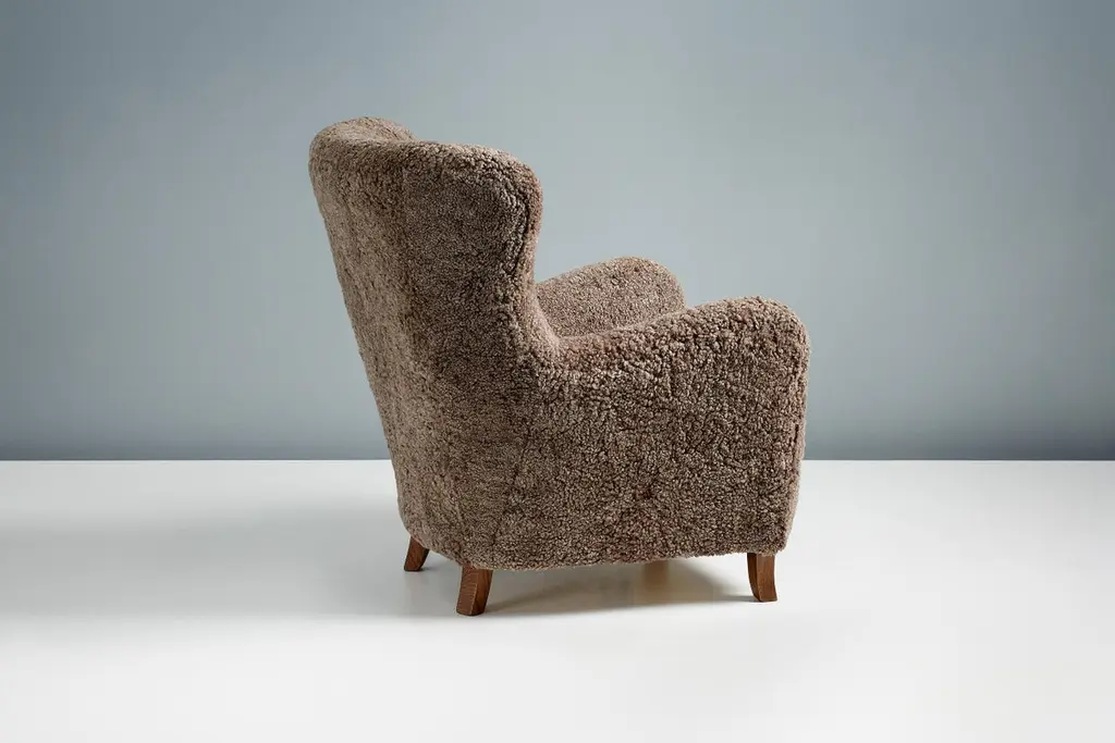 Dagmar Design Sampo Wing chairA custom-made wing chair developed & produced using the highest quality materials. This obscure design originated from the workshop of little-known Copenhagen upholsterer Christian Sorensen in the early 1940s. The flowing, organic silhouette is typical of early-period Danish Modern armchairs whilst retaining a striking contemporary feel. The Sampo chair is available to order in a range of different materials and with a choice of 4 leg finishes.This example has been upholstered in luxurious Australian sheepskin from Skandilock and has oiled, dark-stained beech legs. This model is also available with matching ottomans by request.Measures: H: 98cm / D: 80cm / W: 78cm / SH: 43cm.