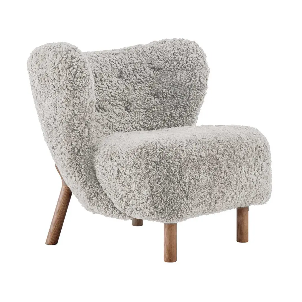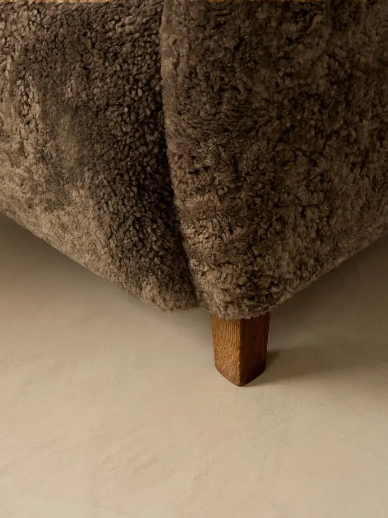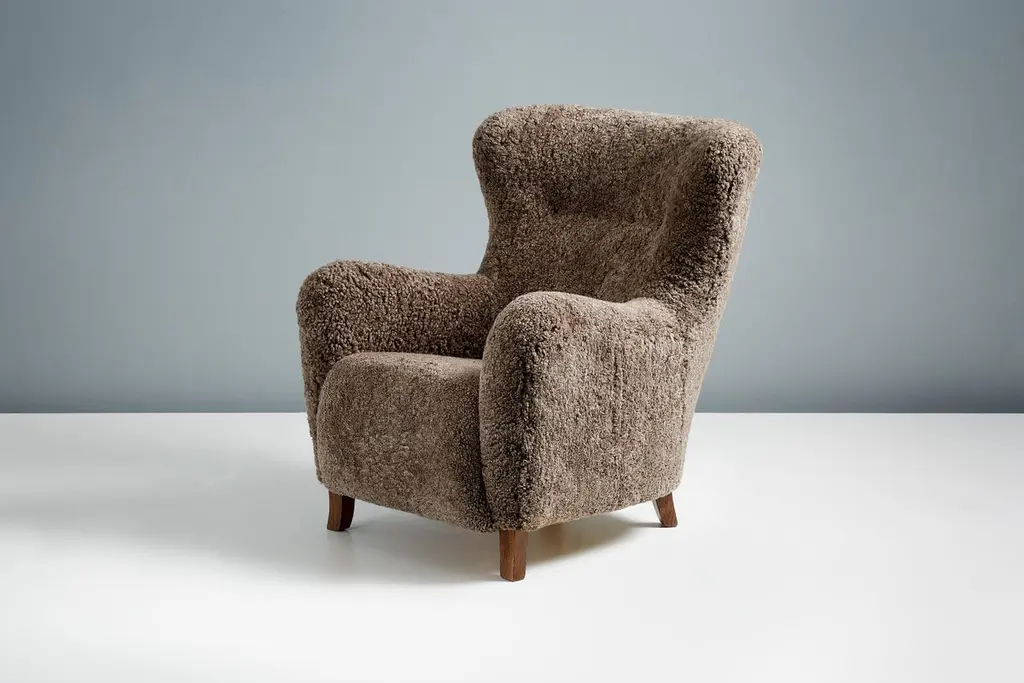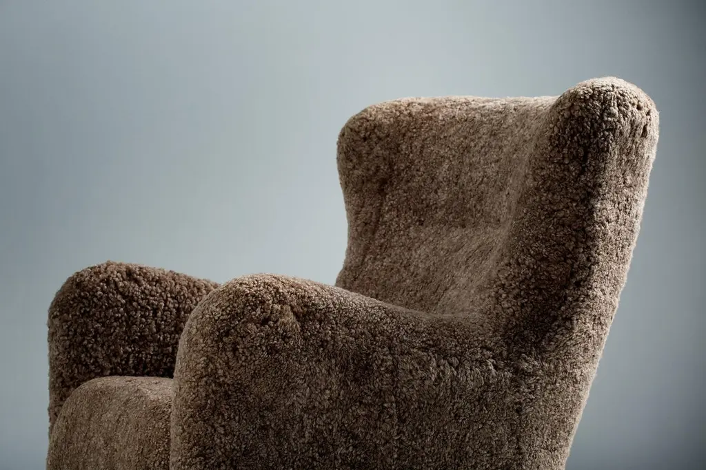 Dagmar Design Sampo Wing chairA custom-made wing chair developed & produced using the highest quality materials. This obscure design originated from the workshop of little-known Copenhagen upholsterer Christian Sorensen in the early 1940s. The flowing, organic silhouette is typical of early-period Danish Modern armchairs whilst retaining a striking contemporary feel. The Sampo chair is available to order in a range of different materials and with a choice of 4 leg finishes.This example has been upholstered in luxurious Australian sheepskin from Skandilock and has oiled, dark-stained beech legs. This model is also available with matching ottomans by request.Measures: H: 98cm / D: 80cm / W: 78cm / SH: 43cm.