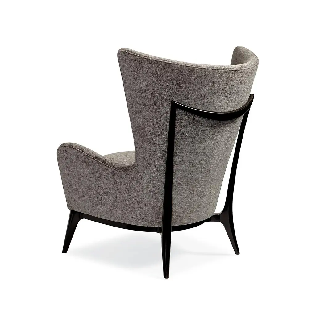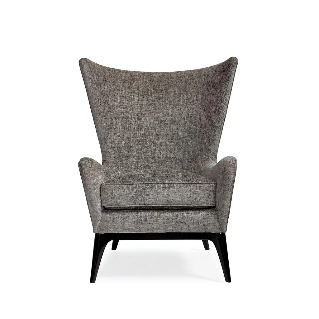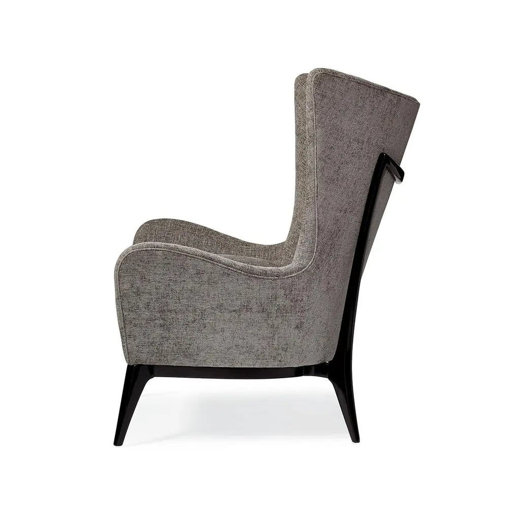 Scandinavian Mid Century armchair, this unique wing chair truly embodies Scandinavian style with the element of the wood detail across the outback finished in Almost Black. Its gracefully sloped arms and soft round back embrace you for cozy comfort in style, also in keeping with the authentic Scandinavian attributes.Dimensions: 32.25" W x 35.25" D x 41" HSeat - 19.5" HArm - 22.25" HMid-century chair withSpring down cushionBody Fabric: 2555-91CC.