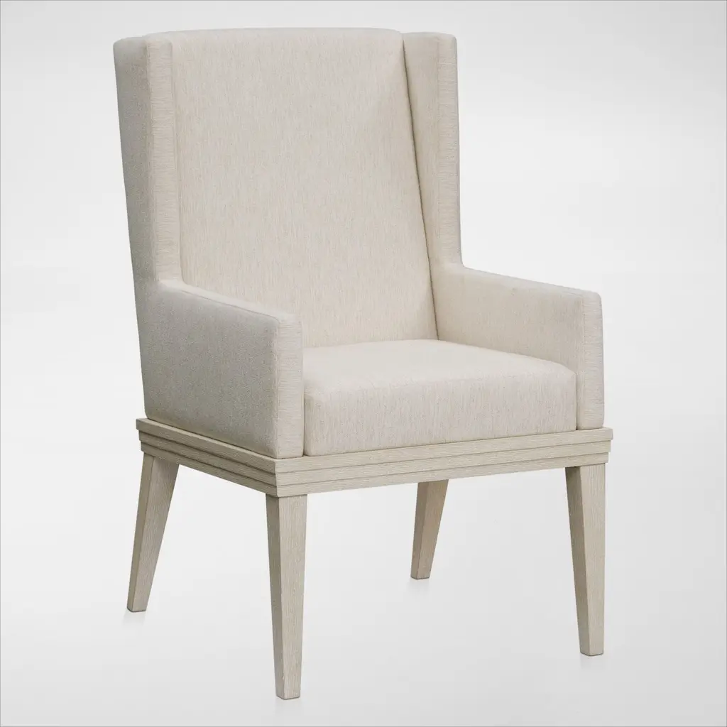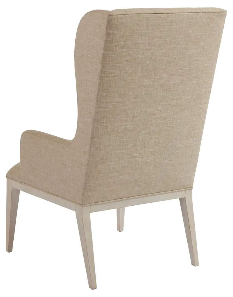 This armchair is crafted of elm with a streamlined wingback silhouette and an exposed base that beautifully complements the neutral hue of the upholstery. Coordinating lumbar pillow included.