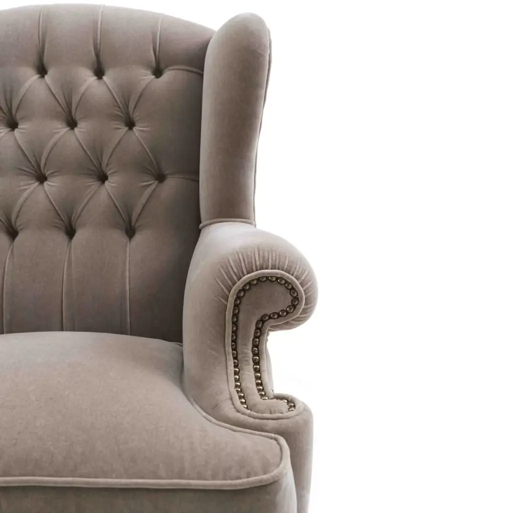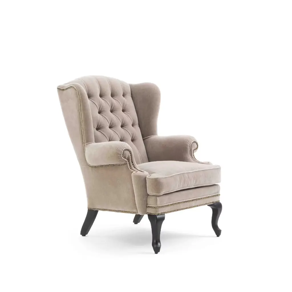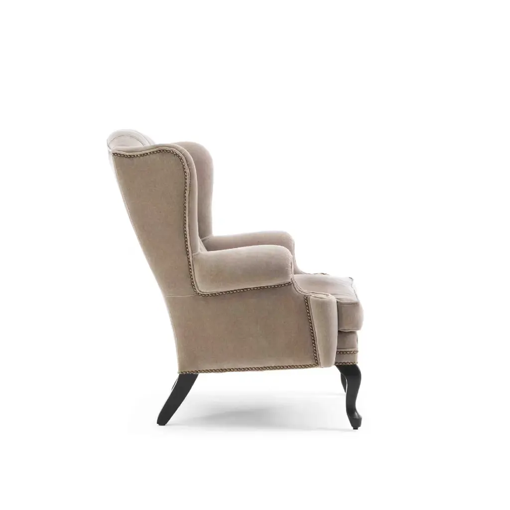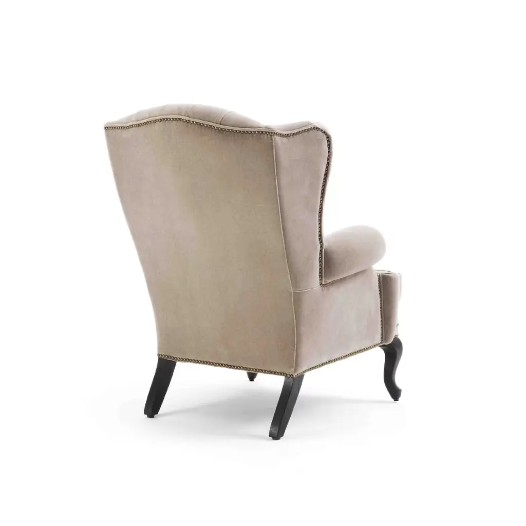 This inviting and sophisticated armchair has a strong visual aesthetic that will enliven a classic living room or private studio. A modern take on the wingback style, this piece has a solid wood frame and ash legs with an ebonized finish. Entirely padded with polyurethane foam and polyester fiber, the sand-colored fabric features a tufted design on the front of the high backrest that is enriched with satin brass nails around the profiles of armrests and base. The seat cushion (removable cover) is enriched with goose down and polyurethane inserts for utmost comfort.