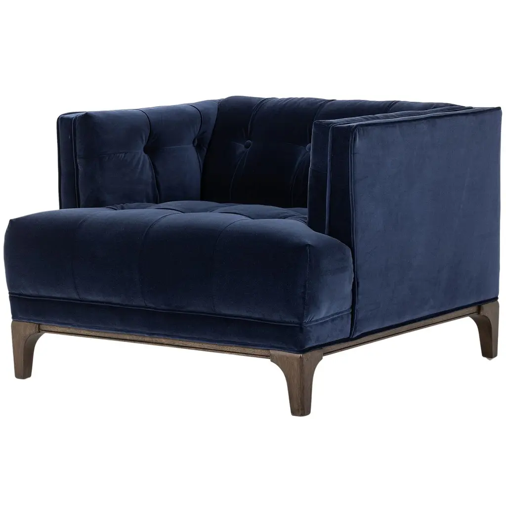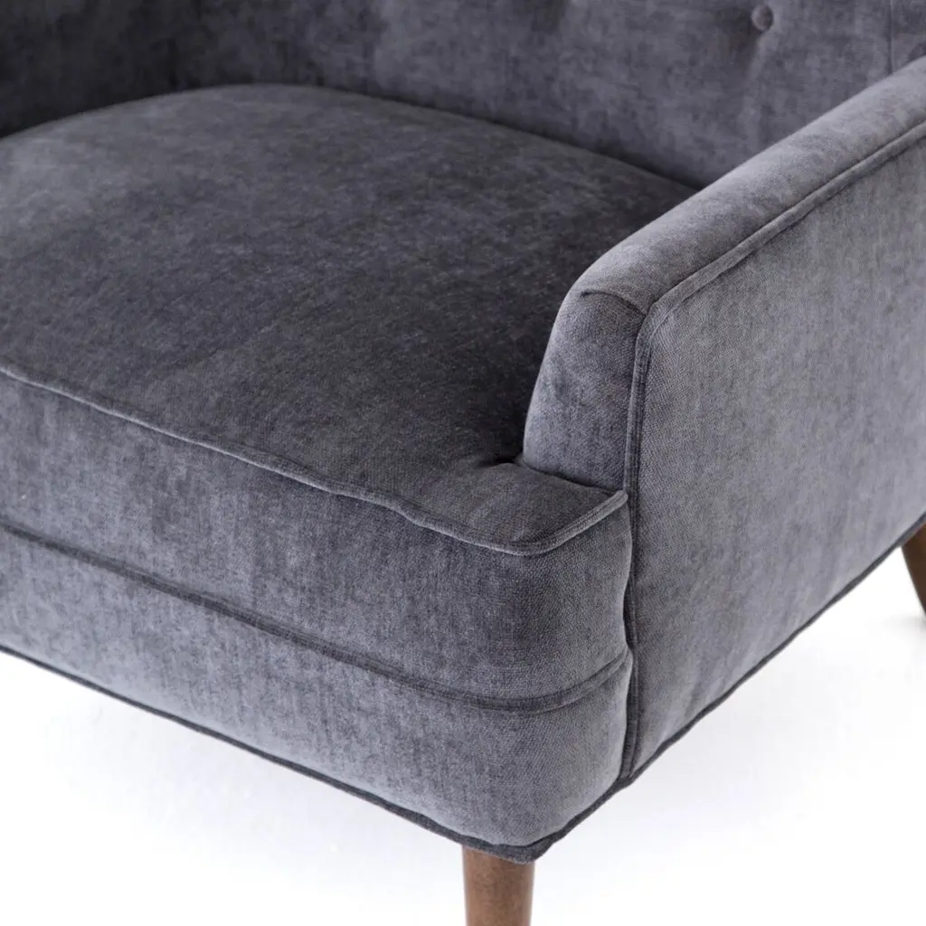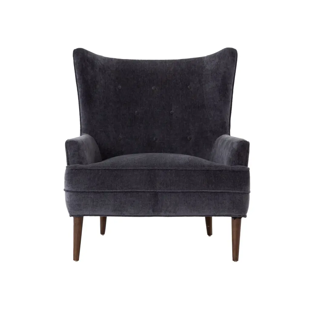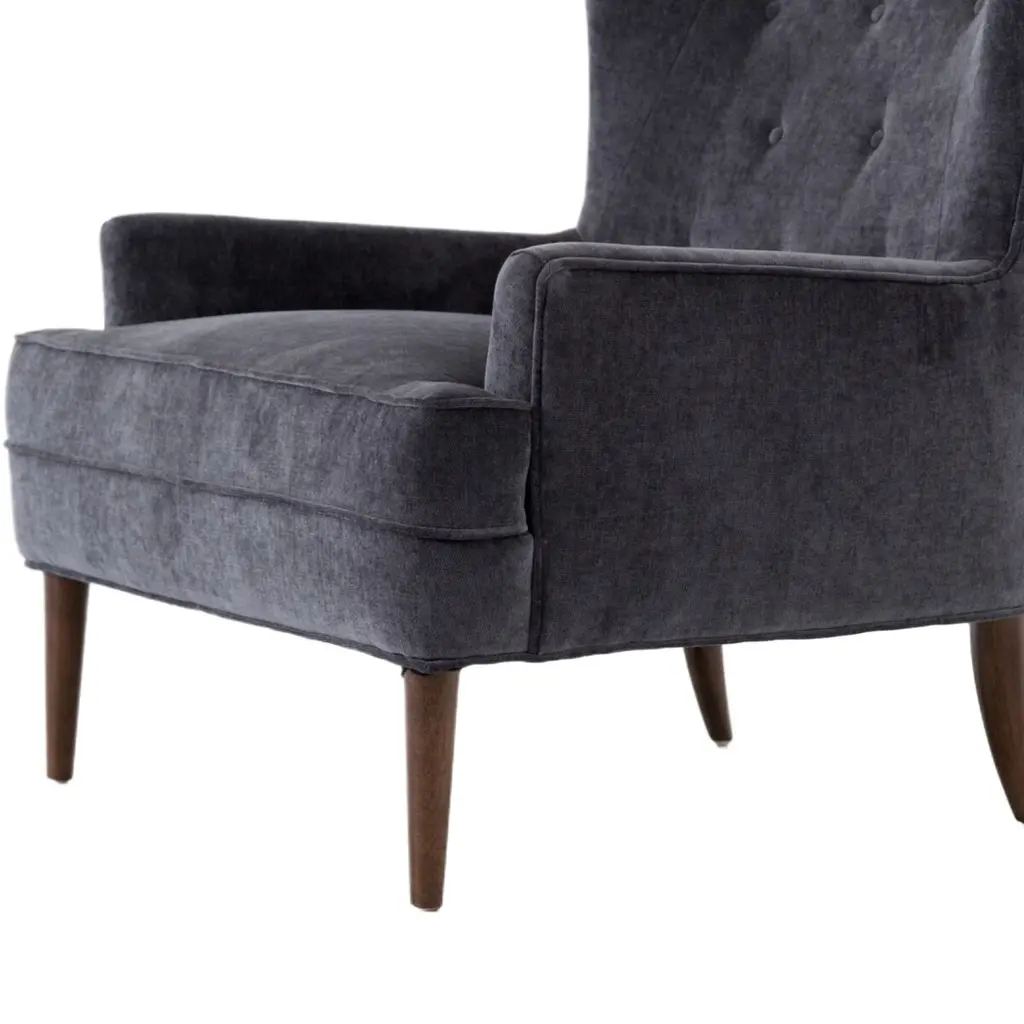 The Skye Chair offers an elegant, mid-century twist on the traditional wing chair. It features exquisite hand-button tufting and accent seaming, creating a sophisticated and timeless appeal. This chair is designed to be a statement piece in any room, exuding both comfort and style.