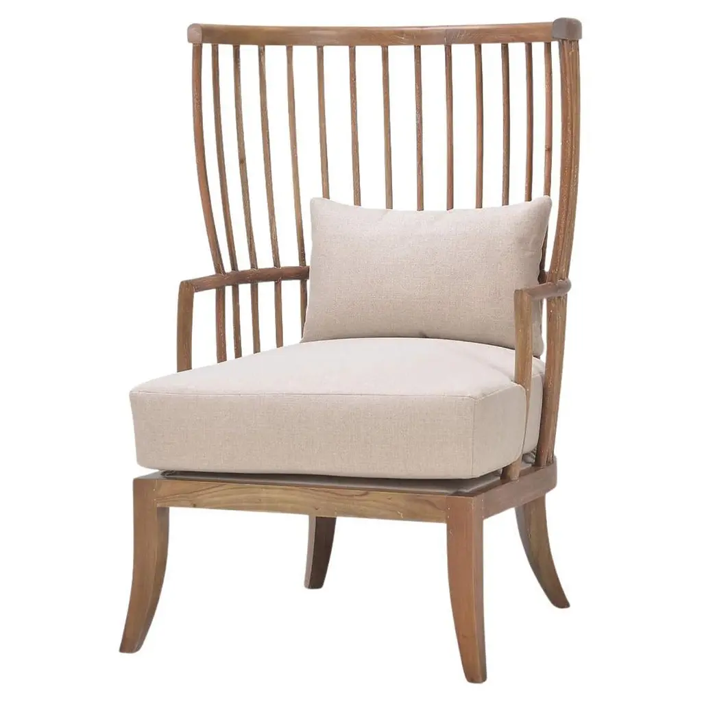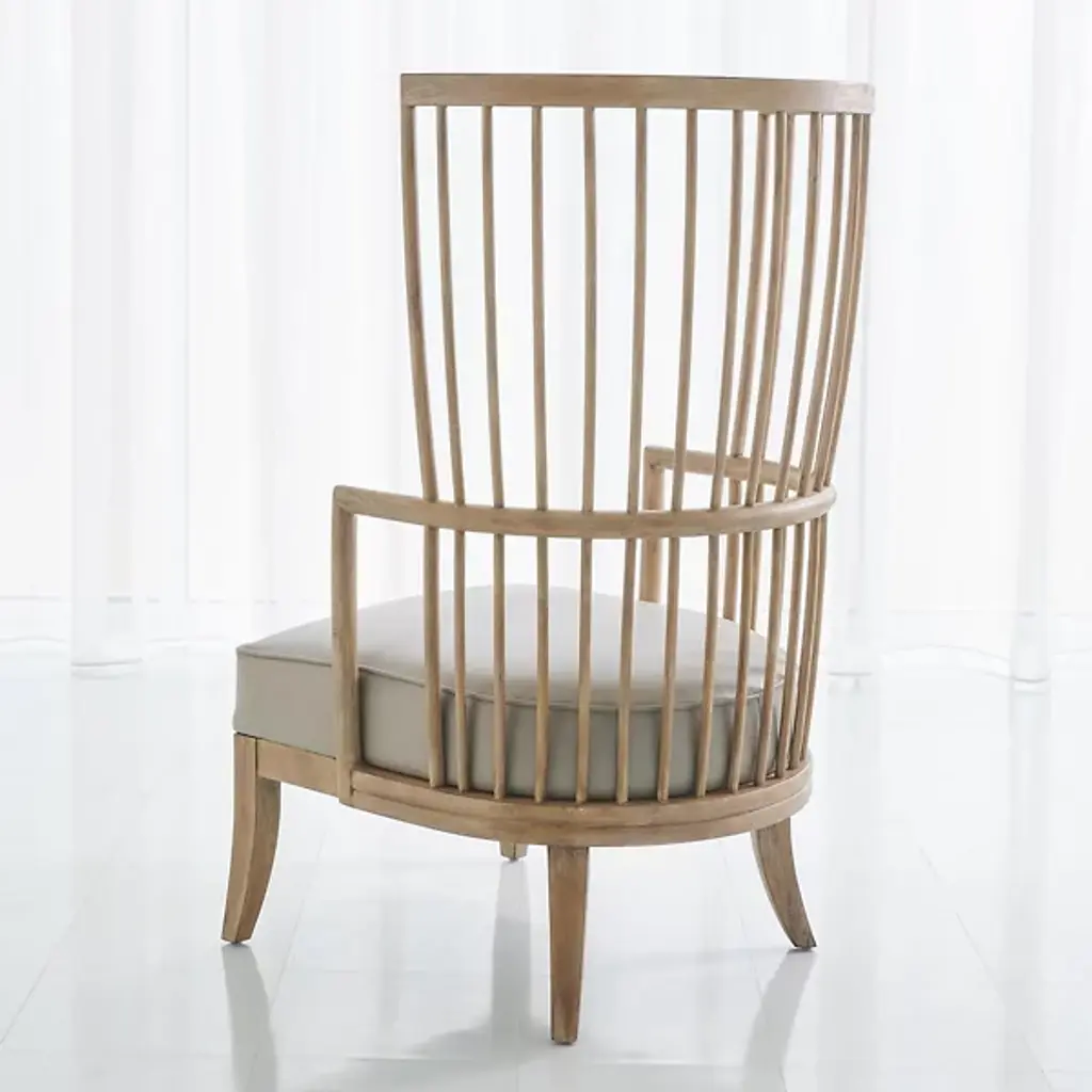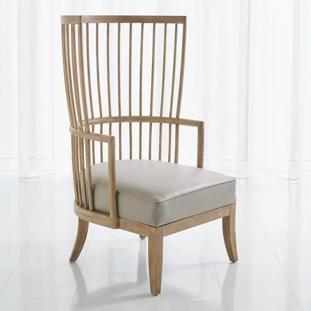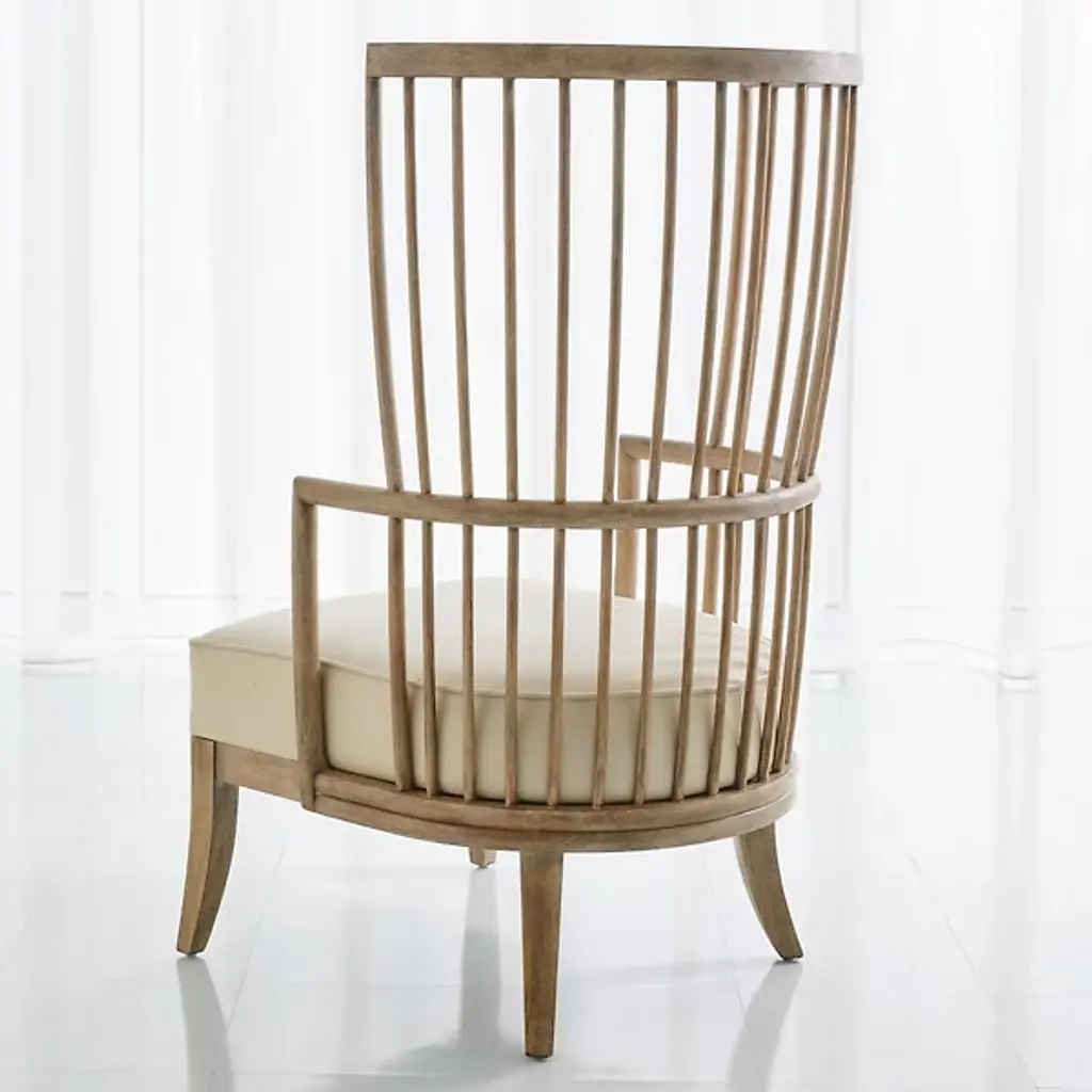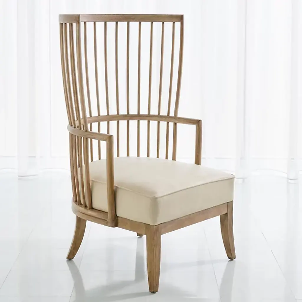Provide a stately, rustic appeal to interiors with the Spindle Wing Chair from Global Views. An inspired spin on Shaker-style seating, it sweeps up from curving legs, placing a soft cushion inside a curving back with slim upright accents. The frame is in beechwood, contrasting its slender verticals with the prominent padding on the seat, providing an intriguing character that draws the eyes naturally to the accessible and encompassing seat.