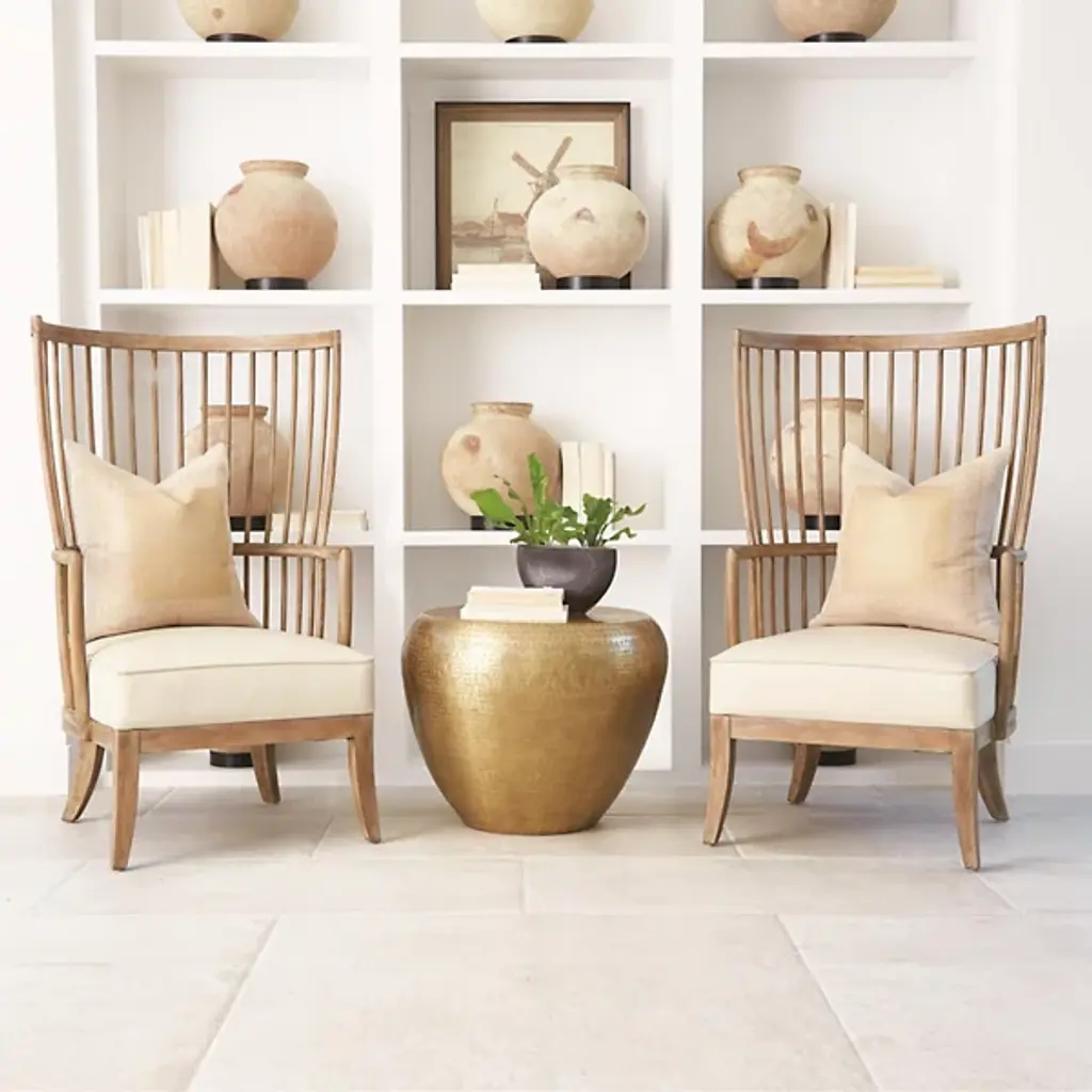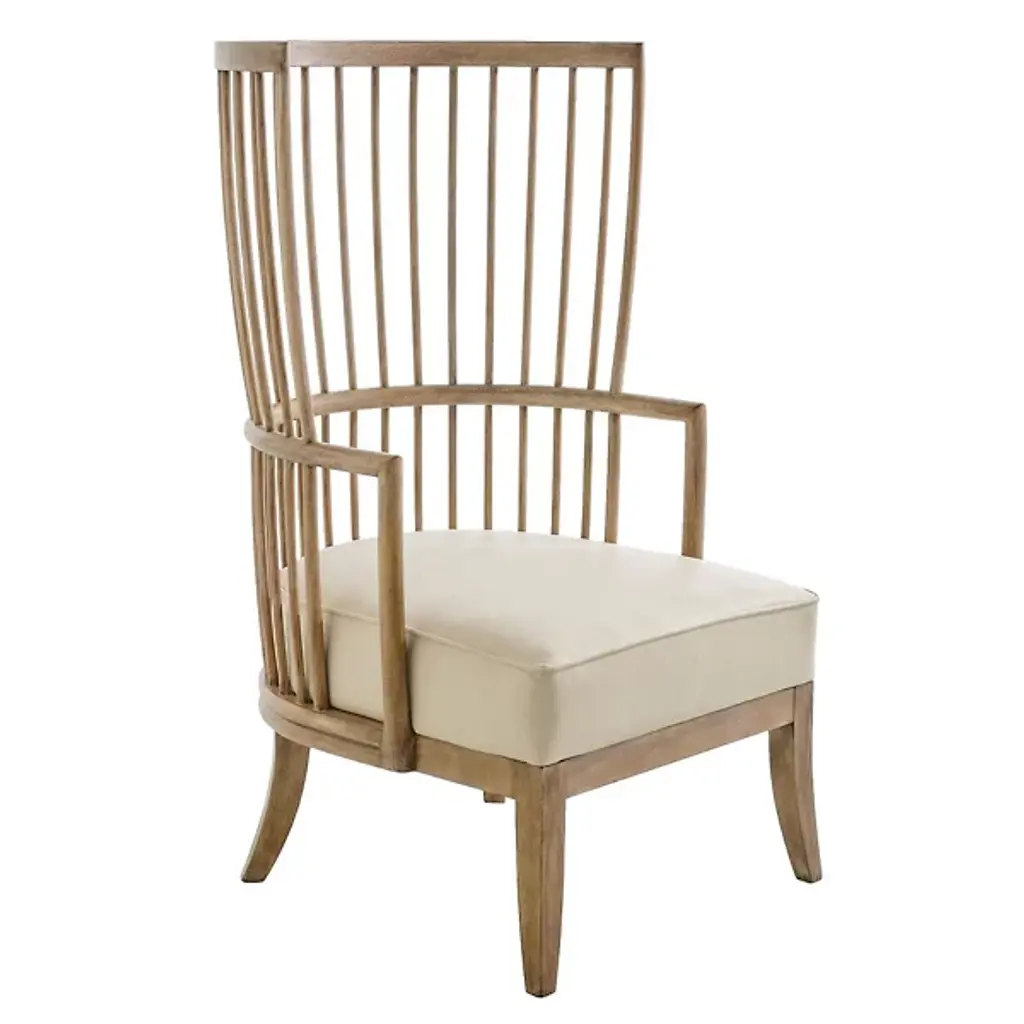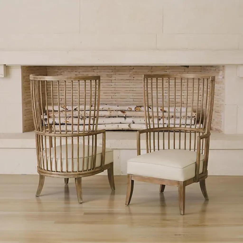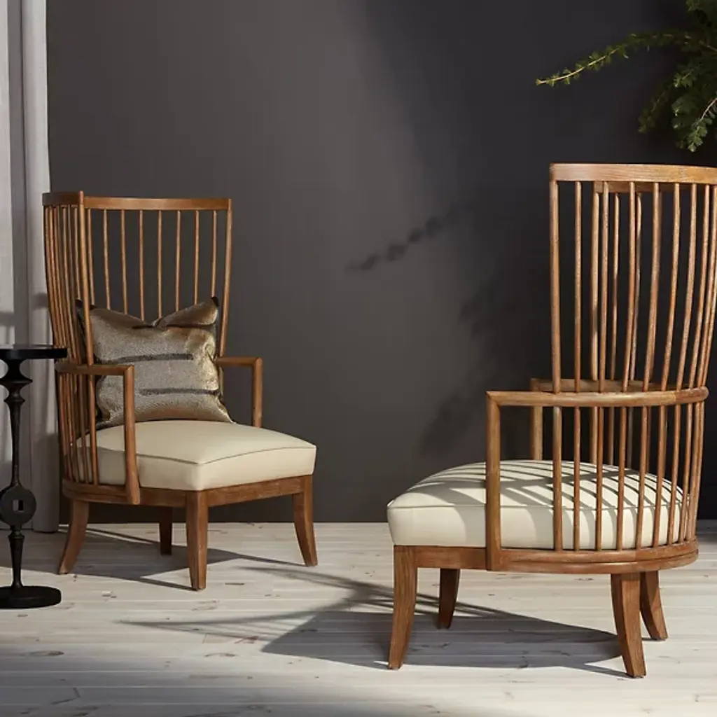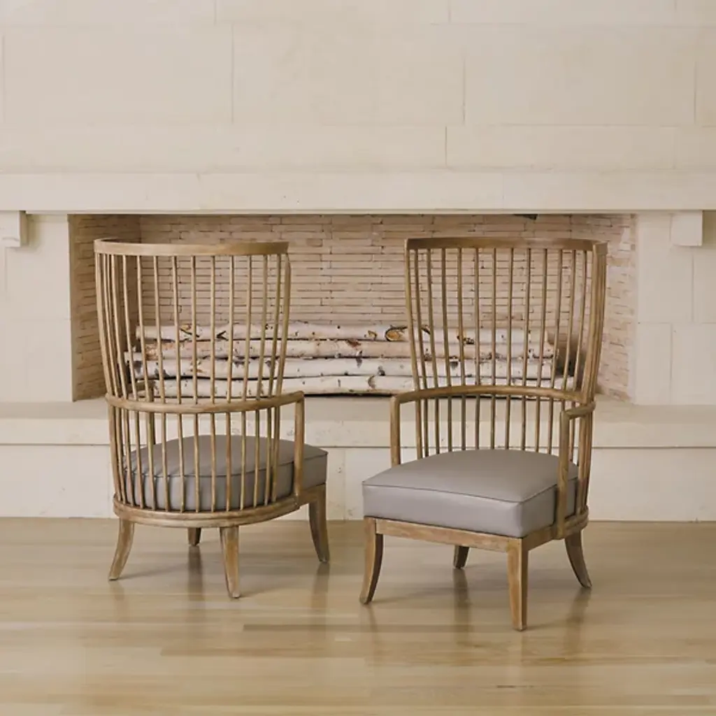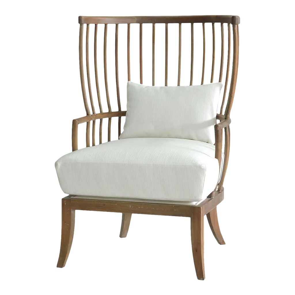 Provide a stately, rustic appeal to interiors with the Spindle Wing Chair from Global Views. An inspired spin on Shaker-style seating, it sweeps up from curving legs, placing a soft cushion inside a curving back with slim upright accents. The frame is in beechwood, contrasting its slender verticals with the prominent padding on the seat, providing an intriguing character that draws the eyes naturally to the accessible and encompassing seat.