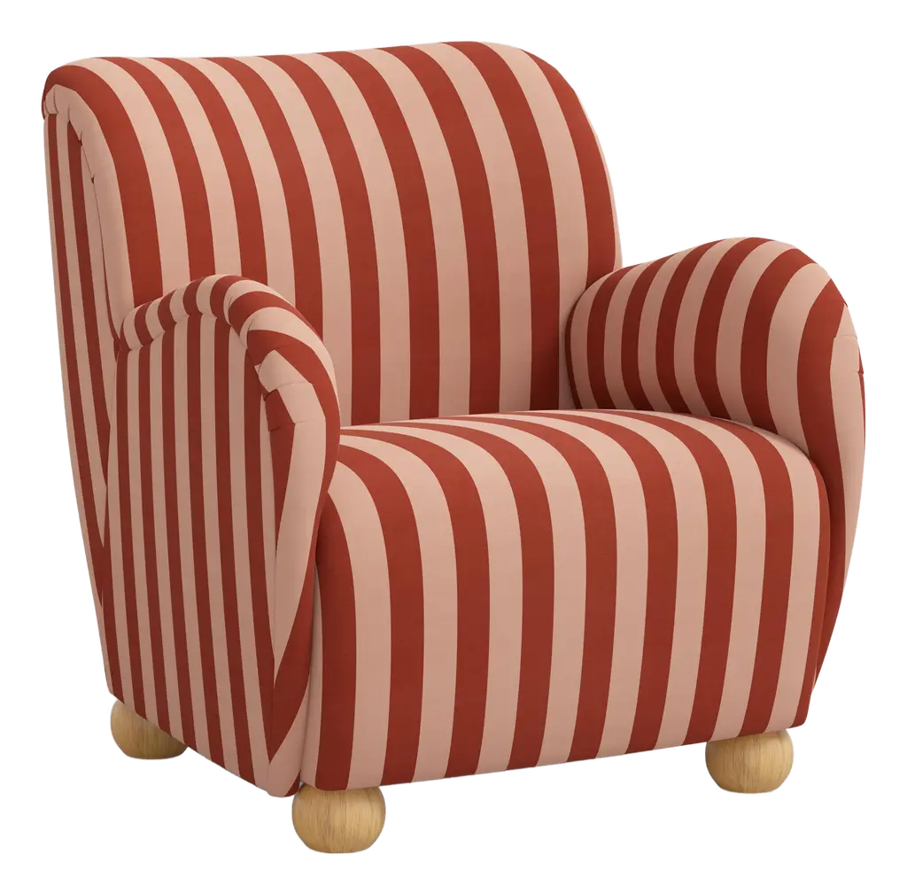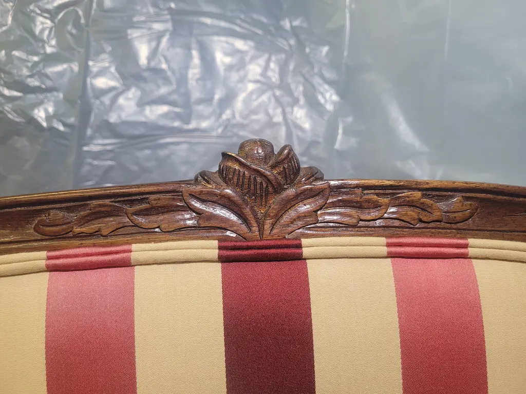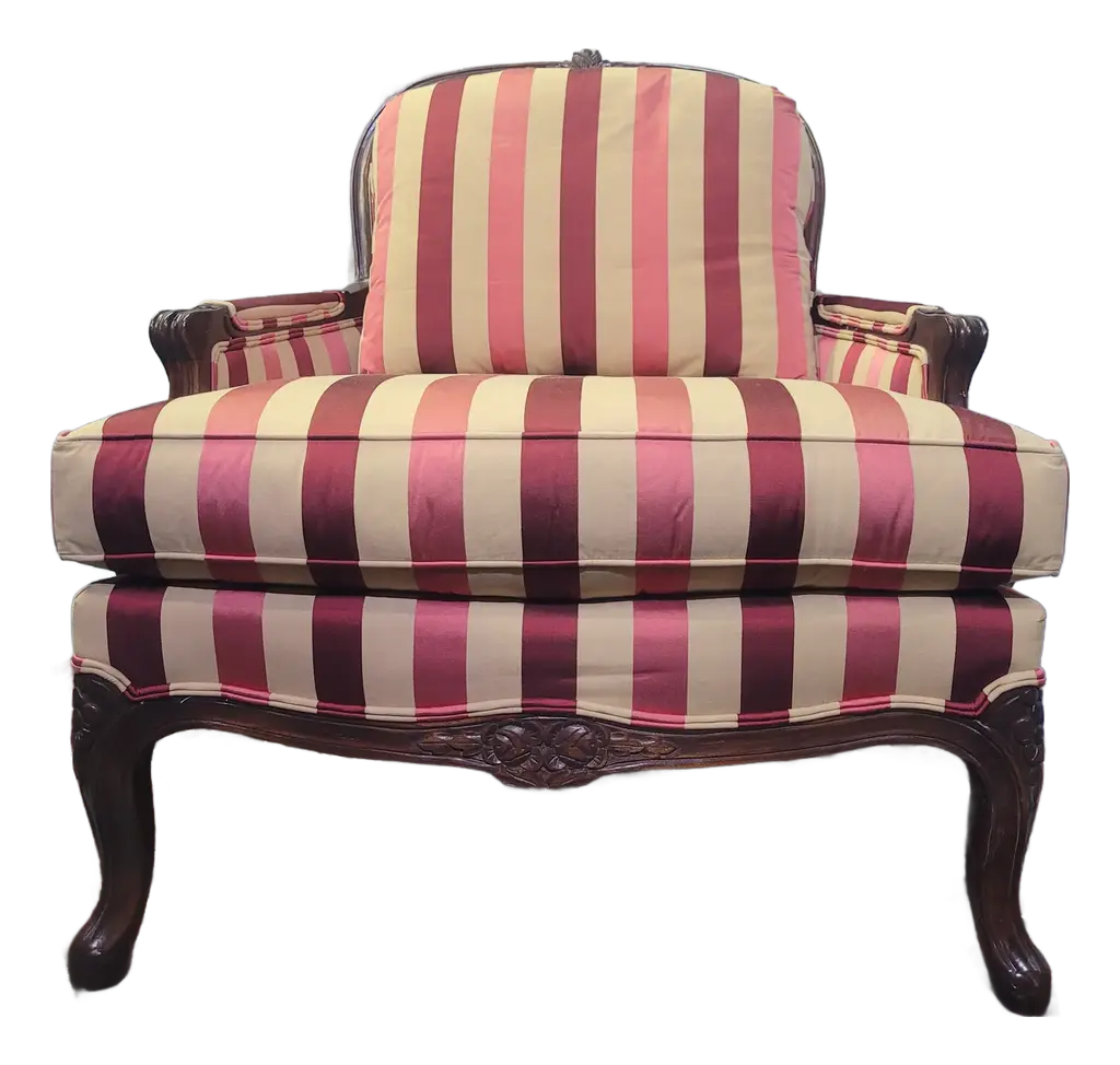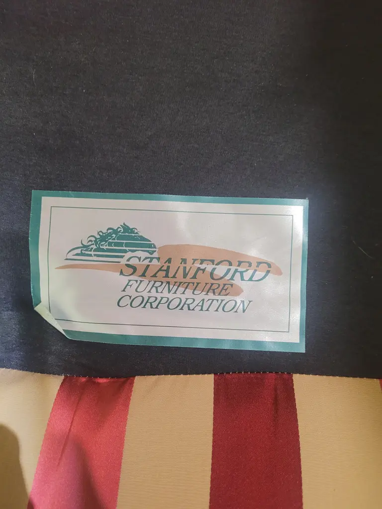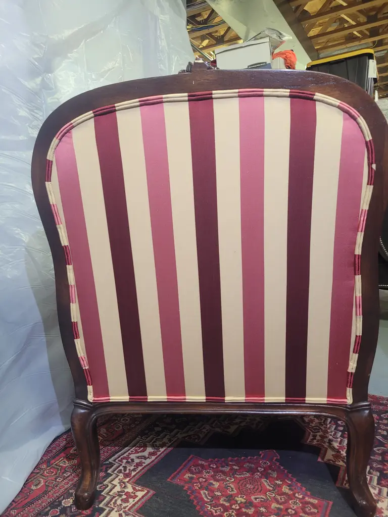 Add a touch of elegance to your home with this stunning custom-made pink striped wingback chair by Stanford Furniture Corp. Known for its craftsmanship and timeless designs, this chair is both stylish and comfortable. The unique pink striped upholstery is perfect for a living room, reading nook, or bedroom. Chairs are like new.