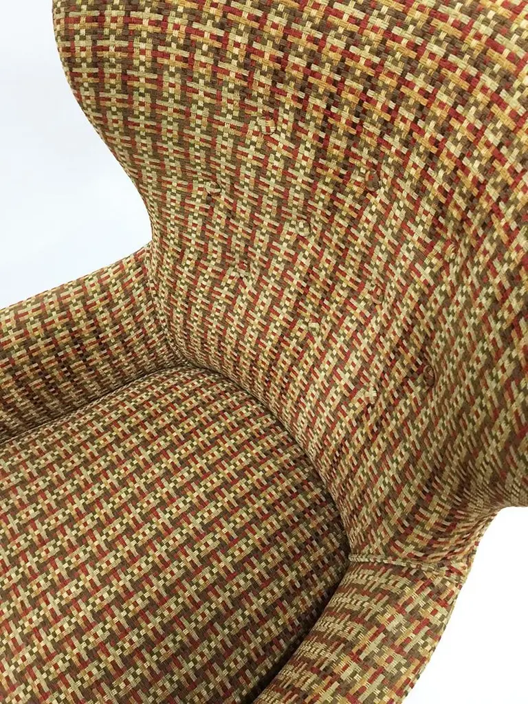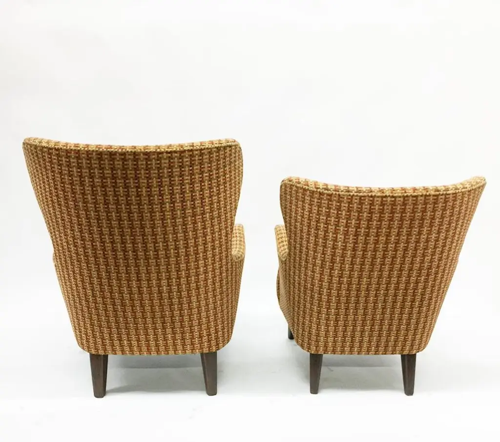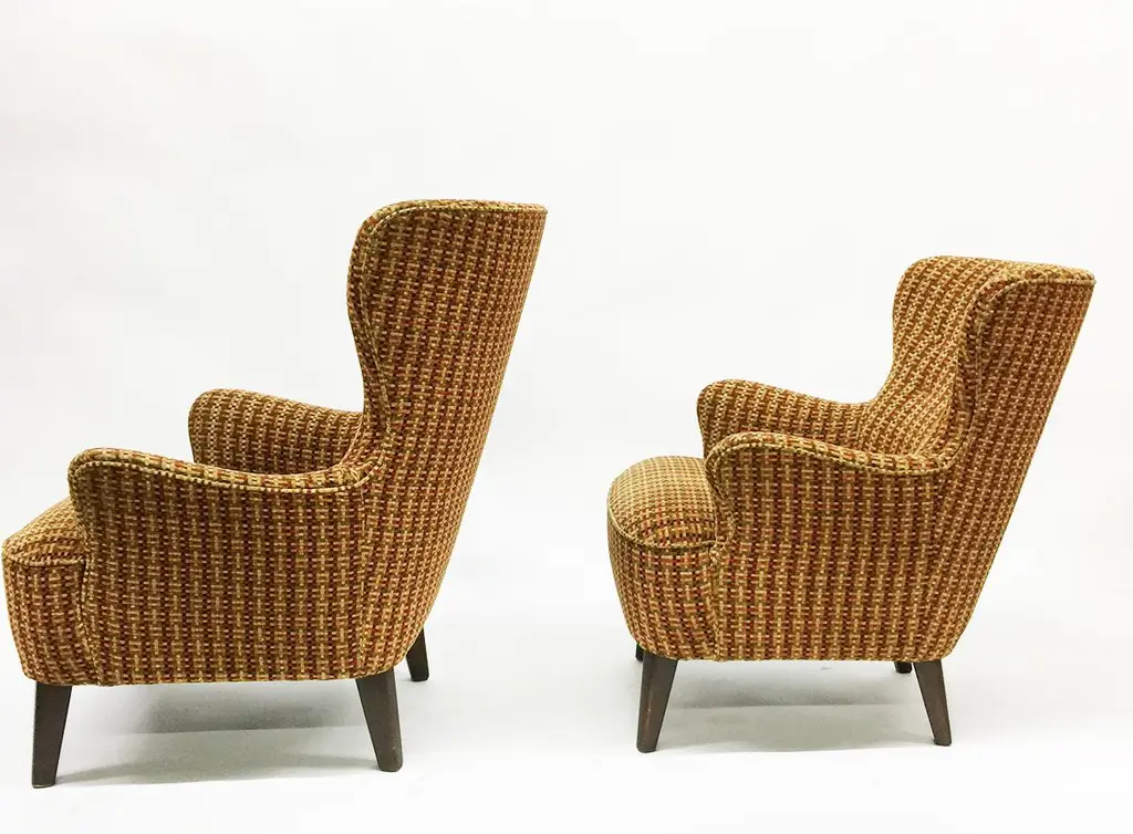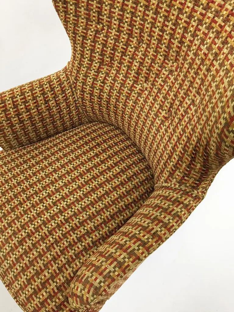 Theo Ruth lounge chairs for ArtifortThe Netherlands, 1950sOne lounge chair with a highly winged back and 3 rows buttonsOne lounge chair with a low winged back and 2 rows buttonsThe upholstery is a multi colored woven fabricThe measurements 93 cm high, the depth is 59 cm and 71 cm wide The seat height is 42 cm 83 cm high, the depth is 56 cm and 65 cm wide The seat height is 42 cmThe chairs are in very good Vintage condition.