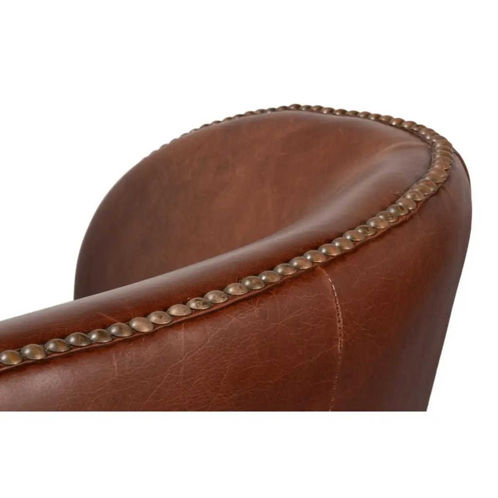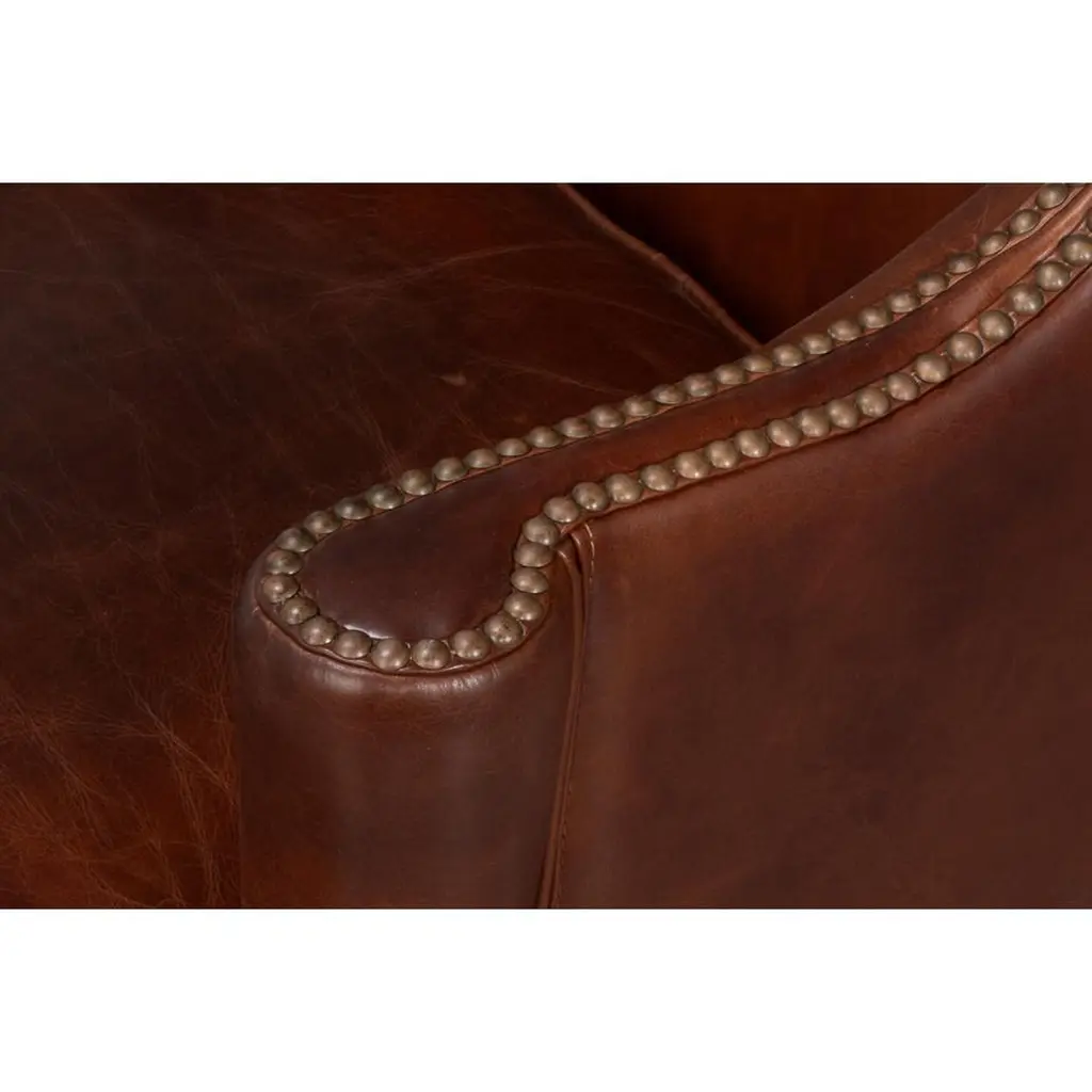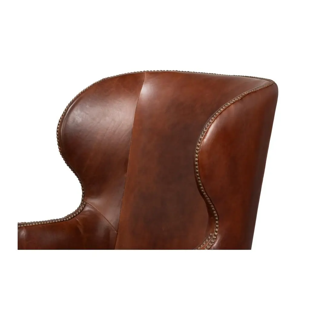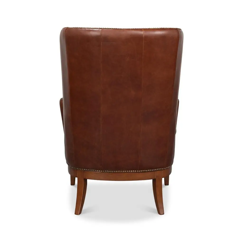 Blending contemporary comfort with traditional elements through its exaggerated wings and rich top-grain cowhide upholstery. Masterfully crafted details include flared arms with vertical rolls, antique brass nailhead trim, and a striking walnut base that adds elegance to the timeless design.This luxurious seating solution bridges classic and modern styles while delivering unparalleled comfort through its ergonomic design. The supple leather develops a beautiful patina over time, making each chair uniquely distinctive as it graces both classic and contemporary living spaces with sophisticated presence.Dimensions: 30.5" W x 29" D x 44" HSeat - 20"Arm - 27"