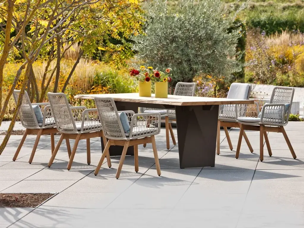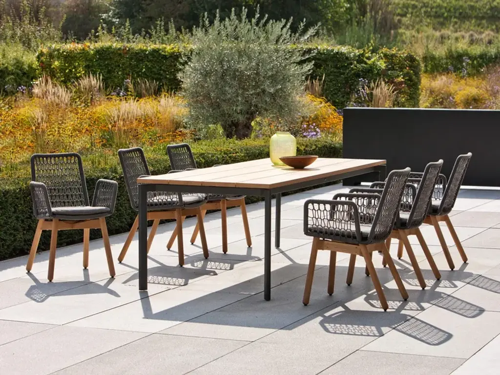 The Wing Light fabric chair with a teak frame is the ideal light and airy outdoor furniture for long summer evenings. The perfect combination of an elegant frame made of the best teak wood and a seat shell made of weatherproof outdoor wicker creates a harmonious and elegant outdoor living environment. The textile wickerwork is handcrafted and offers the user the best possible seating comfort. High-quality materials and detailed workmanship ensure the best quality. Optionally available with a comfortable seat or seat-back cushion.The Wing Light collection is a modern series that provides high quality outdoor areas. Armchairs, relax armchairs and stools set new accents with their open wickerwork. They offer themselves to become a favorite piece in the garden with their special ease.