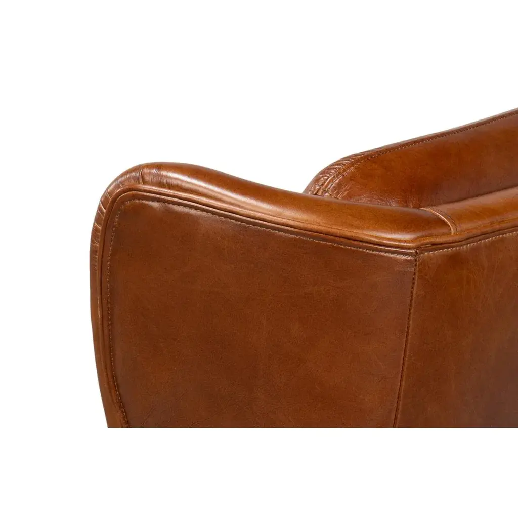 With brown traditional top grain Vintage Havana leather, with high classic wingback backrest and boxed cushion seat raised on tapered legs. Dimensions: 28" W x 36" D x 40" H Seat - 20" H Arm - 25" H Color variation is common and acceptable on vintage-style leather.