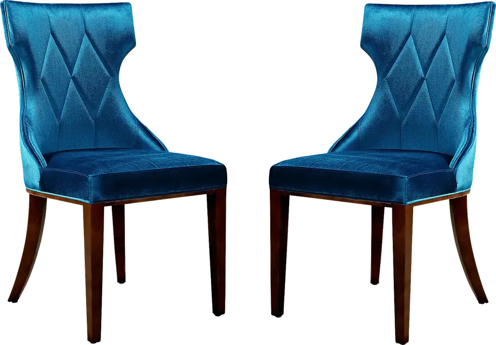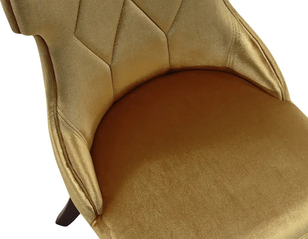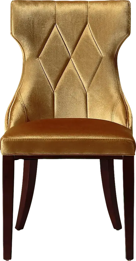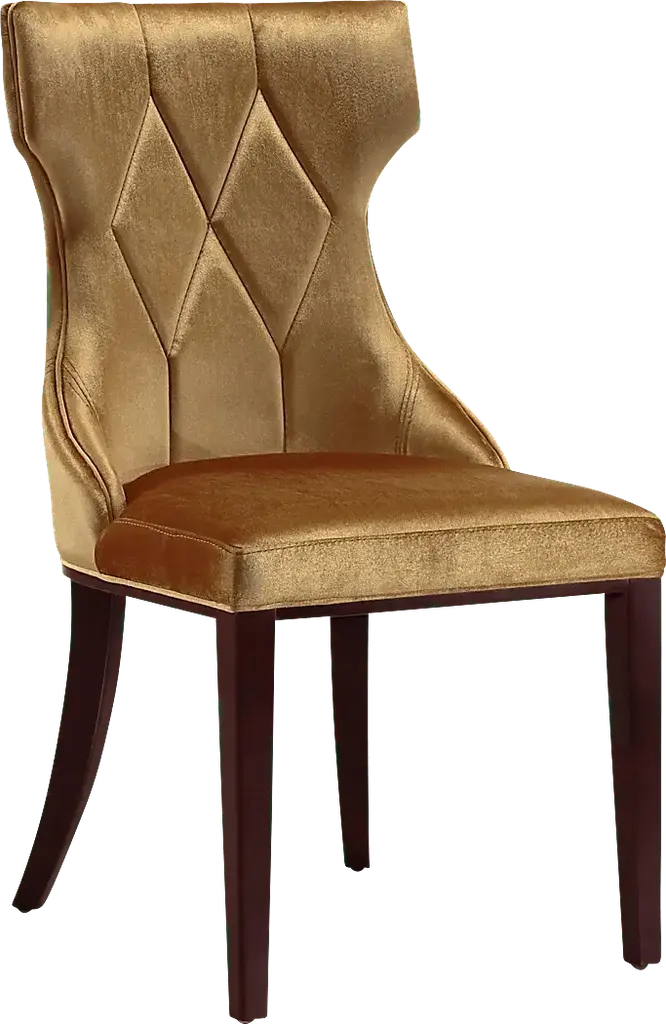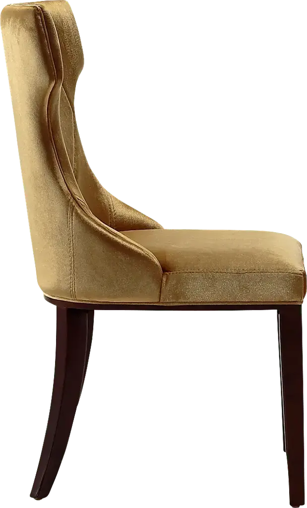The Worlddale gold side chair, set of 2 brings the height of modern architecture and elegant style to your dining experience. Luxuriously upholstered, this show stopping piece is soft to the touch. The distinct wing-back seating and rich, walnut stained beech wood legs curve at the back, giving the Worlddale its sophisticated glamor. Ships fully assembled, the Worlddale is sure to be a standout in any decor.