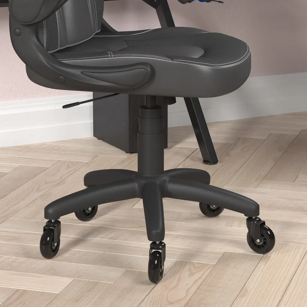 Great style combined with high customization make this ergonomic racing chair a must have to keep up with the demands of your marathon gaming sessions. Your couch may feel comfortable, but you need adequate seating while holding the controller for hours at a time. This high back LeatherSoft upholstered racing style game chair with upgraded, transparent, roller style ball-bearing wheels will outperform your couch with healthier benefits. LeatherSoft is leather and polyurethane for added Softness and Durability. The ergonomic design of this computer chair offers generous padding with a wing style back to cradle your torso. The padded arms provide a comfortable resting position while holding your controller and relieve pressure from your shoulders and neck. If you're playing on your computer and want to get closer to the action the arms flip backward to pull yourself underneath the desk without having to adjust the seat height. The tilt lock mechanism underneath the seat locks in an upright position when you no longer want to lean and rock back. To be considered a true gamer you need a dedicated gaming chair to take your gaming to new heights, whether you have followers who watch you on a streaming service or like to interact with other gamers online.