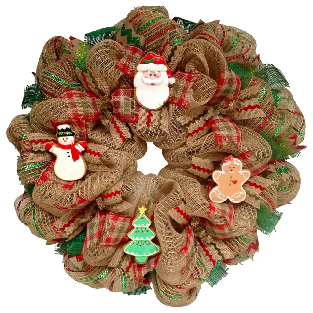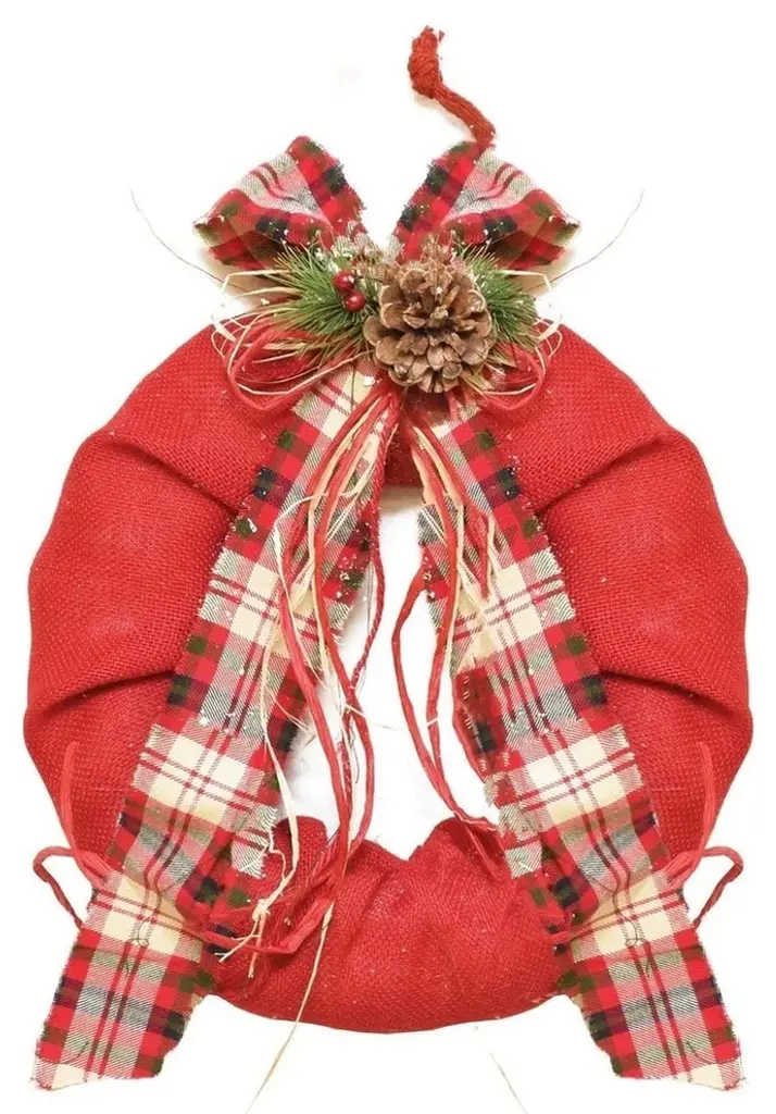 Add some country rustic charm and create a sense of coziness in your Christmas decor with this festive red burlap wreathFeatures a plaid bow at the top accented with pine berries and pine conesLightly dusted with glitter snowNo assembly required - wreath comes in 1 pieceFlat back foam baseComes ready-to-hang on a red cordRecommended for indoor useDimensions:Wreath: 4.5" high x 13" diameter (measured from outermost tip/edge to outermost tip/edge across the wreath)Overall when hanging: 19"H x 13"W x 4.5"DMaterial(s): Fabric/foam/plastic