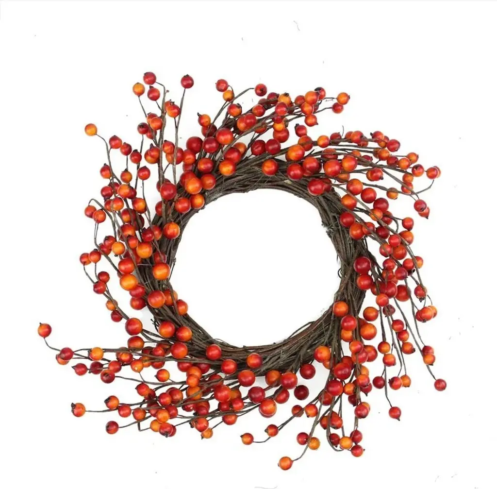 Add a festive touch to your fall decor with this orange and red berry wreathNo assembly required - wreath comes in 1 pieceNatural vine twig base for hangingRecommended for indoor useDimensions: 3.5" high x 14" diameter (measured from outermost tip/edge to outermost tip/edge across the wreath)Inner diameter: 6.5"Material(s): Twig/foam