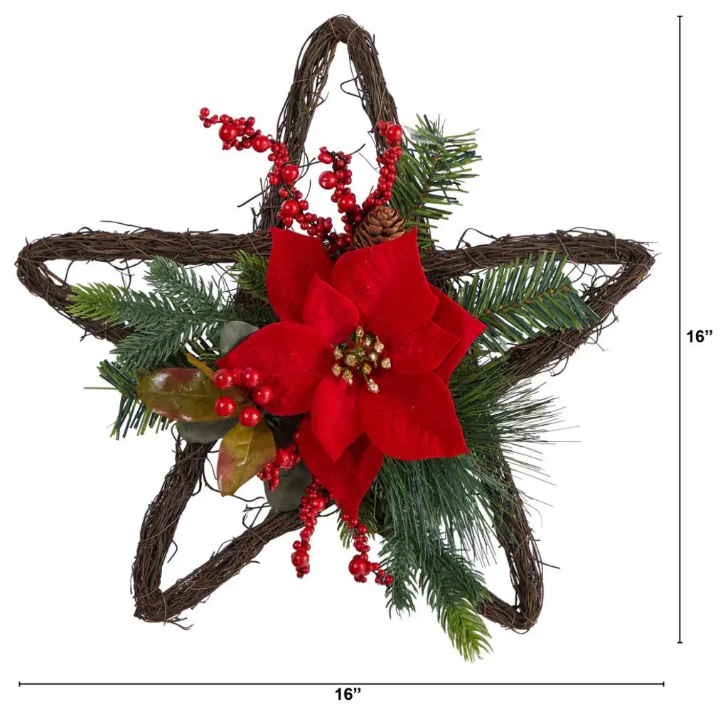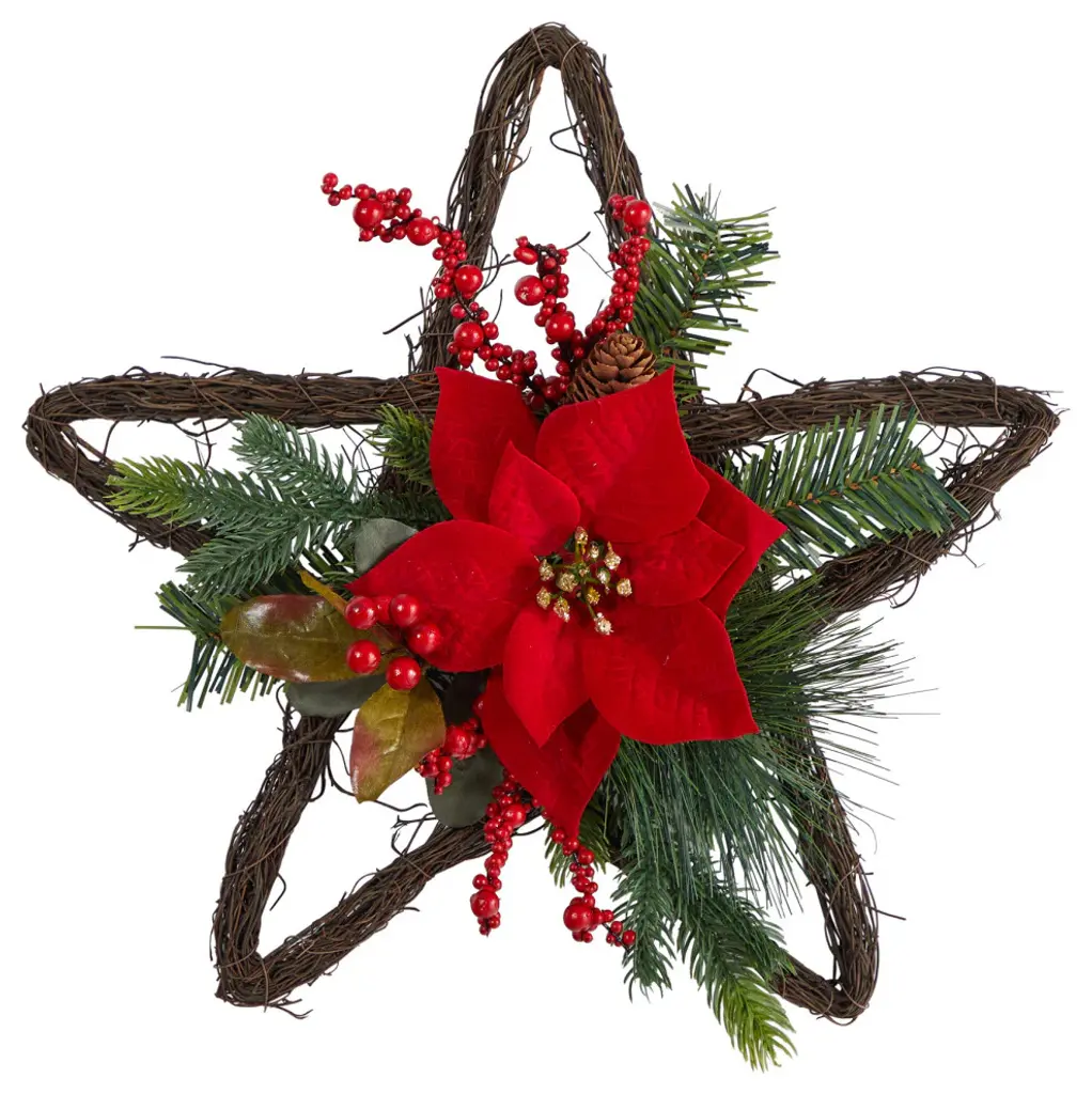Enhance your Christmas decoration with this Poinsettia, Berries and Pinecones Artificial Christmas Wreath with Star Shaped Twig Base. Twigs in a star shape have a Poinsettia in the center and are accented with pinecones and evergreen leaves. With a diameter of 16in. house in any compact area. Perfect for a tight space. Artificial wreaths are manufactured using synthetic materials, such as polyester material or plastic, and are well designed and constructed to be life-like in appearance. This item will need to be re-shaped when removed from the secure box to allow it to reach its fullest size. Your wreath will look beautiful for years to come; simply wipe clean with a soft dry cloth when needed.