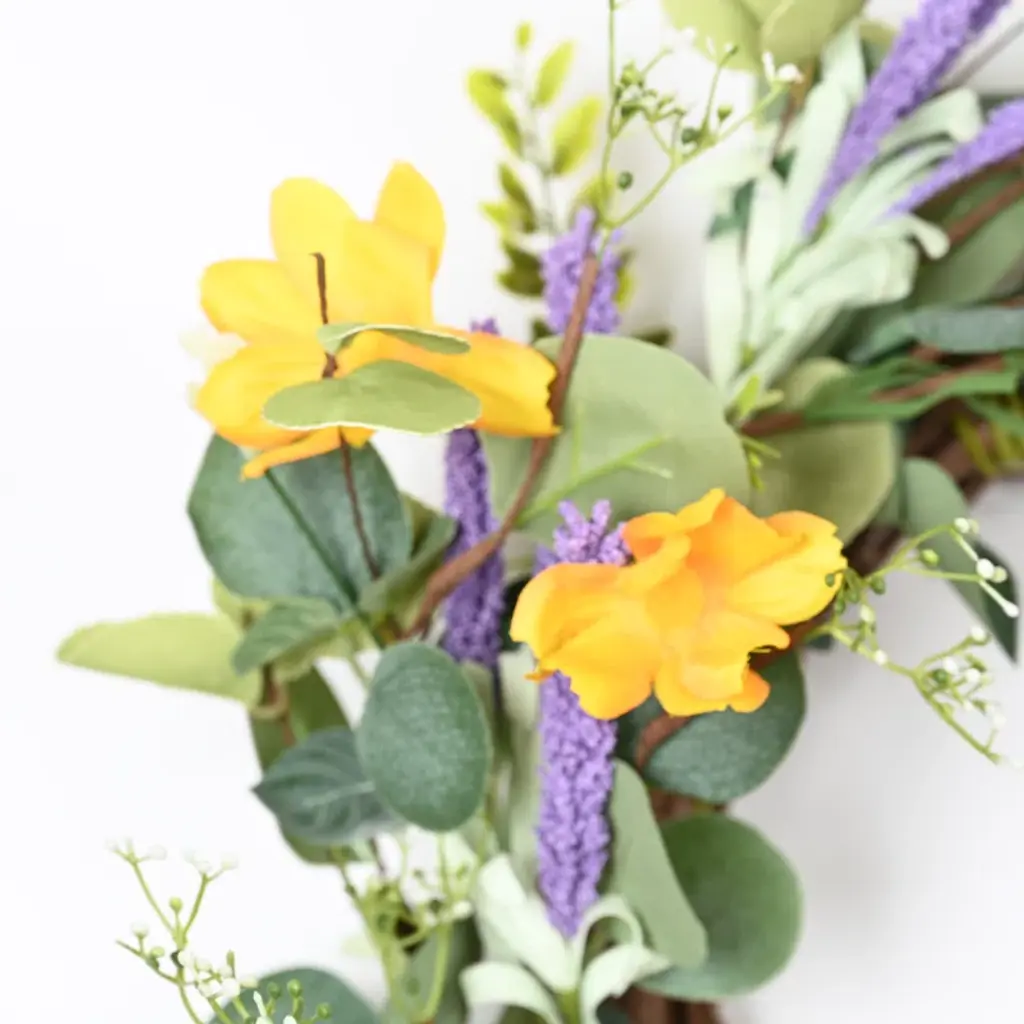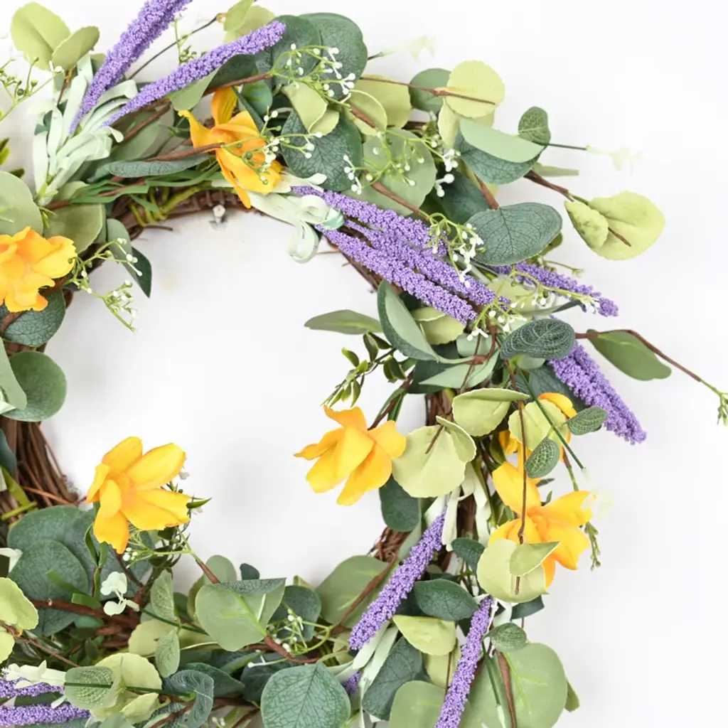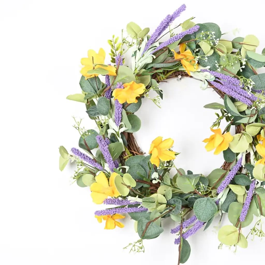 Welcome the beauty of spring and summer with the Artificial Eucalyptus Wildflower Berry Floral Wreath for your front door. Built on a rustic grapevine base, this wreath showcases lush eucalyptus leaves, vibrant yellow wildflowers, and pops of purple berries, creating a fresh, cheerful appearance. Its timeless, nature-inspired design is low-maintenance, making it a perfect seasonal addition for a welcoming entryway.