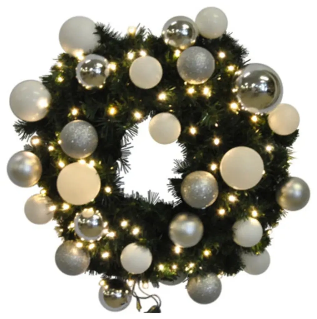 2'' Sequoia Wreath Decorated With The Arctic Ornament Collection Pre-Lit Warm White LedsThe stylish 24 Sequoia wreath is artfully crafted with Sequoia Pine Tips.(200 tips) Creating the utmost realism creating an eye-catching appeal, neighbors and customers will love for years to come! Lit with 70 LED Warm White lights and decorated in our elegant Arctic collection, this wreath is sure to add a touch of elegance to any space.