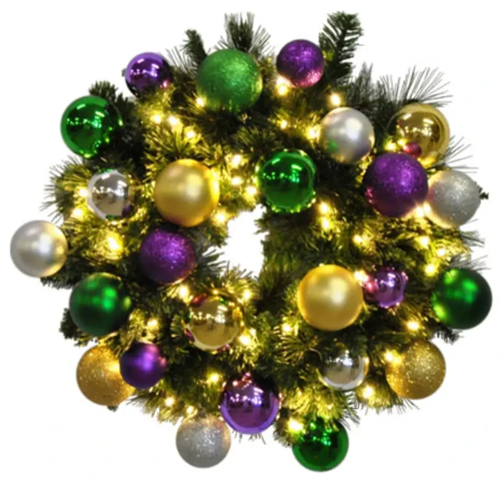 2'' Sequoia Wreath Decorated With The Mardi Gras Ornament Collection Pre-Lit Warm White LedsThe fashionable 24Sequoia wreath is artfully crafted with Sequoia tips. (200 tips) Creating the utmost realism and eye catching appeal, neighbors and customers will love this wreath for years to come. Lit with 70 LED Warm White lights and decorated with our classy Mardi Gras Collection. This wreath is sure to add class to any room.
