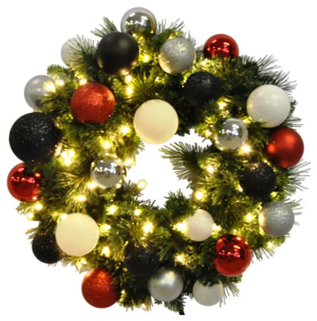 2'' Sequoia Wreath Decorated With The Red And Gold Ornament Collection Pre-Lit Warm White LedsThe popular 24" Sequoia wreath is artfully crafted with Sequoia tips.(200 Tips) Creating the utmost realism and eye catching appeal, neighbors and customers will love this wreath for years to come. Lit with 70 LED Warm White lights and decorated with our traditional Red and Gold Collection. This wreath is sure to be stunning in any room.