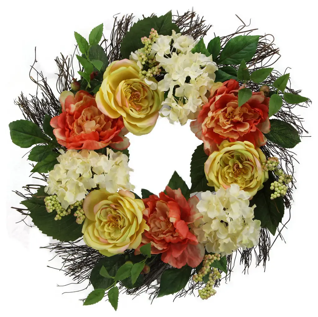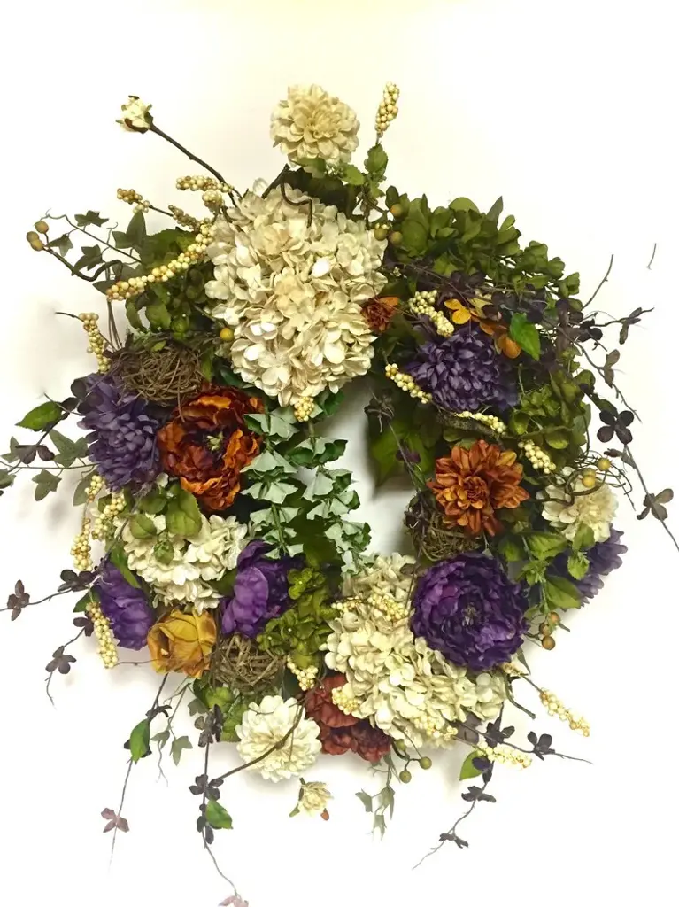 Hydrangeas not only make great centerpieces and show plants - they also make some of the finest wreaths around, as evidenced by this 20" beauty. Strong main stems form the base of the wreath, while an abundance of flowers, berries, blooms, and leaves elegantly wrap and twist around, making this one of the most beautiful (and visually interesting) wreaths you can purchase. Welcome spring right from your front door, or send one as a gift for that nature lover in your family.Dimensions: 20" Diameter x 4" DepthPlease note: Item will need to be re-shaped to full potential when removed from box.