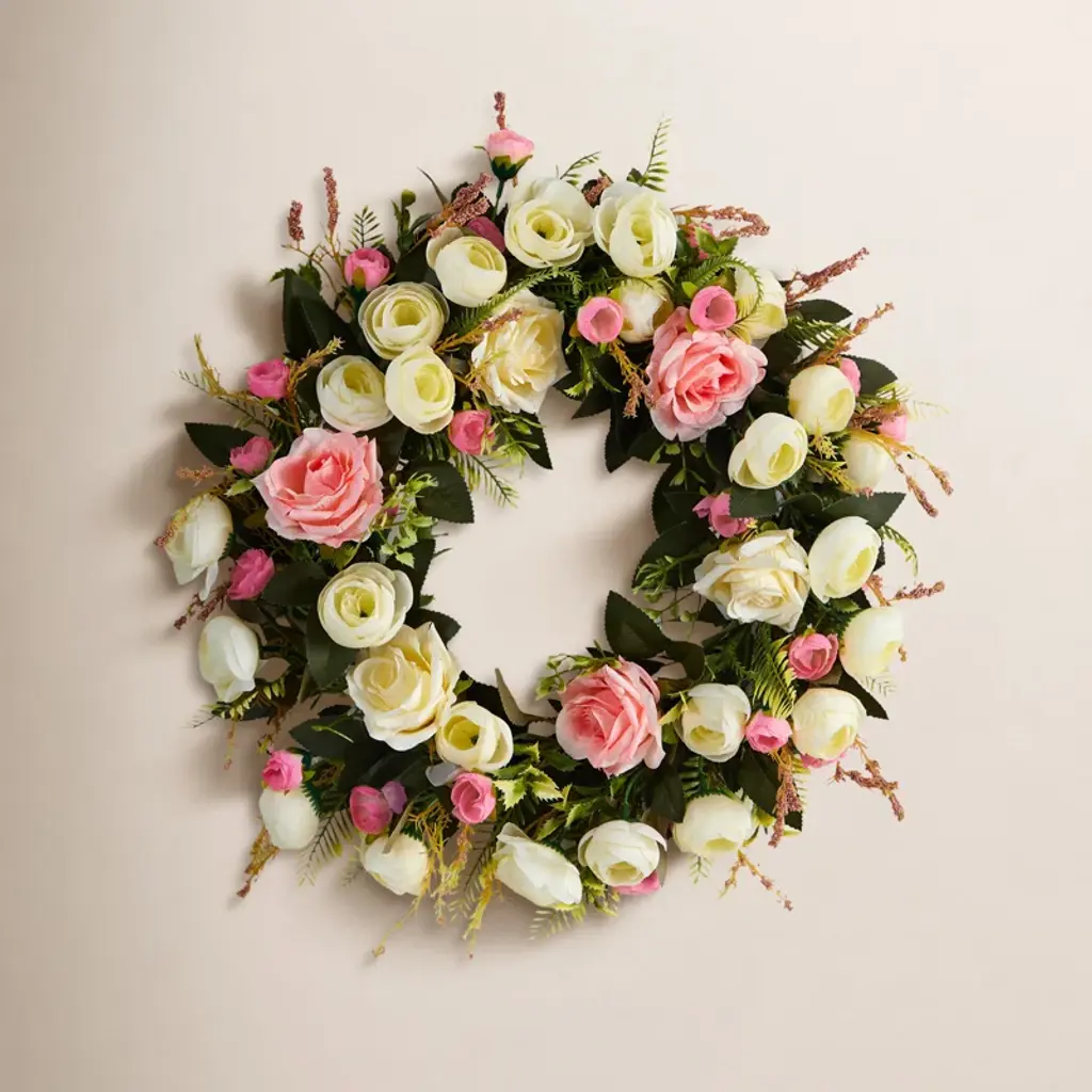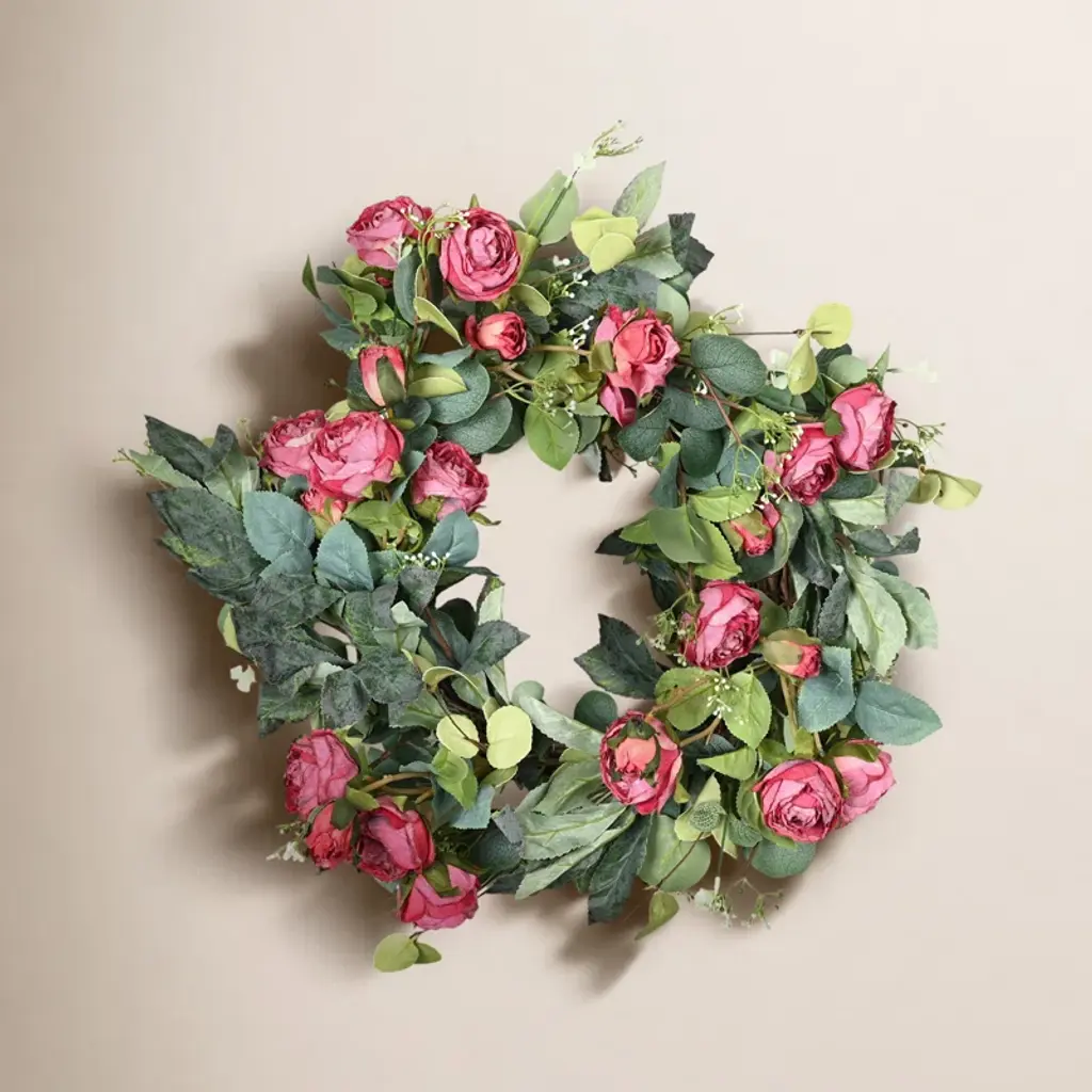 The rose is often seen as the ''perfectflower. One look at the full, lush blooms, and you can see why. Well, we''ve taken those perfect blooms and created this exquisite 20rose wreath that has to be seen to be believed. Full rose blooms circle round'', while the leaves and stems provide the ideal backdrop. It''s a mixture of bold color and ''wild vibrancythat is sure to please even the most discerning eye.