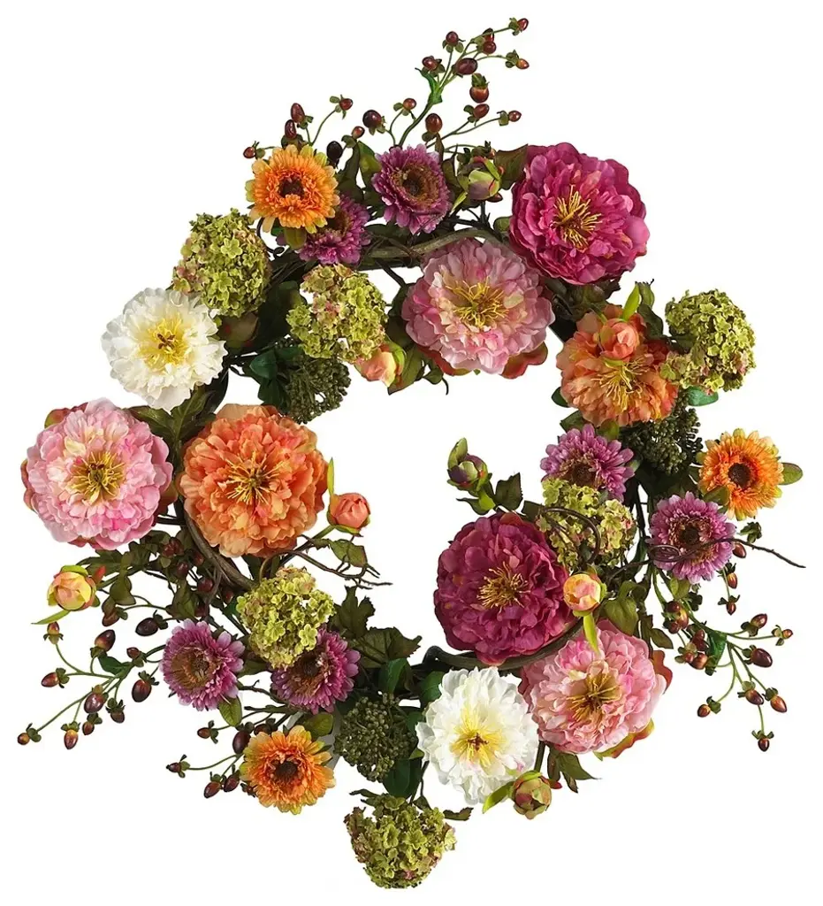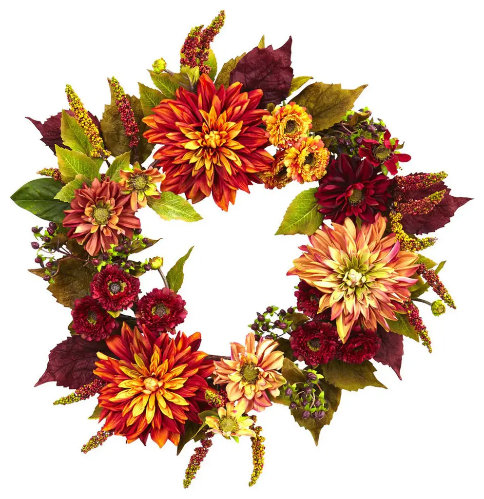 Celebrate Autumn''s beauty with this striking, bold 22 inch Wreath. Featuring Mums and Dahlia''s interwoven with colorful leaves and blooms, this classic fall wreath will brighten up any room, no matter the season. Best of all, it will never dry out or need any care, and will look great, year after year. Buy one for yourself, and one as a gift.