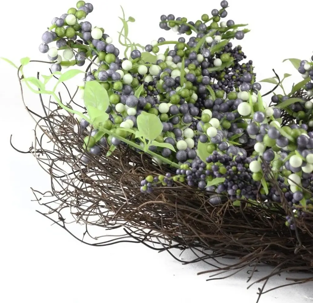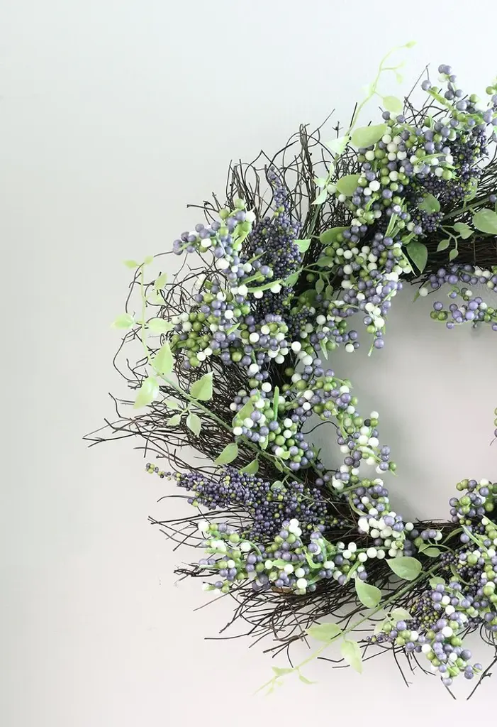 Plum colored purple berries mixed with white berries will give a springtime feel to your decor 1 piece design, no assembly required Ready-to-hang on a twig and vine mixed wreath Recommended for indoor use Dimensions: 22" outer diameter (measured from outermost tip to outermost tip) 10" inner diameter Material(s): PE/twig/wire/foam