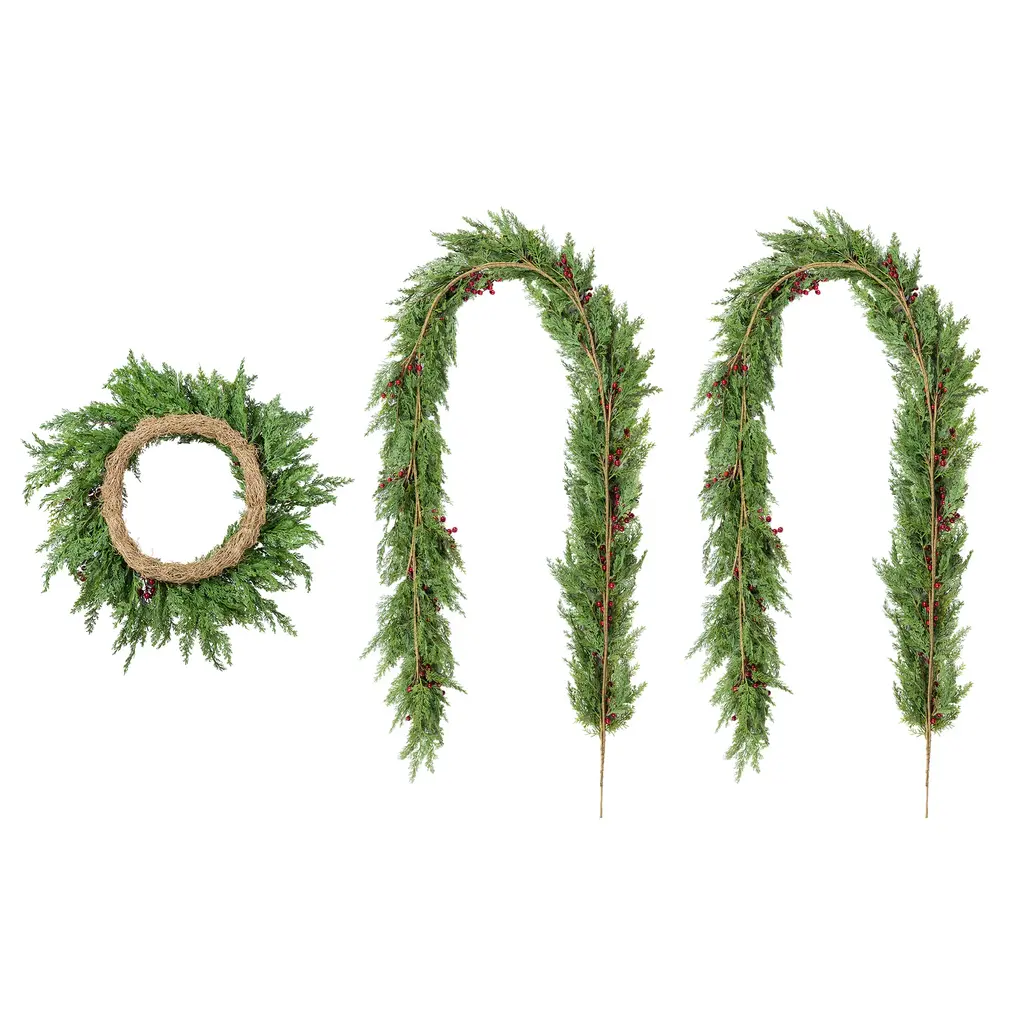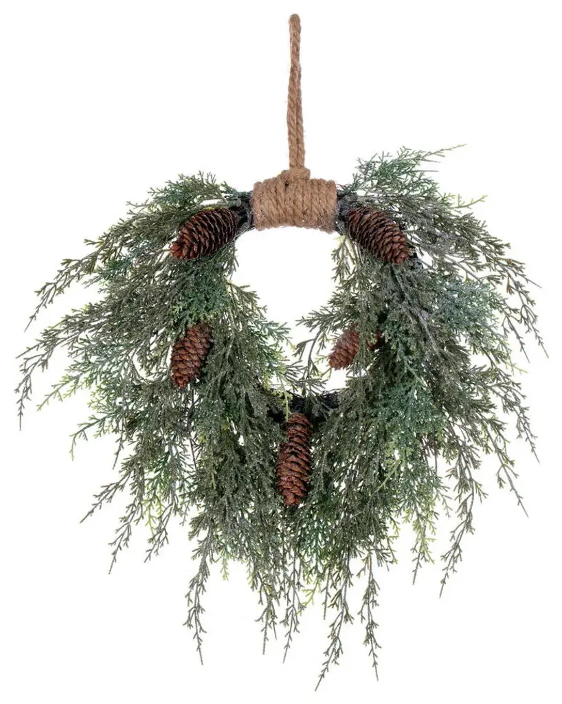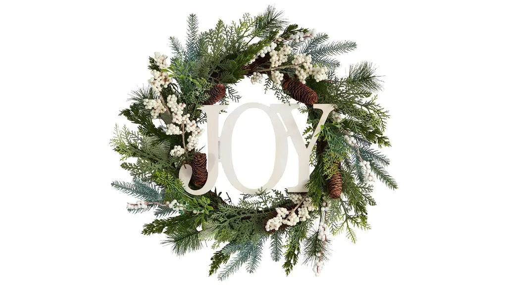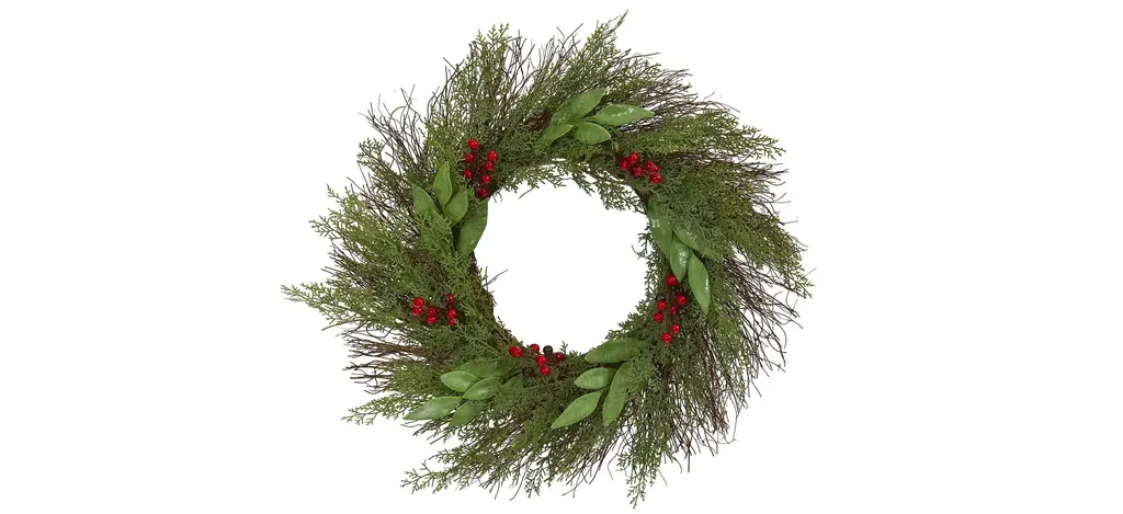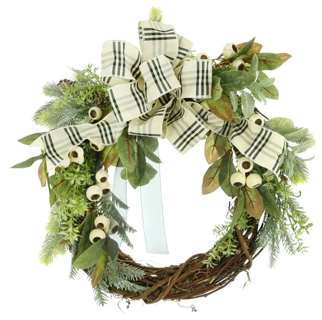 Give your home a festive feel with this beautiful, handmade artificial wreath. Expertly crafted in the USA, this delightful creation is sure to impress. This grapevine wreath is adorned with a mix of lush evergreen, tea leaves, and white berries with a classic white and black plaid bow. Maintenance free, it arrives ready to be displayed indoors or outdoors on a protected covered porch.