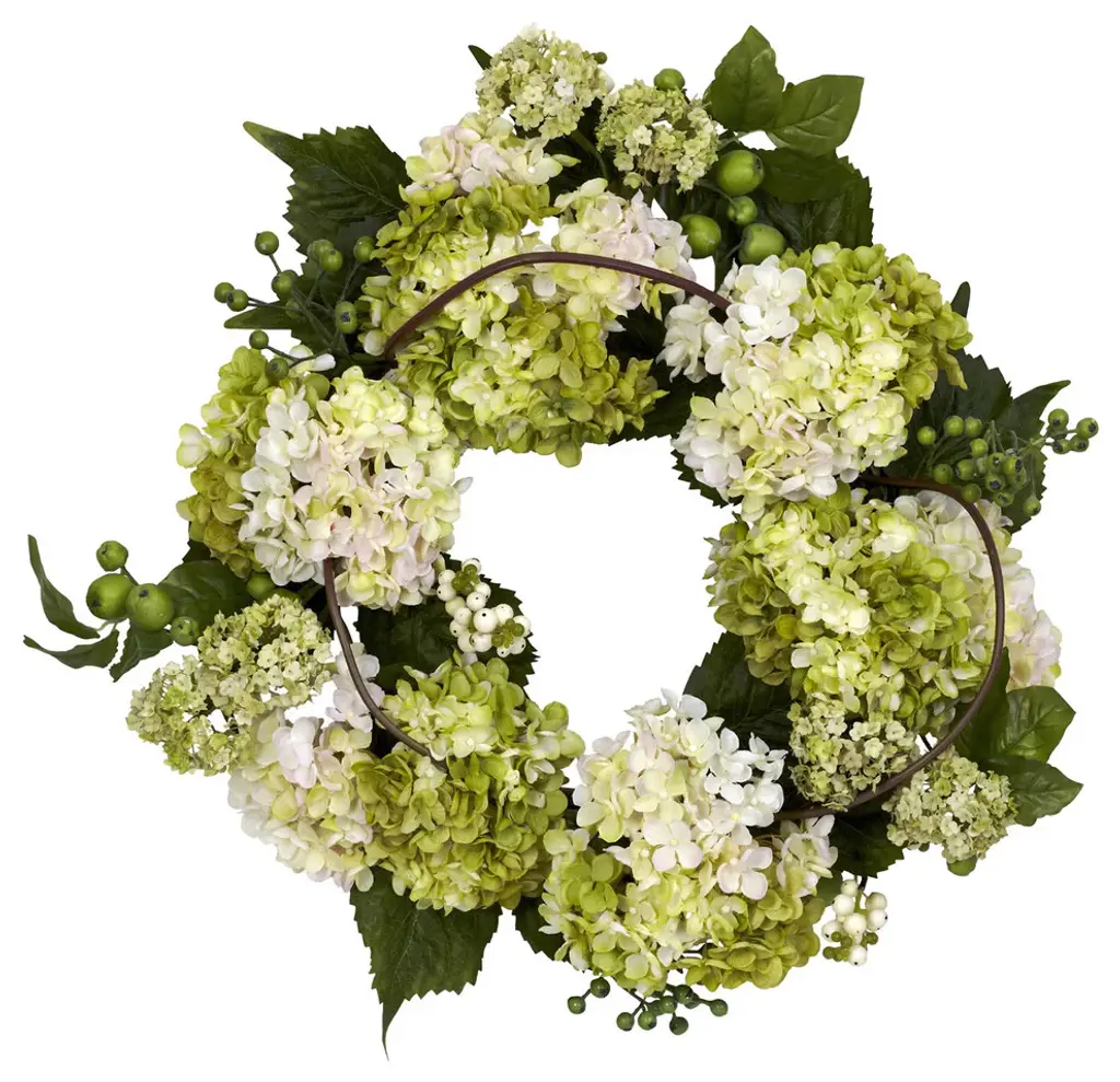 Like Hydrangea but prefer the lighter hues? Then this 22wreath is exactly what your decor is looking for. With several of the ''lighter shades of bloomentwined in a circle with stems, leaves, and berries, this lovely wreath makes for a superb accent piece that won''t overwhelm your other decor. Plus, the beauty will last a lifetime with minimal care (just hit it with the duster every now and again.)