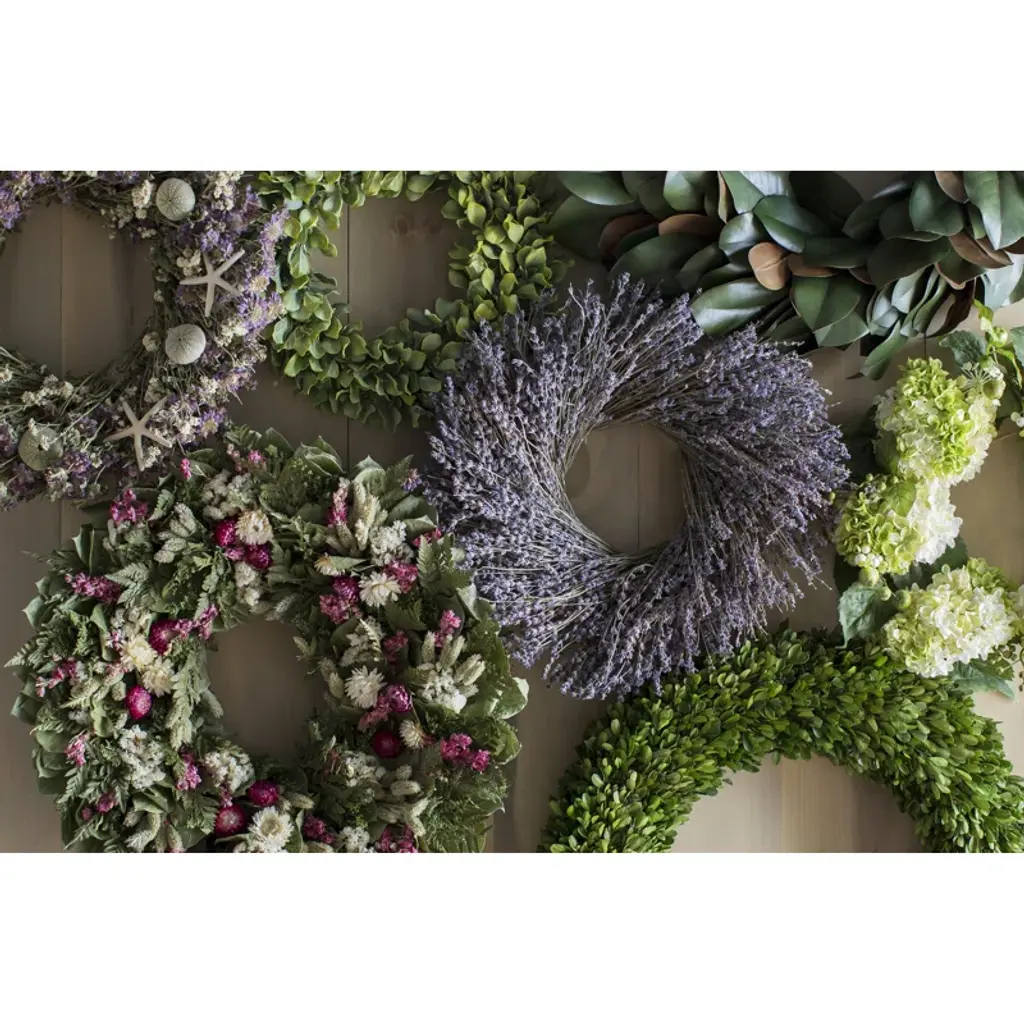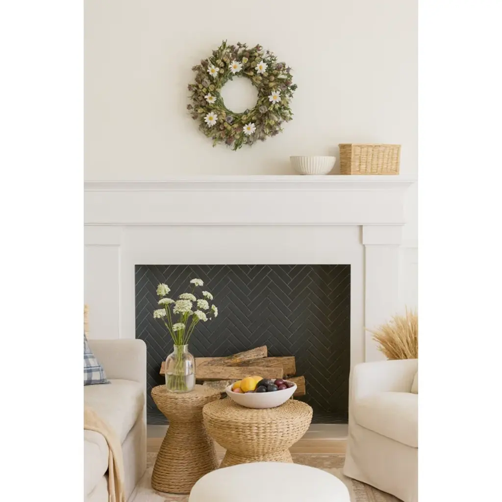Elegant spring feels wreath made up of all naturally dried components and silk daisies. Beautiful to hang indoors or in a protected outdoor location.