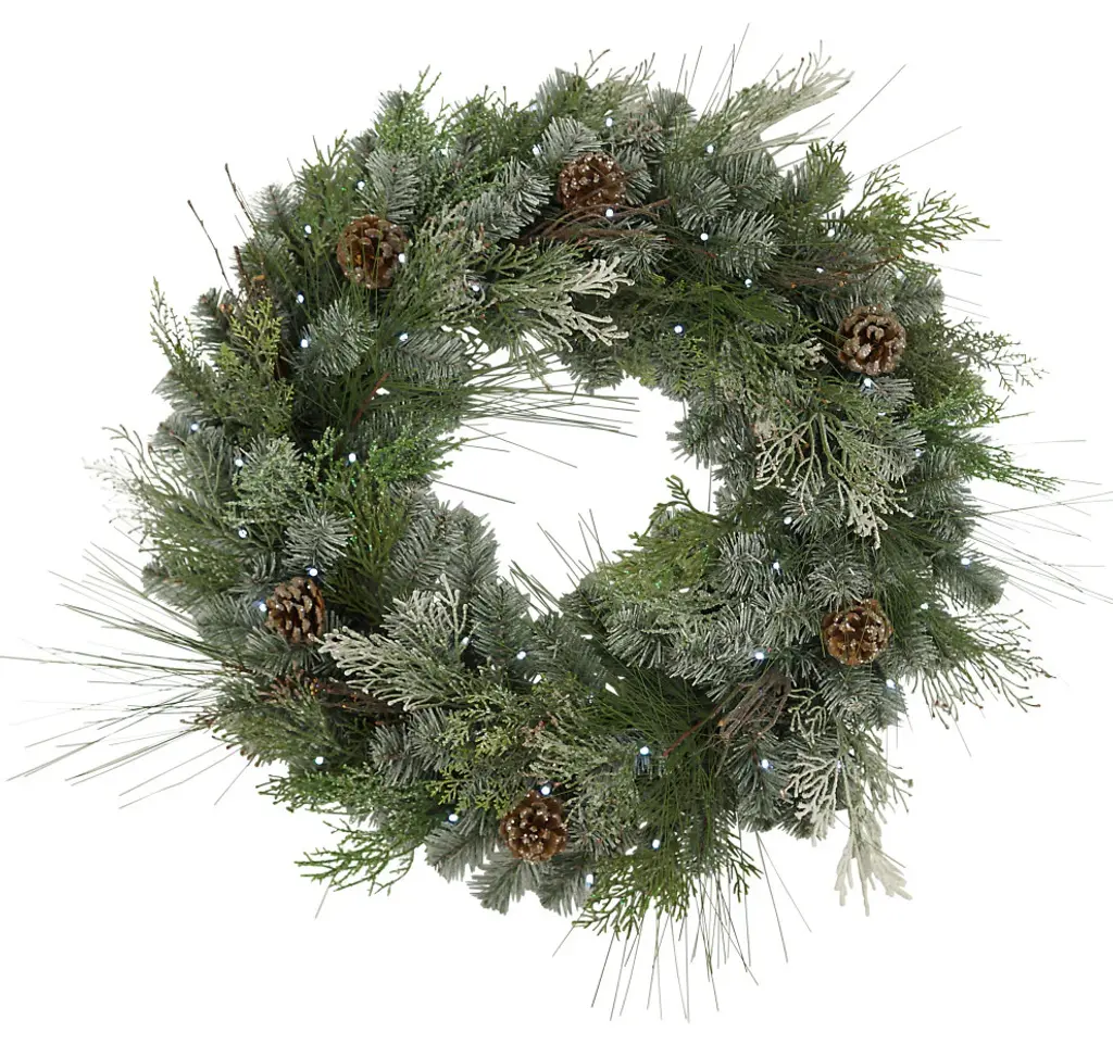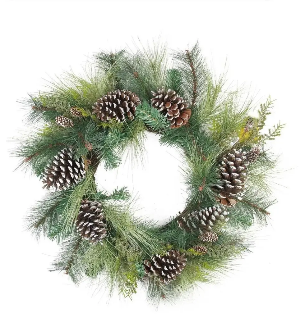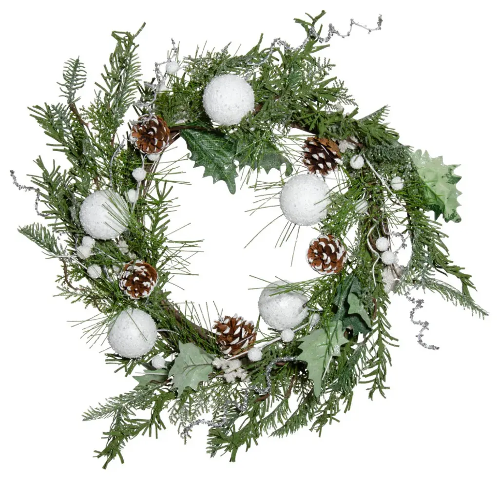 This lightly frosted wreath is elegantly simple and features blueberries | silver glitter accented pine cones and ice twigs placed among mixed pine making it a wonderful addition to your holiday decor | Unlit | Comes ready-to-hang on a metal frame | Recommended for indoor use | Dimensions: 8" high x 24" diameter | Material(s): plastic/foam/pine cone/twig