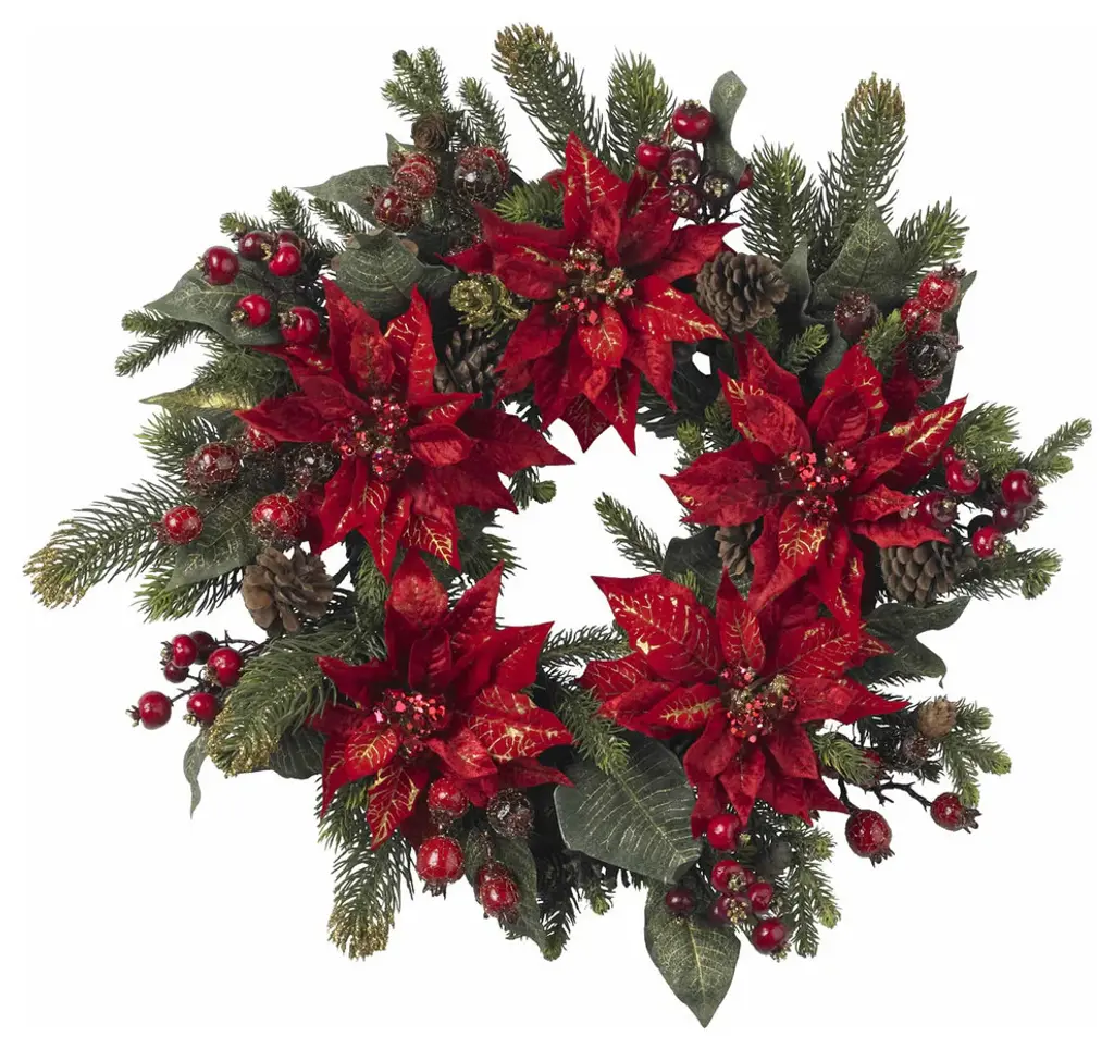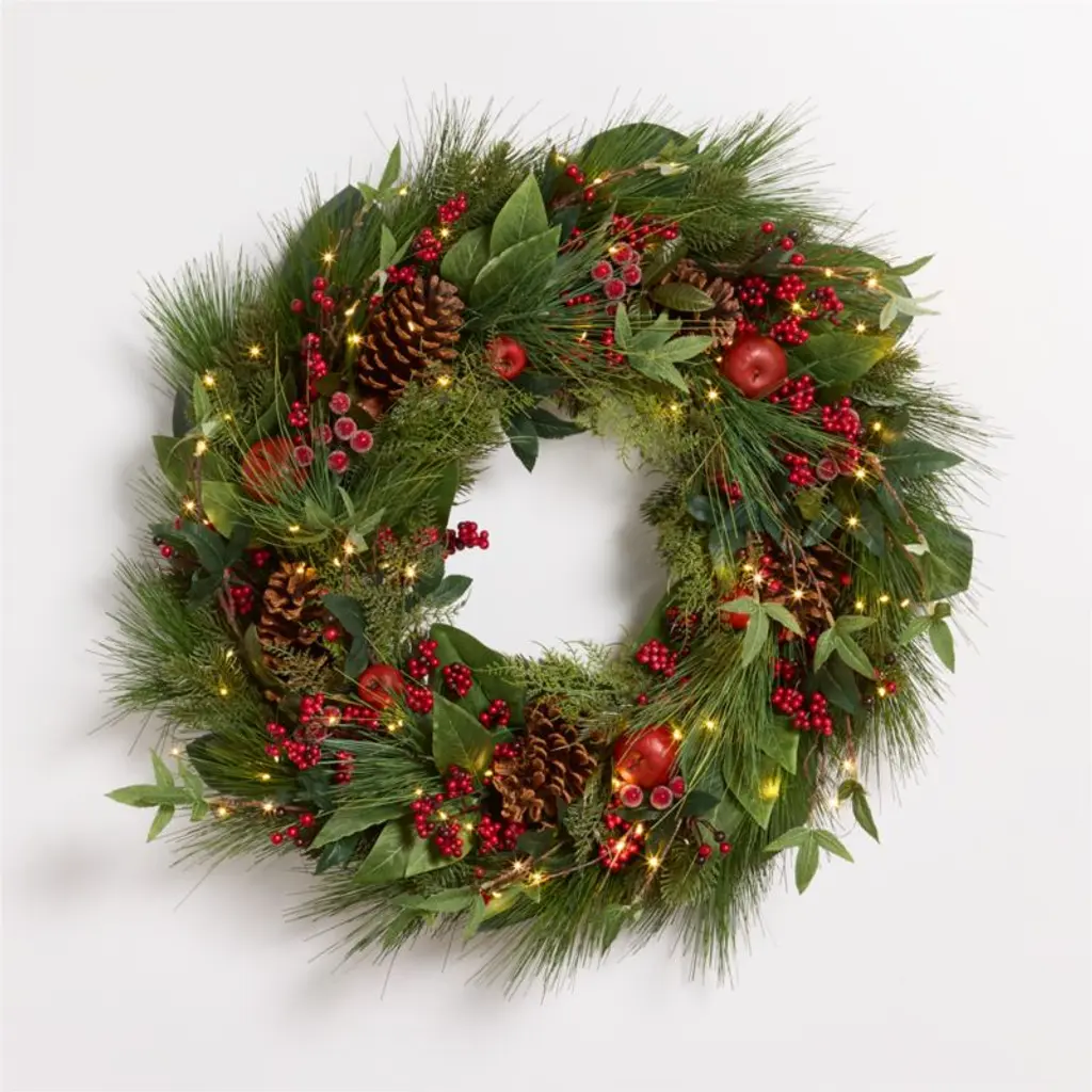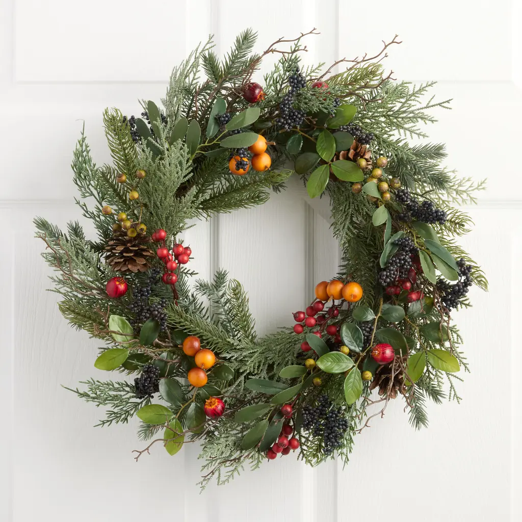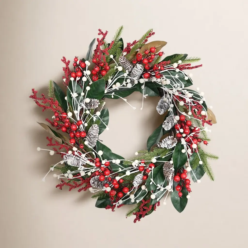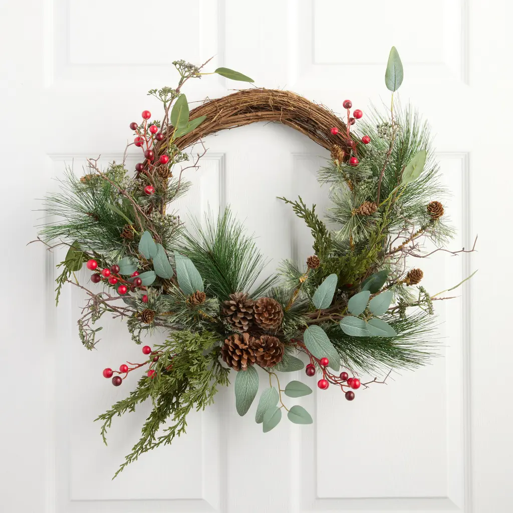 Bursting with unique berries | nuts and pine cones over a mixed pine base | this wreath is perfect for Thanksgiving | Halloween or autumn in general | Features red berries | pomegranates | blackberries | pine cones and several clusters of walnuts | No assembly required "? wreath comes in 1 piece | Natural vine twig base for hanging | Recommended for indoor use | Dimensions: 5"H x 24"D (measured from outermost tip/edge to outermost tip/edge across the wreath) | Material(s): plastic/pine cone/foam/wire
