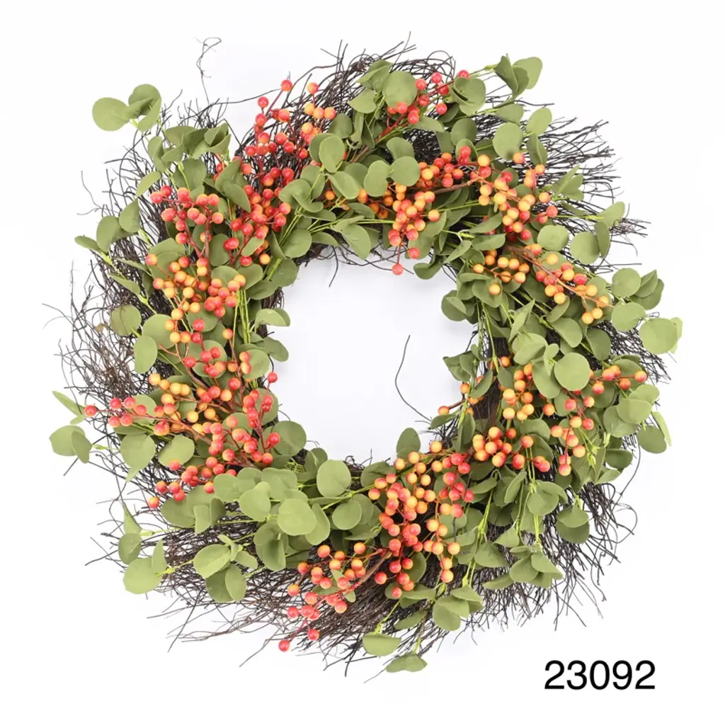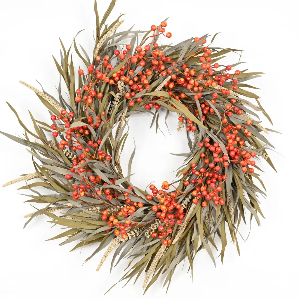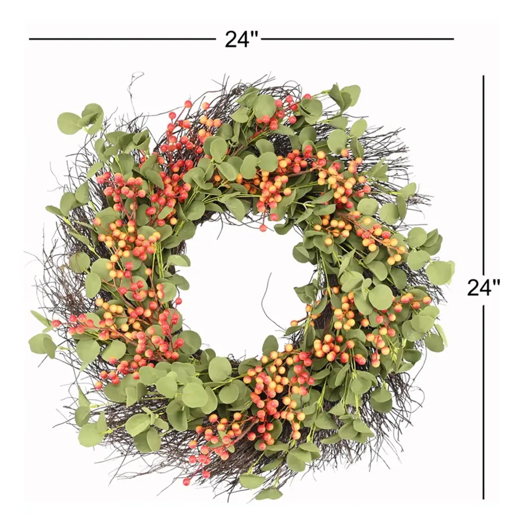 Elevate your home decor with our lifelike Eucalyptus Fall Berry Front Door Wreath. Its lush green Eucalyptus base and vibrant orange berry accents create a captivating display that truly embodies the essence of the season. Perfect for any occasion and season, this wreath effortlessly adds a touch of natural beauty and versatility to your space. Meticulously crafted, this wreath exudes a fresh and vibrant ambiance that welcomes guests with its vivid charm. Hang it on your front door to make a striking first impression or use it as a centerpiece to enhance your indoor gatherings. Crafted from high-quality materials, it guarantees durability for long-lasting enjoyment.