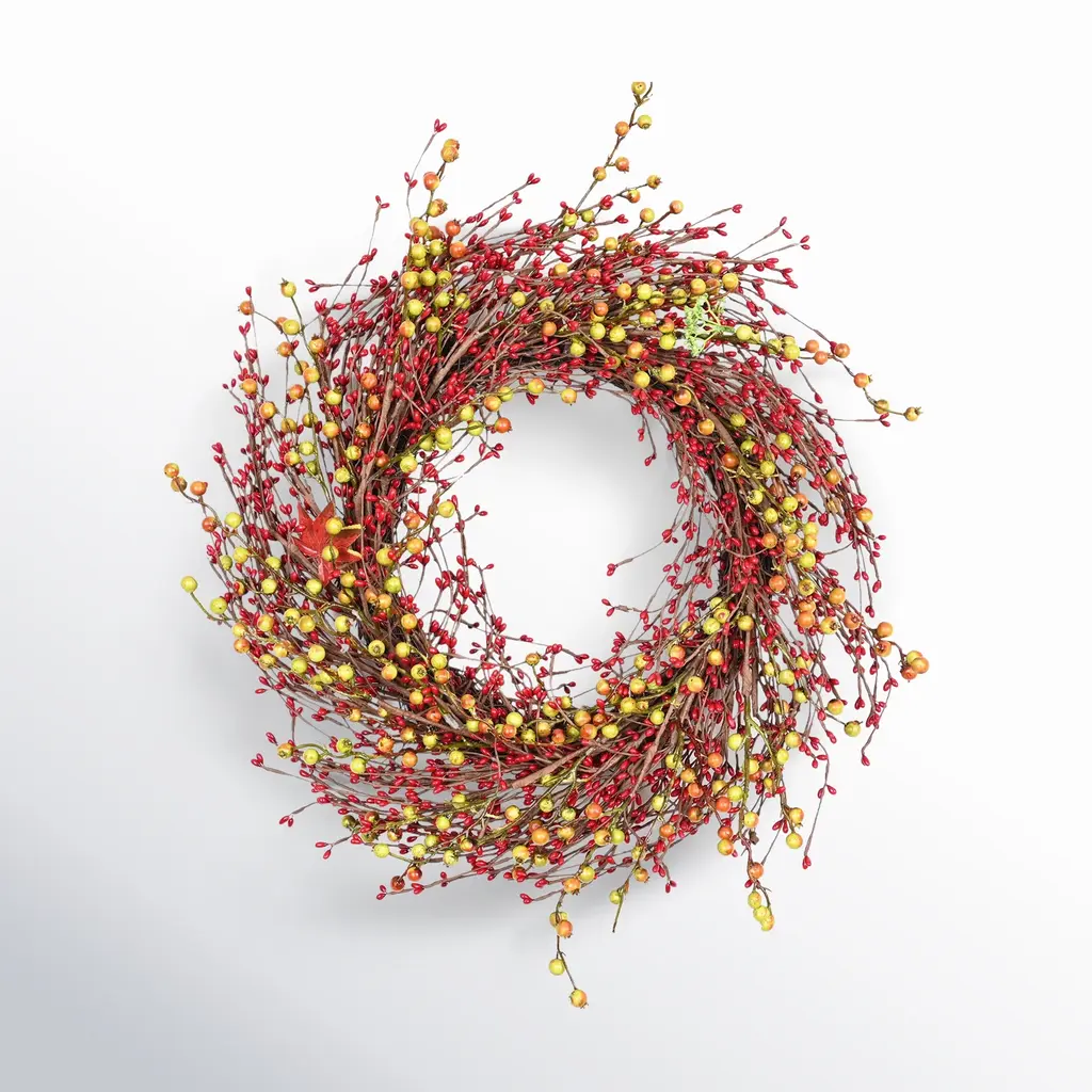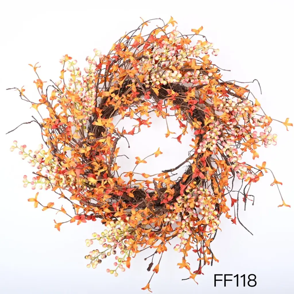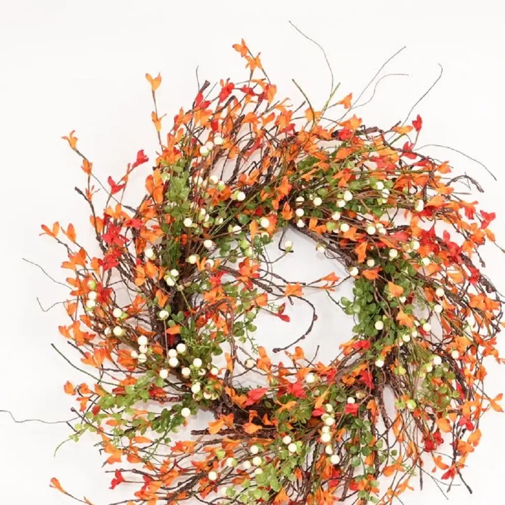 Embrace the spirit of the season with this Fall Autumn Twig Berry Front Door Wreath, and infuse your home or event with beauty, warmth, and style. Crafted on a sturdy grapevine base, this wreath features vibrant orange wildflowers adorned with delicate pink berry accents, creating a stunning visual display that radiates festive cheer. Elevate the ambiance of any space with this versatile wreath, whether adorning your front door to welcome guests or adding a touch of elegance to wedding party decorations. The warm tones of autumn and the soft blush of pink blend seamlessly to evoke a sense of celebration and joy.