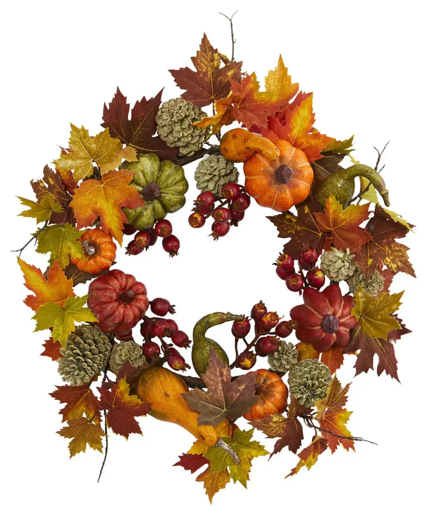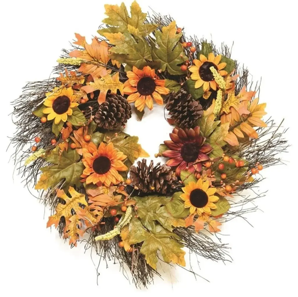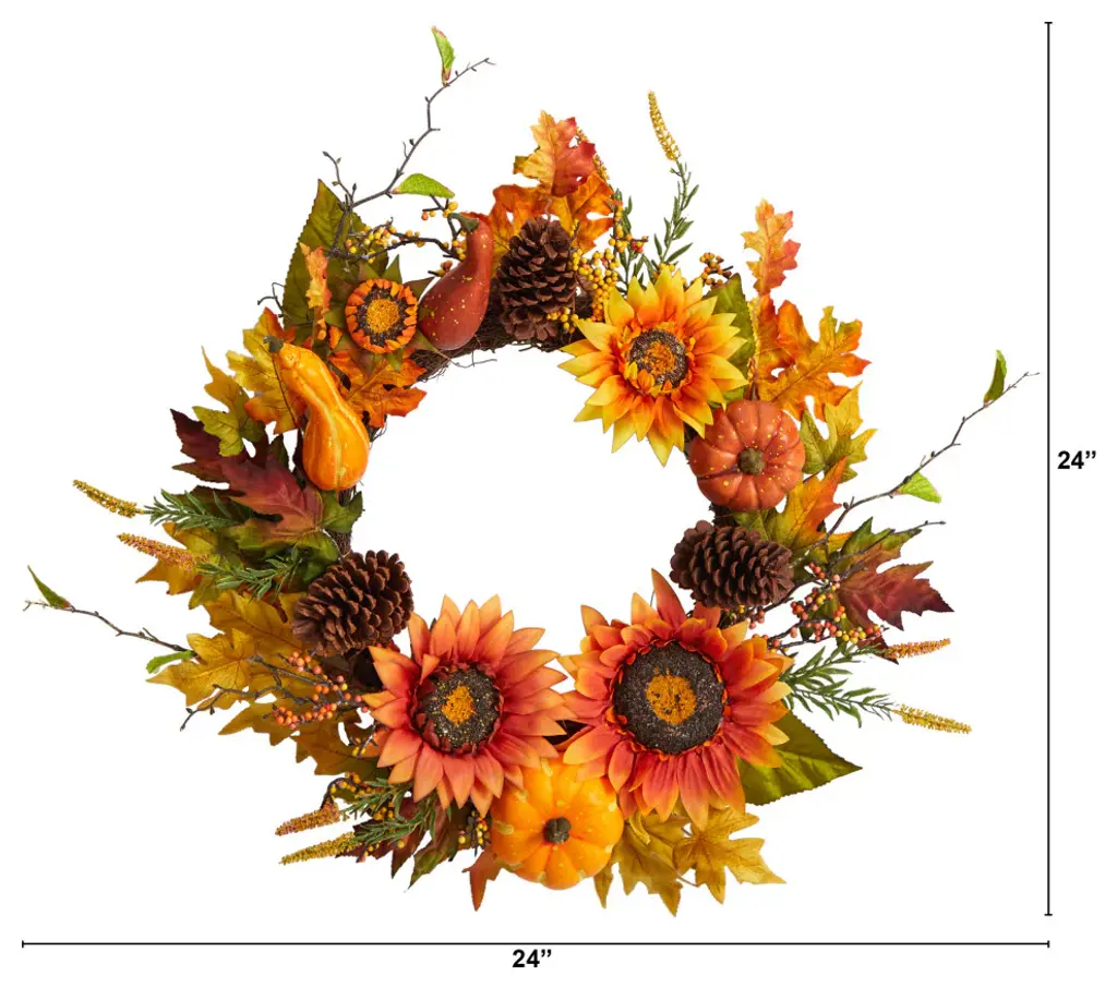 24" Fall Sunflower, Pumpkin, Gourds, Pinecone & Berries Autumn Artificial Wreath