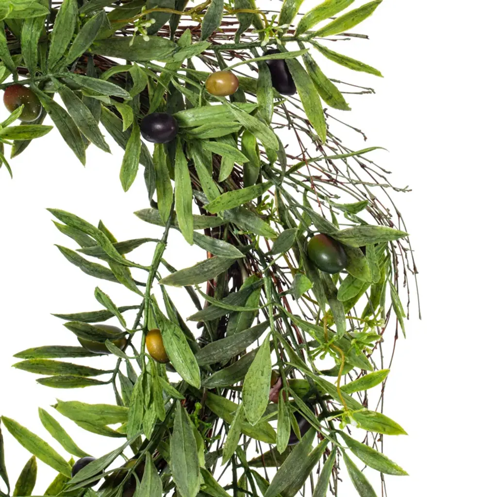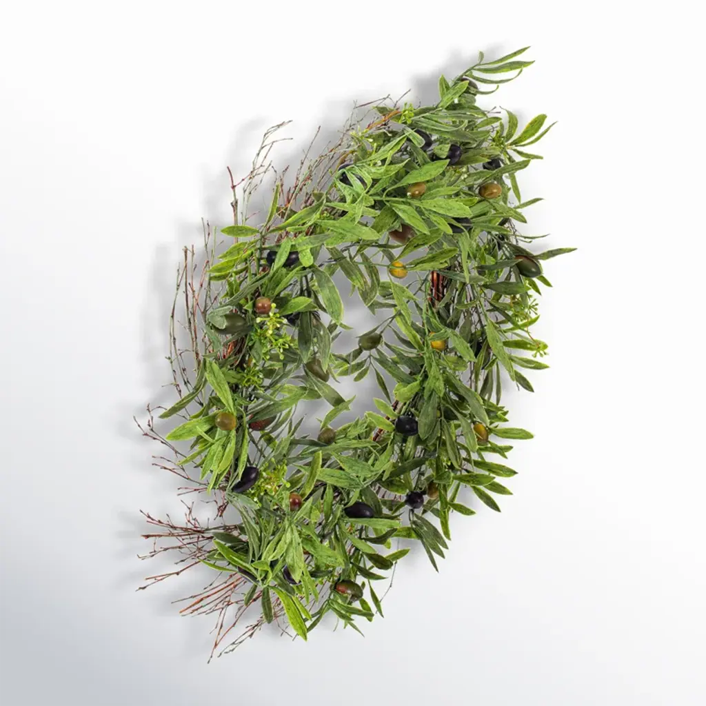24" Artificial Green Olive Leaf Wreath. Bring the warm feeling of the Mediterranean into your home with 24-inch Green Faux Olive Leaf Wreath. This realistic faux wreath is perfect for adding a touch of greenery to your decor. Use it for wall decorations, over your mantel, or in any other room in your home to bring the outdoors inside. Perfect for indoor use, this maintenance-free faux wreath is easy to keep looking fresh with just a quick wipe of a dry cloth. Whether you'd like to add a touch of nature to your living room, bedroom, or office, this faux olive plant is the perfect choice for your plant decor.